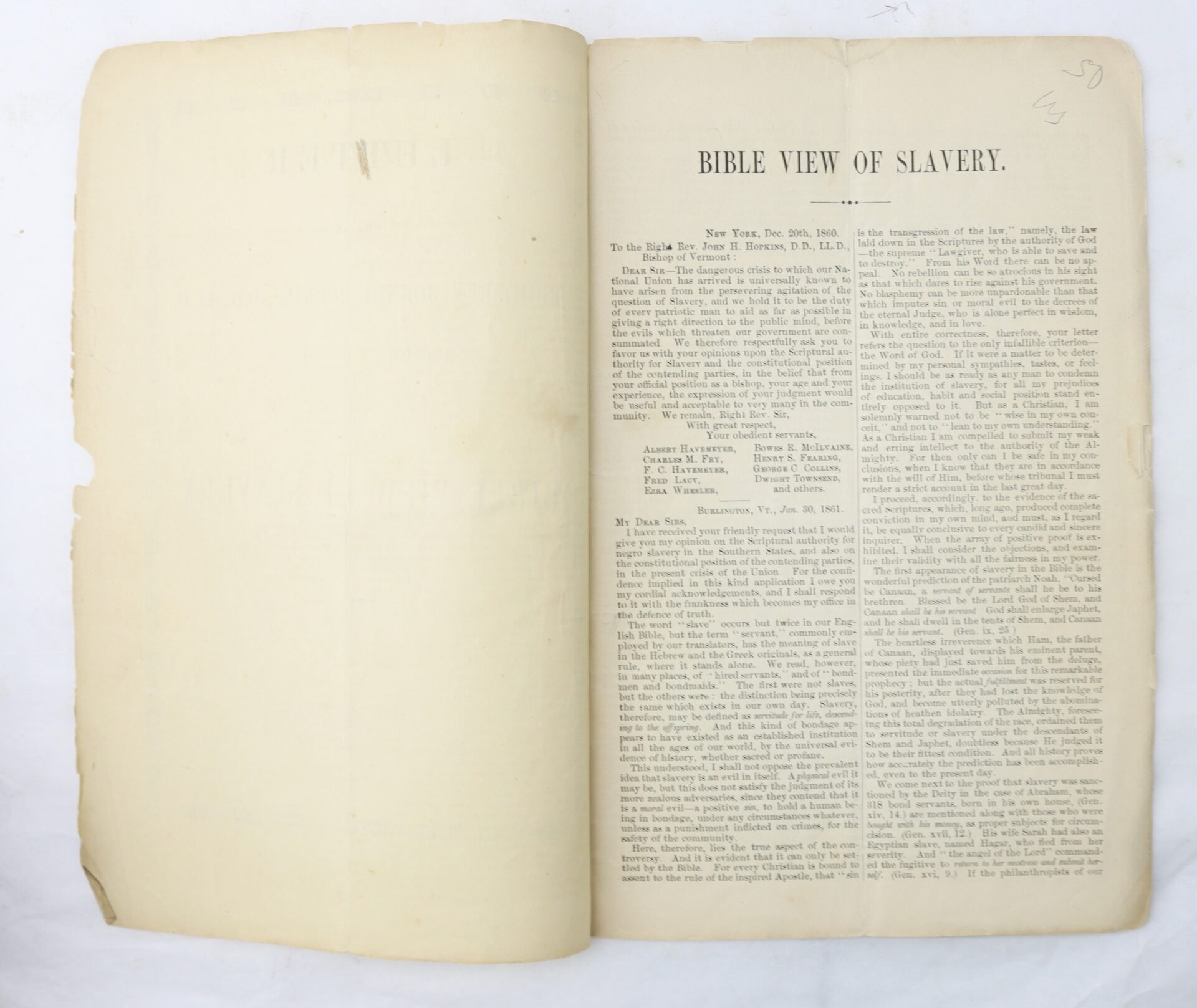 1861 Pamphlet – “Letter from the Right Rev. John H. Hopkins, D.D., LL.D., Bishop of Vermont, on the Bible View of Slavery”