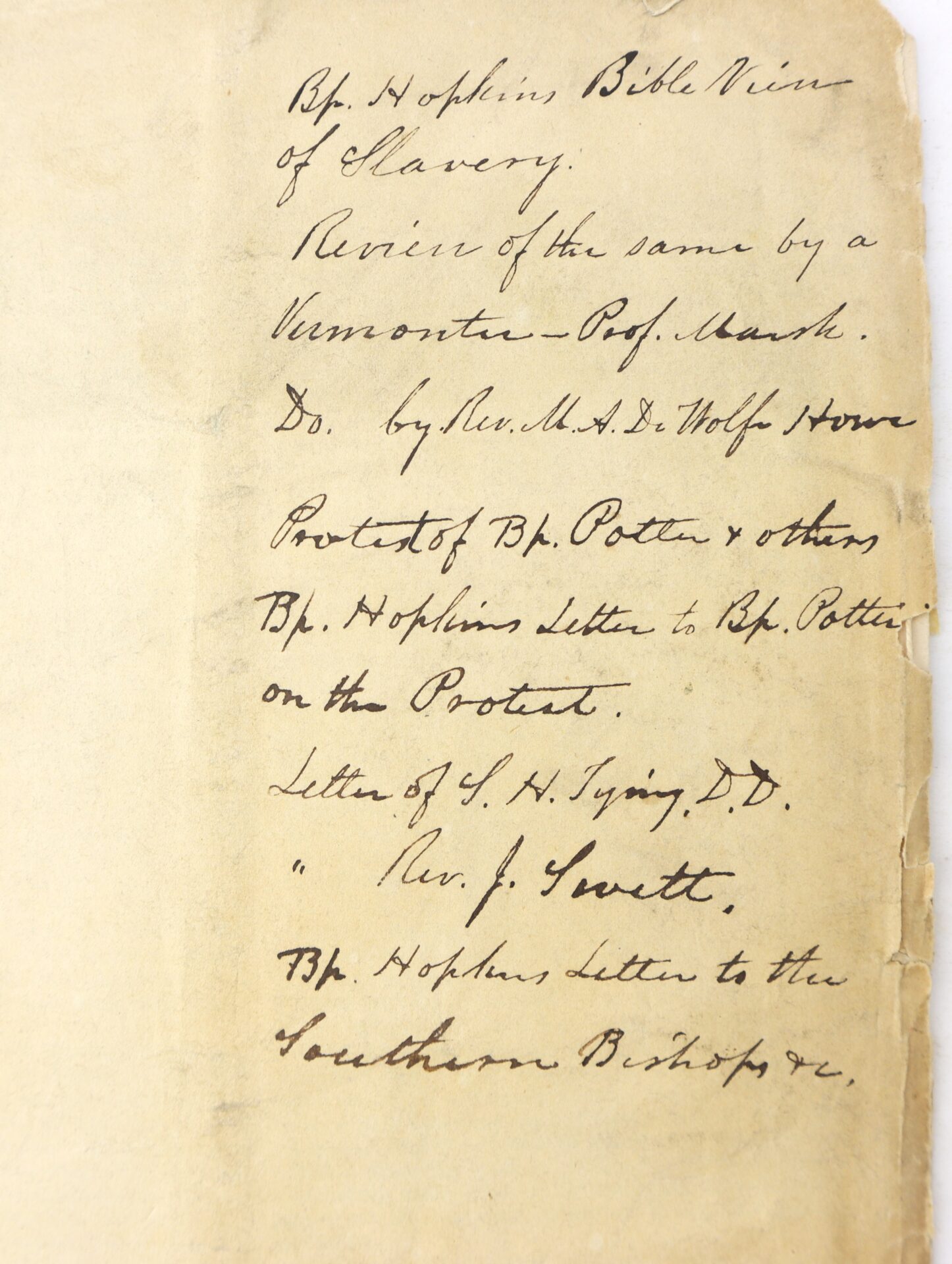 “Bp. Hopkins Bible View of Slavery. Review of the same by a Vermonter – Prof. Marsh. Do. by Rev. M.A. De Wolfe Howe. Protest of Bp. Potter & others. Bp. Hopkins letter to Bp. Potter on the Protest. Letter of S.H. Tyng, D.D. ‘Rev. J. Sewett.’ Bp. Hopkins letter to the Southern Bishops &c.”
