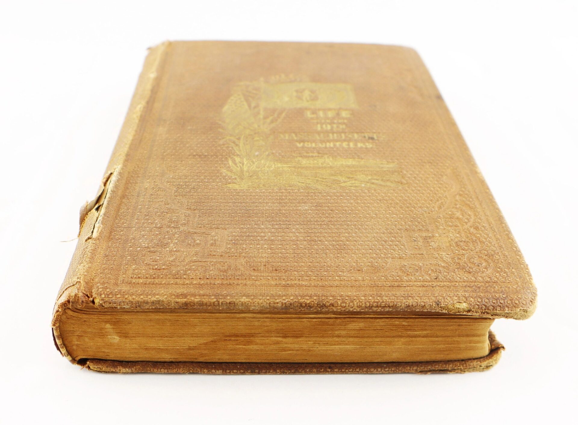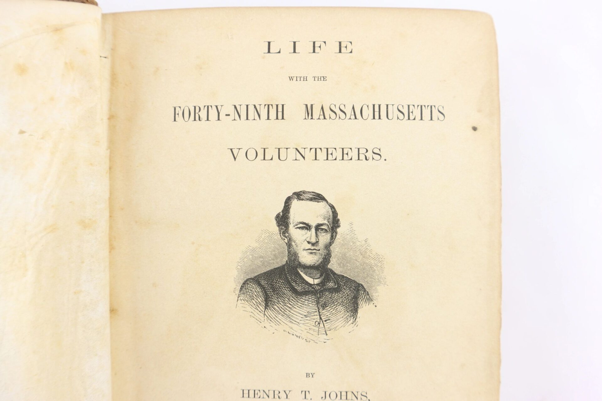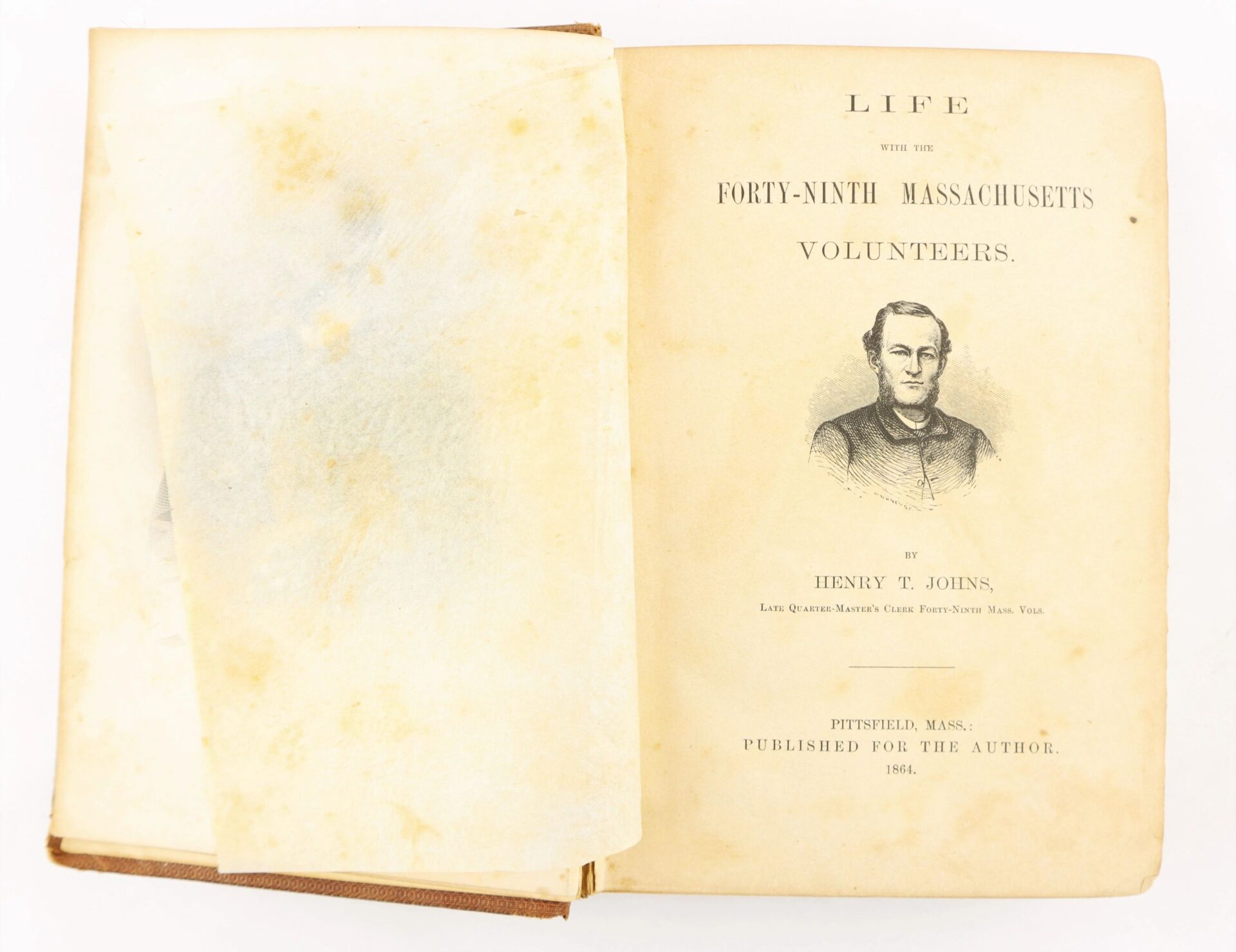 1864 edition Life with the 49th Massachusetts Volunteers by Henry T. Johns, and published in Pittsfield, Massachusetts. Hardbound 391 pages with some edge wear and foxing. Henry T. Johns served with the 9-month 49th Massachusetts at Port Hudson, Louisiana, and was awarded the Medal of Honor for his actions there on May 27, 1863. The front page is signed by Chauncey E. Adams, who is listed as a paper maker in the 1860 census but is not on any Civil War rosters. The book contains great content on the battle and includes numerous illustrations of regimental officers.  Henry T. Johns – Residence Hinsdale MA; a 34-year-old Minister. Enlisted on 9/11/1862 as a Private. On 9/19/1862 he mustered into “C” Co. MA 49th Infantry. He was Mustered Out on 9/1/1863 at Pittsfield, MA. On 9/12/1864 he mustered into “A” Co. MA 61st Infantry. He was Mustered Out on 6/4/1865.  (Residence listed as “Pittsfield, MA”; Occupation listed as “Author”) He was listed as: Wounded 5/25/1863 Port Hudson, LA. Promotions: 2nd Lieut. 9/6/1864. 1st Lieut. 1/15/1865. Capt. 4/9/1865 by Brevet. Intra Regimental Company Transfers: 2/4/1865 from company A to company C. Other Information: Born 4/8/1828 in Philadelphia, PA. Died 5/13/1909 in Glendale, CA. Buried: Mountain View Cemetery, Oakland, CA. (Wife: Martha). Medal of Honor Information: He was awarded the Medal of Honor for action on 5/27/1863 at Port Hudson, LA. (Volunteered to take part in movement upon enemy’s works under heavy fire).