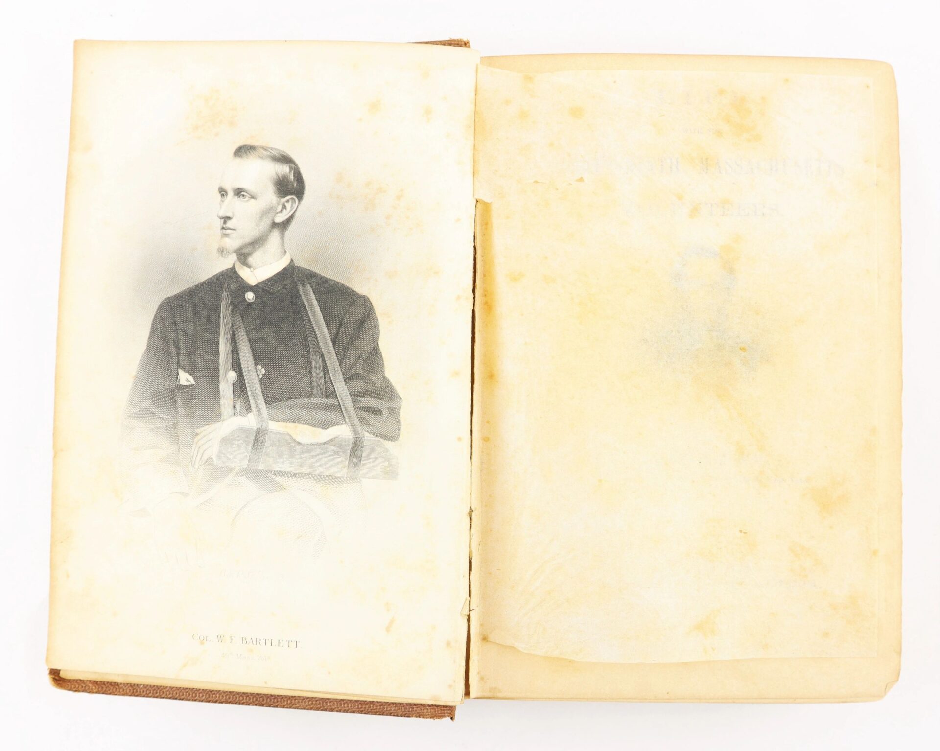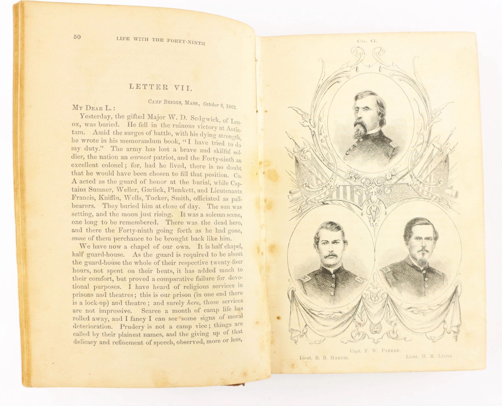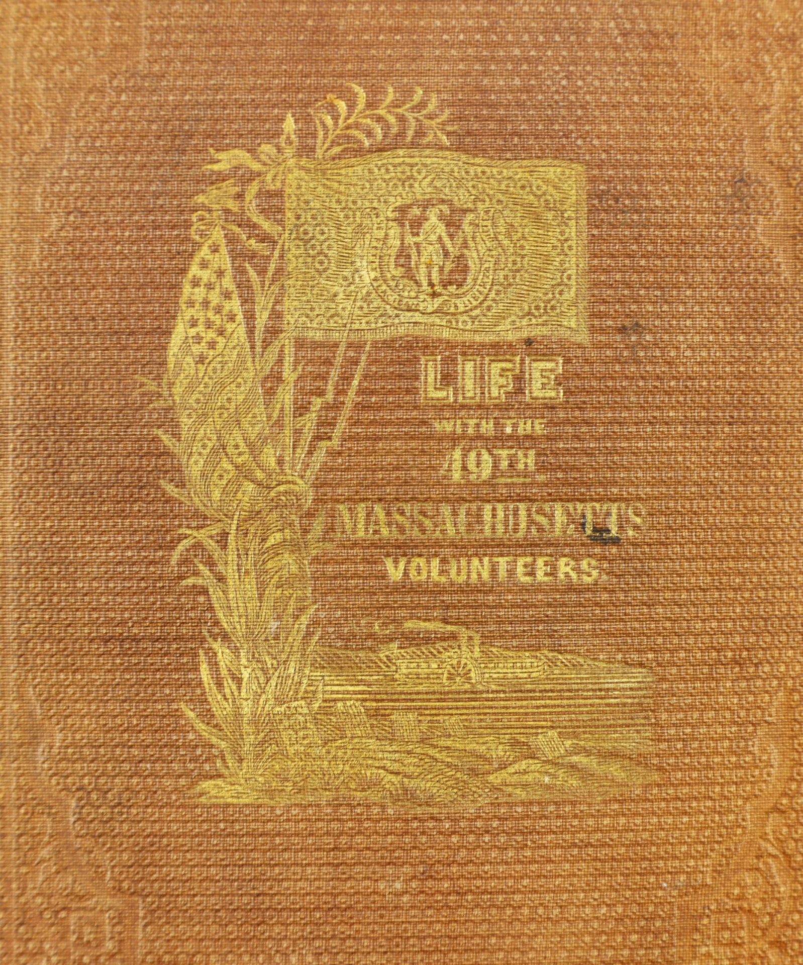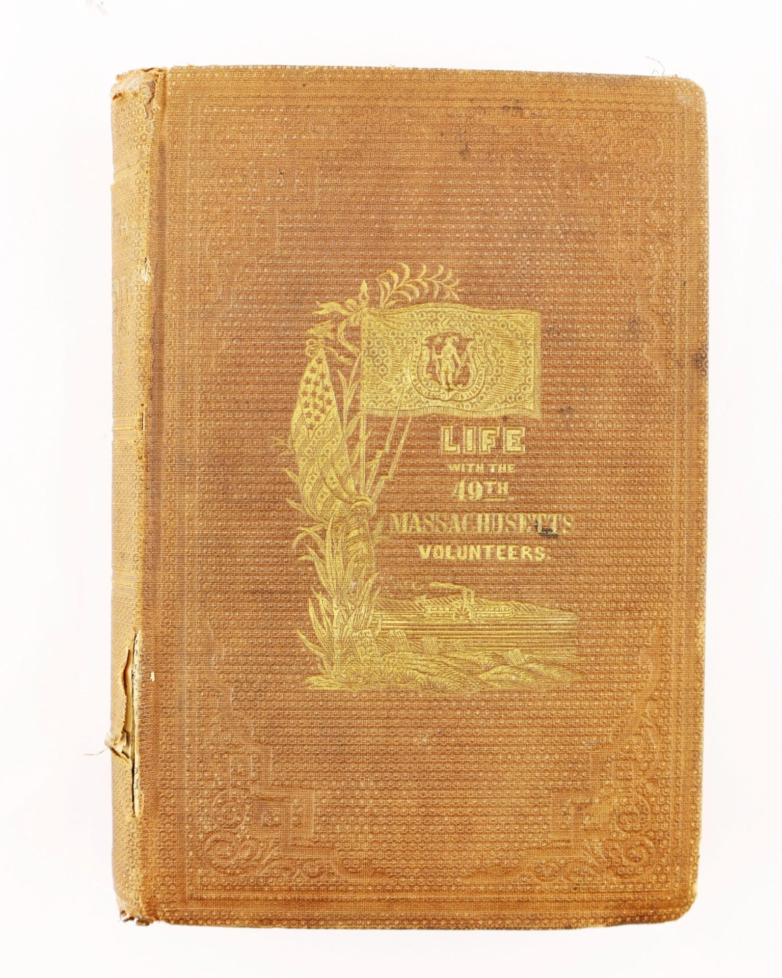 1864 edition Life with the 49th Massachusetts Volunteers by Henry T. Johns, and published in Pittsfield, Massachusetts. Hardbound 391 pages with some edge wear and foxing. Henry T. Johns served with the 9-month 49th Massachusetts at Port Hudson, Louisiana, and was awarded the Medal of Honor for his actions there on May 27, 1863. The front page is signed by Chauncey E. Adams, who is listed as a paper maker in the 1860 census but is not on any Civil War rosters. The book contains great content on the battle and includes numerous illustrations of regimental officers.  Henry T. Johns – Residence Hinsdale MA; a 34-year-old Minister. Enlisted on 9/11/1862 as a Private. On 9/19/1862 he mustered into “C” Co. MA 49th Infantry. He was Mustered Out on 9/1/1863 at Pittsfield, MA. On 9/12/1864 he mustered into “A” Co. MA 61st Infantry. He was Mustered Out on 6/4/1865.  (Residence listed as “Pittsfield, MA”; Occupation listed as “Author”) He was listed as: Wounded 5/25/1863 Port Hudson, LA. Promotions: 2nd Lieut. 9/6/1864. 1st Lieut. 1/15/1865. Capt. 4/9/1865 by Brevet. Intra Regimental Company Transfers: 2/4/1865 from company A to company C. Other Information: Born 4/8/1828 in Philadelphia, PA. Died 5/13/1909 in Glendale, CA. Buried: Mountain View Cemetery, Oakland, CA. (Wife: Martha). Medal of Honor Information: He was awarded the Medal of Honor for action on 5/27/1863 at Port Hudson, LA. (Volunteered to take part in movement upon enemy’s works under heavy fire).