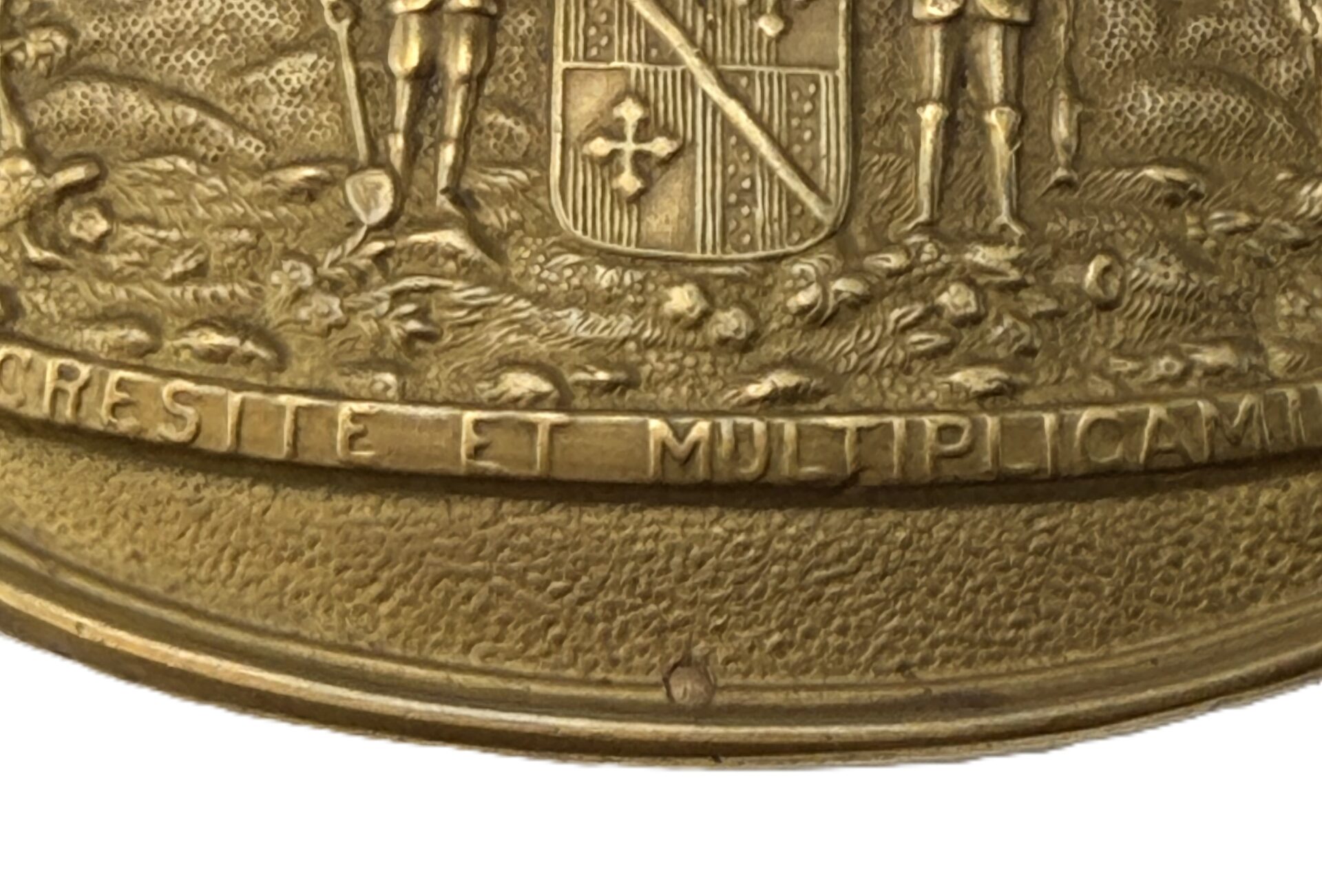 This is an excellent example of the scarce Maryland State Seal oval enlisted belt plate, produced by E. Gaylord of Chicopee, Massachusetts, one of the most prolific military outfitters of the Civil War era. The brass face is die-struck with a crisp rendition of the Maryland coat of arms, showing the Calvert and Crossland quarters supported by the traditional farmer and knight, with the state motto “Fatti Maschii, Parole Femine” (“Manly deeds, womanly words”) raised in a central banner.
