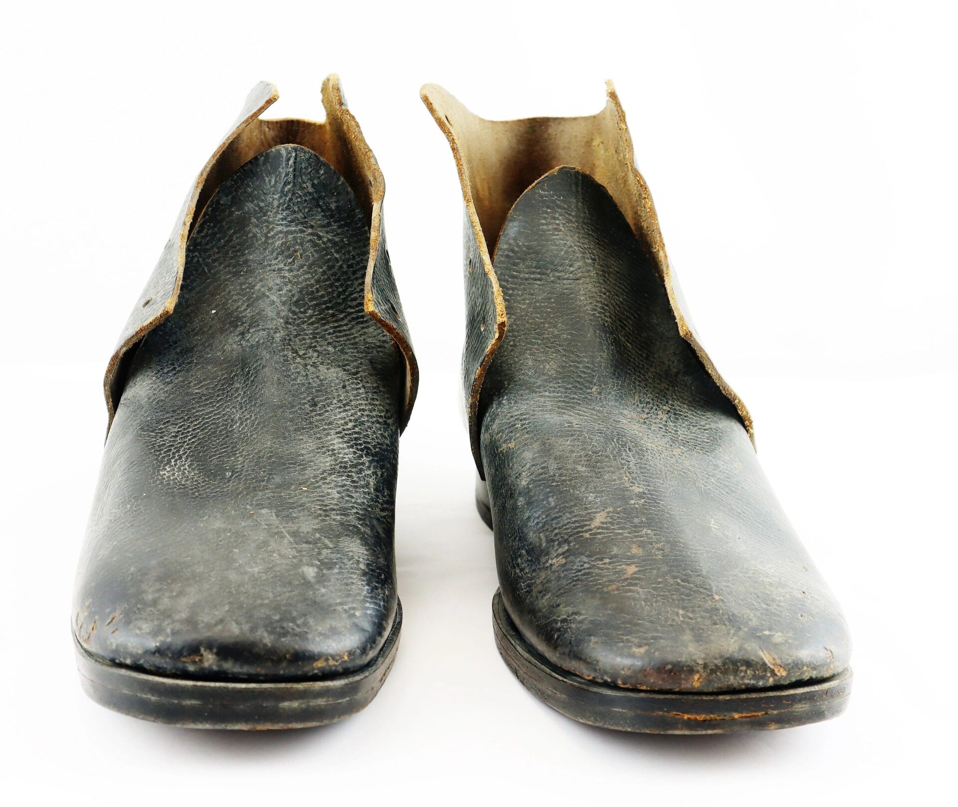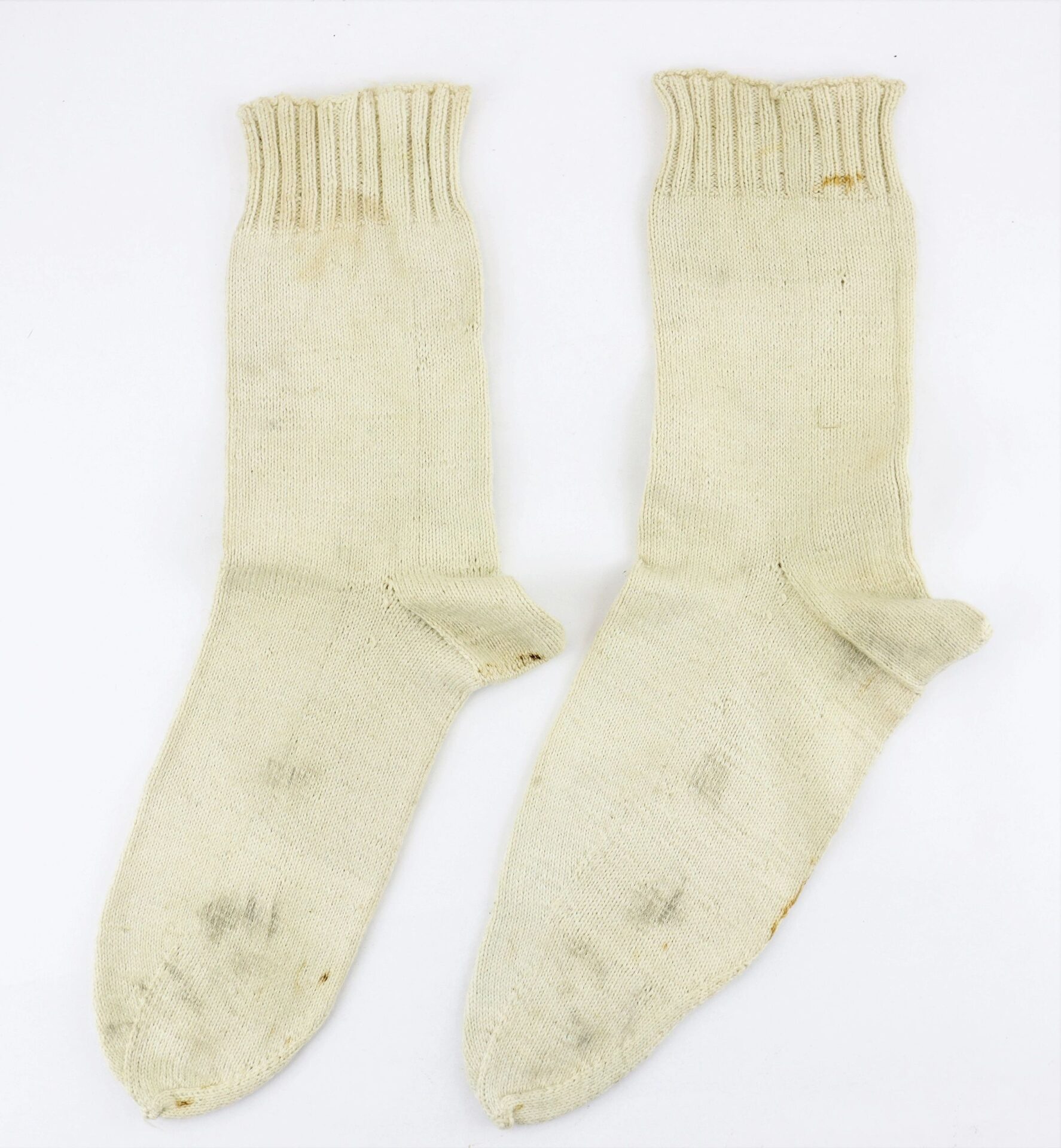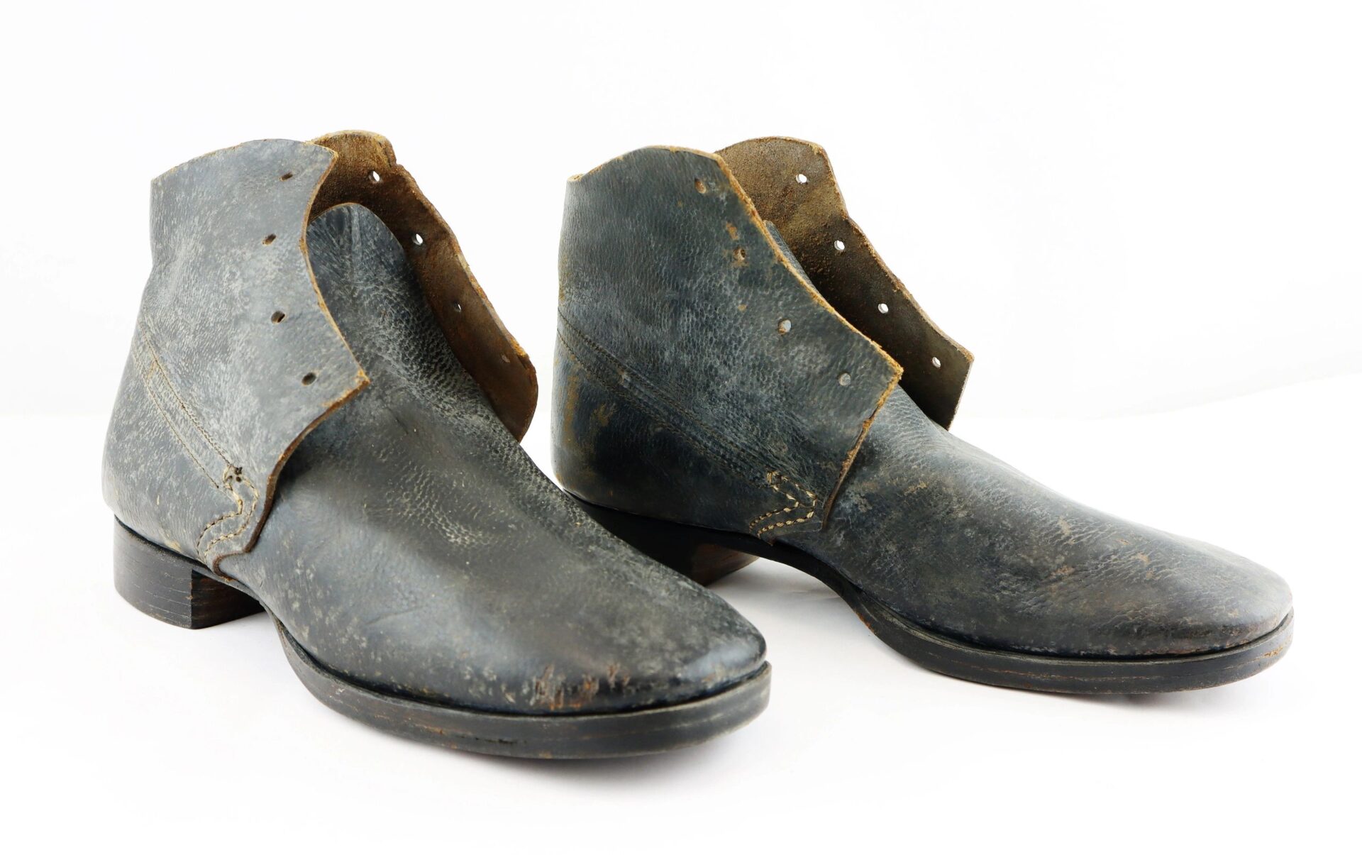 Military-Issue Brogans with a Pair of Civil War-Period Socks – Inventory Number: UNI 123 / SOLD Scarce pair of military-issue brogans with a pair of Civil War-period socks. Sole length of 10 ¾” with an overall height of 6 ¾”. With classic square toes, nailed stacked heels, soles pegged in a double row, each side with 4 unreinforced eyelets. Included with the brogans is a pair of Civil War-era cotton socks measuring 3 3/4” by 15” A rare and essential piece of Civil War equipment in great condition. Inventory Number: UNI 123 / SOLD