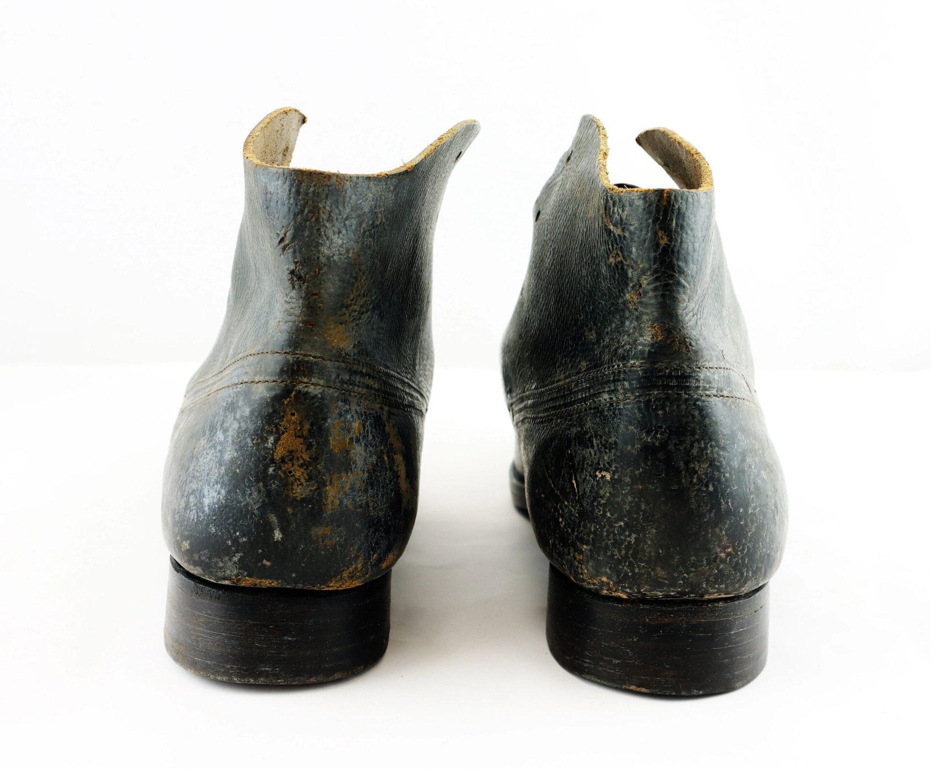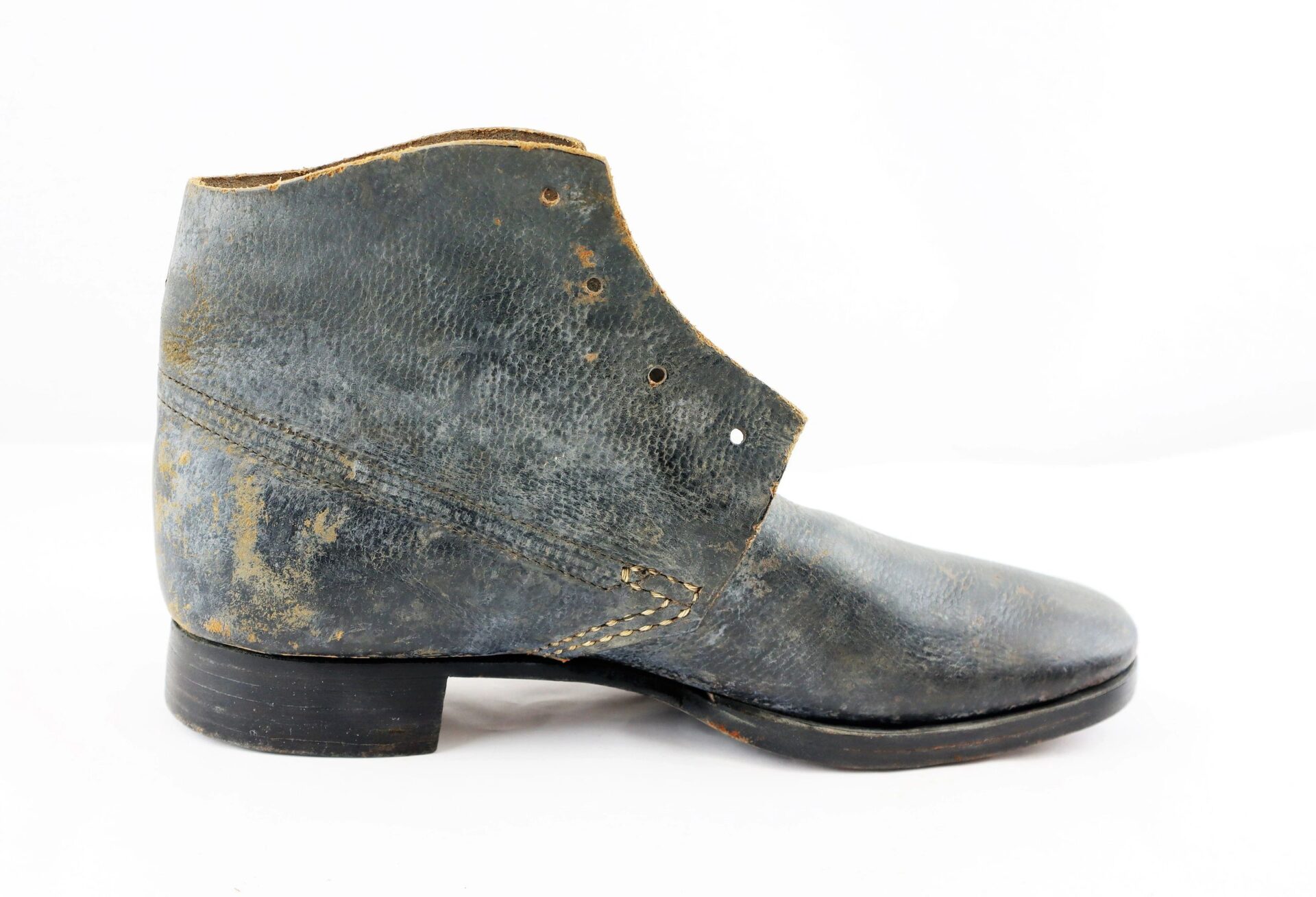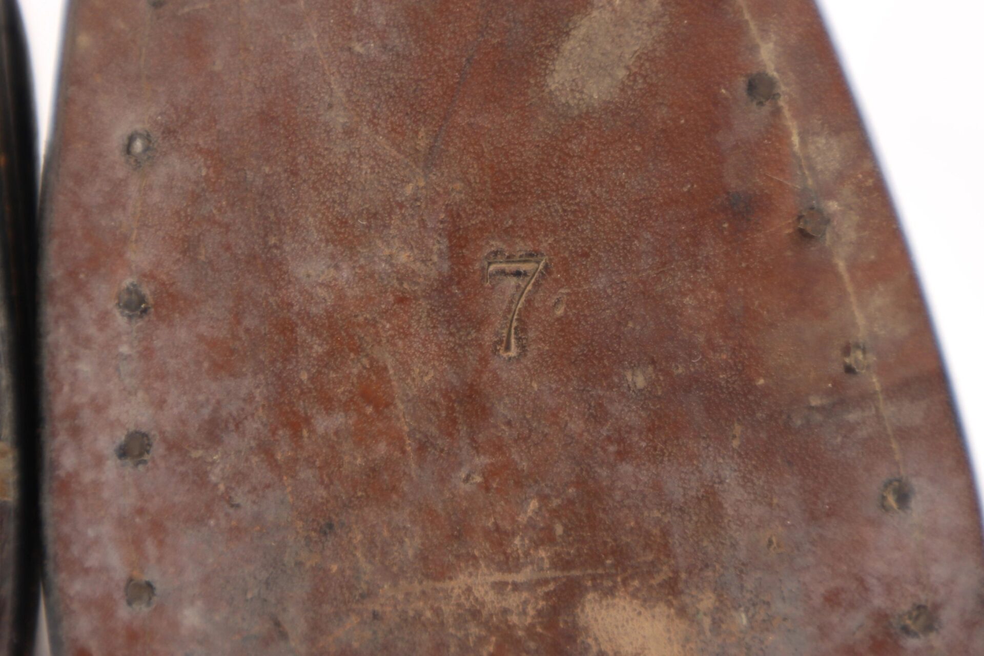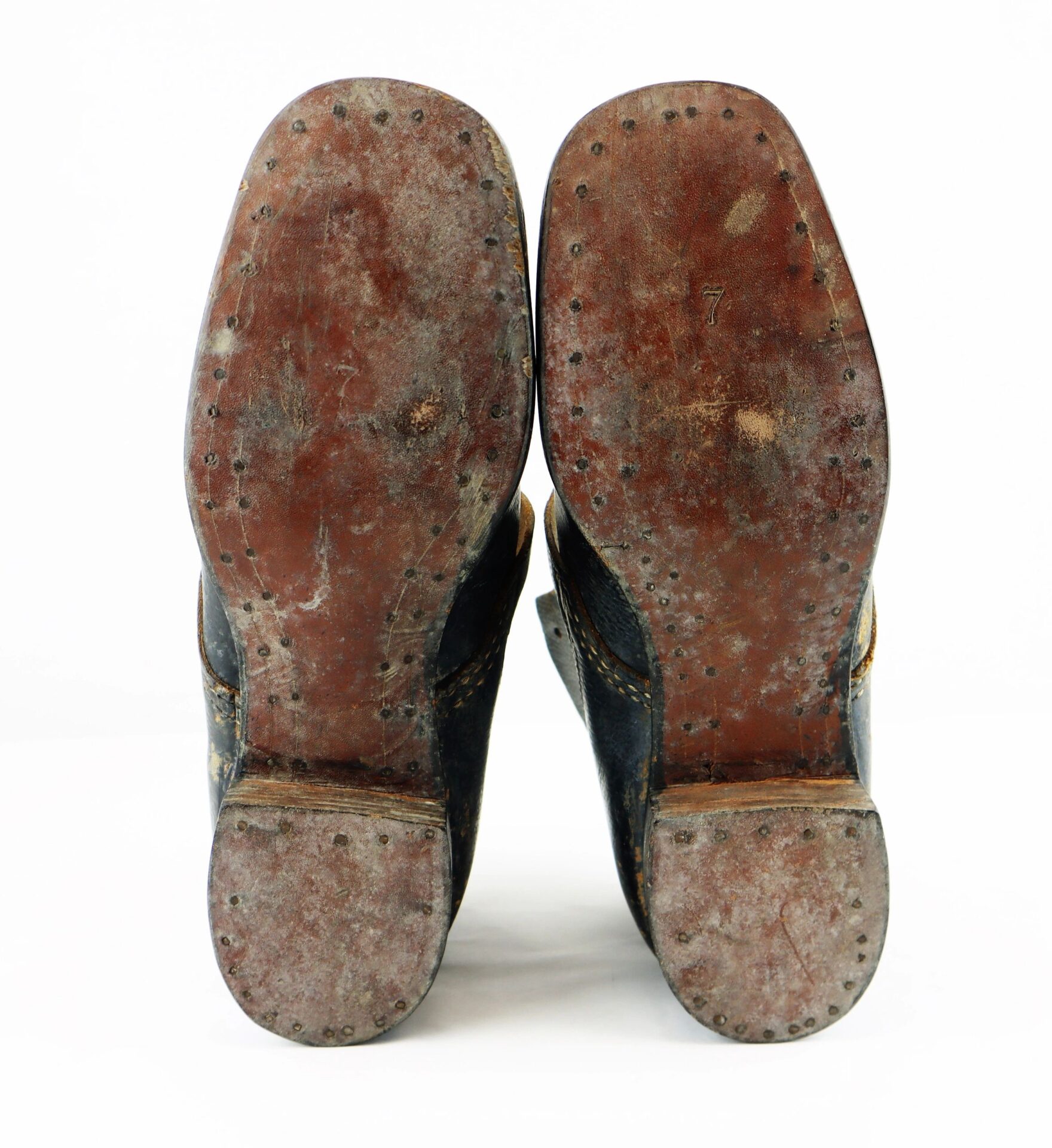 Military-Issue Brogans with a Pair of Civil War-Period Socks – Inventory Number: UNI 123 / SOLD Scarce pair of military-issue brogans with a pair of Civil War-period socks. Sole length of 10 ¾” with an overall height of 6 ¾”. With classic square toes, nailed stacked heels, soles pegged in a double row, each side with 4 unreinforced eyelets. Included with the brogans is a pair of Civil War-era cotton socks measuring 3 3/4” by 15” A rare and essential piece of Civil War equipment in great condition. Inventory Number: UNI 123 / SOLD