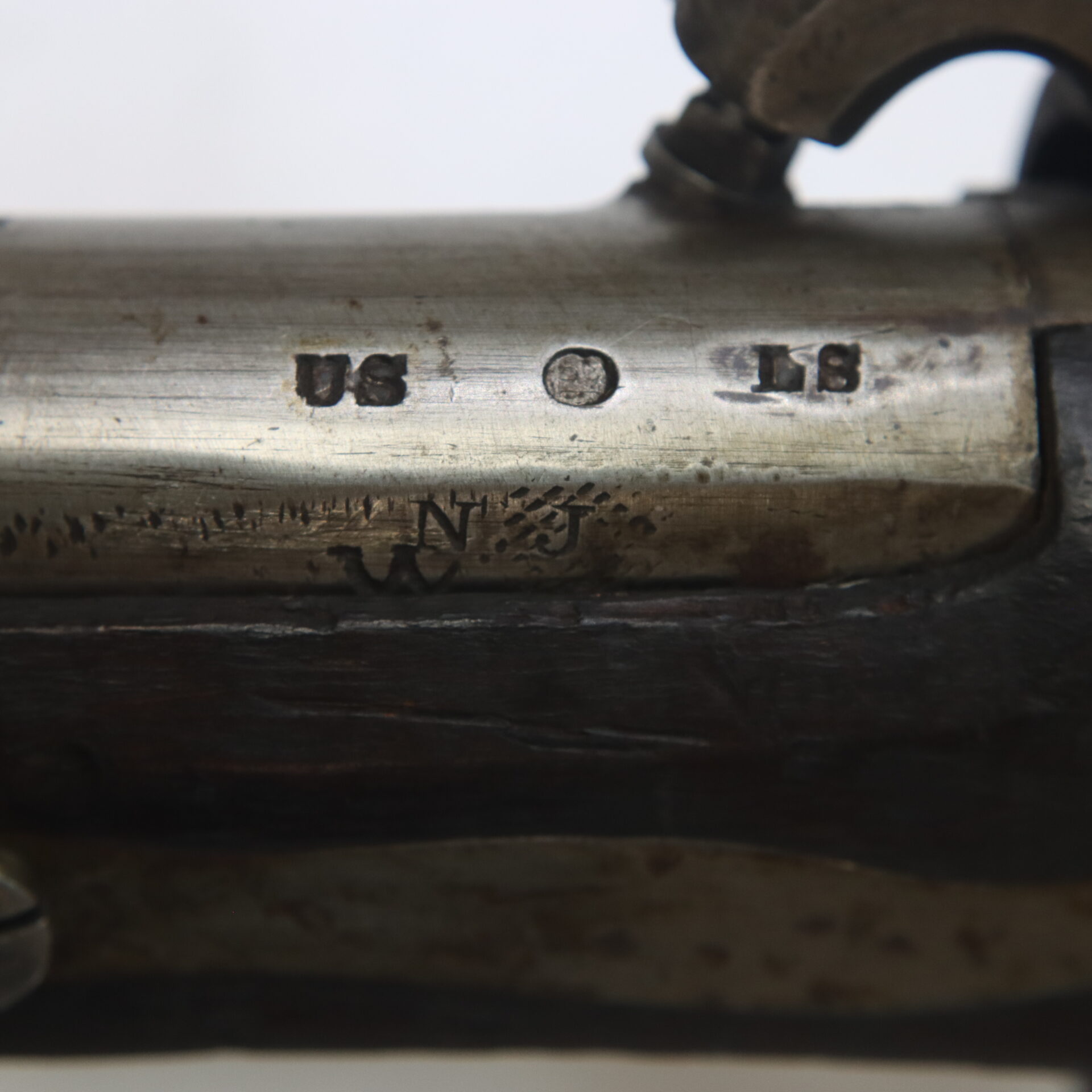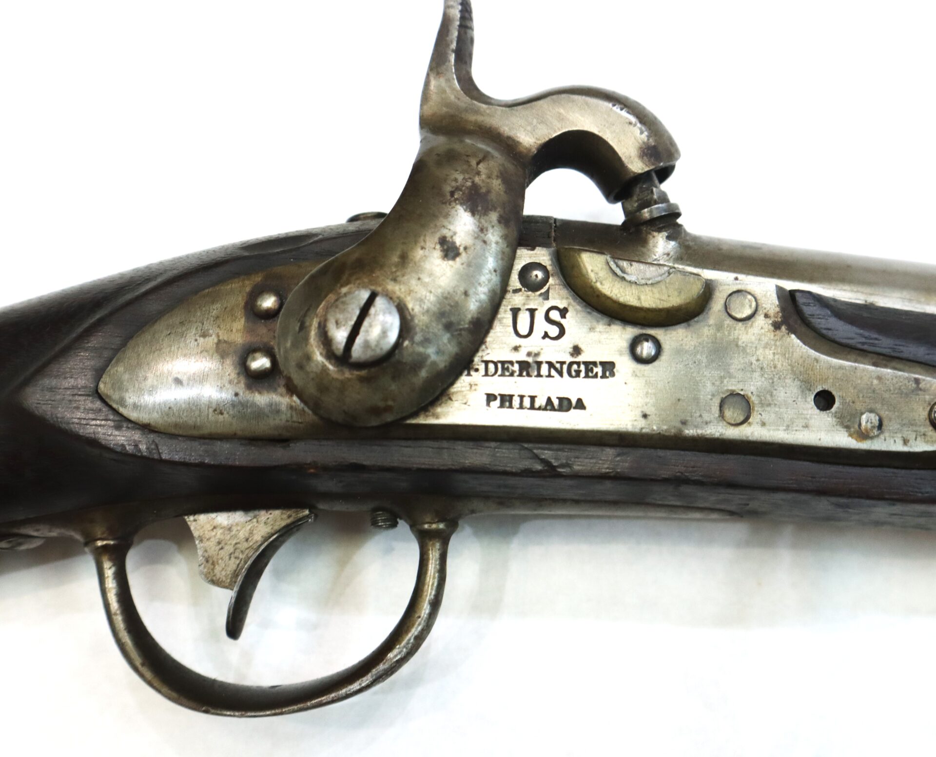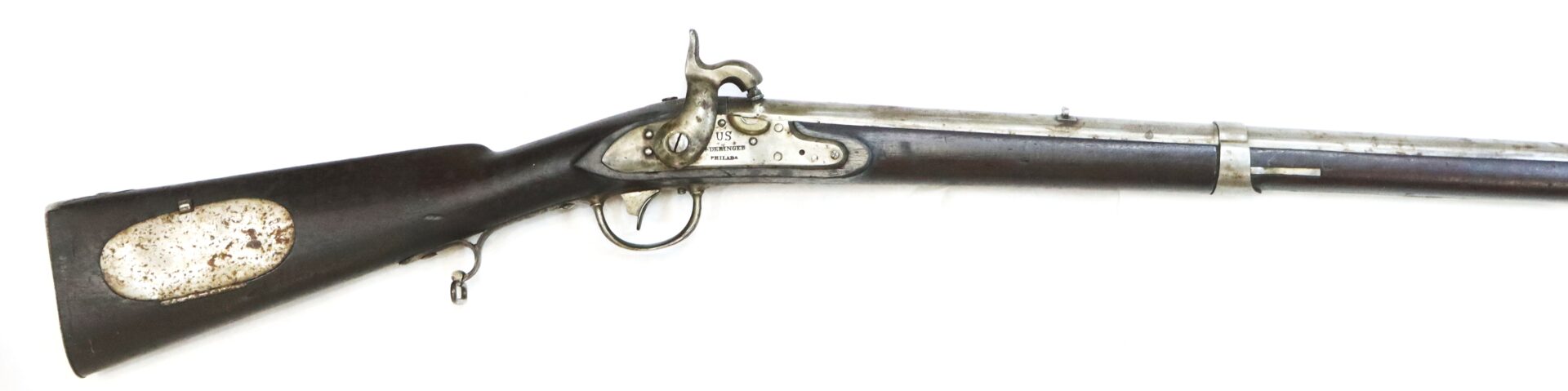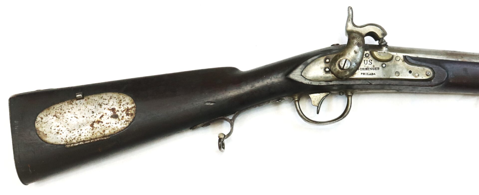 The lock markings “U.S. Deringer Phila.” remain bold and sharply struck. The Model 1817 rifle was the first standardized rifle adopted by the United States military and was designed for use by rifle companies and light infantry units requiring greater accuracy than that provided by smoothbore muskets.