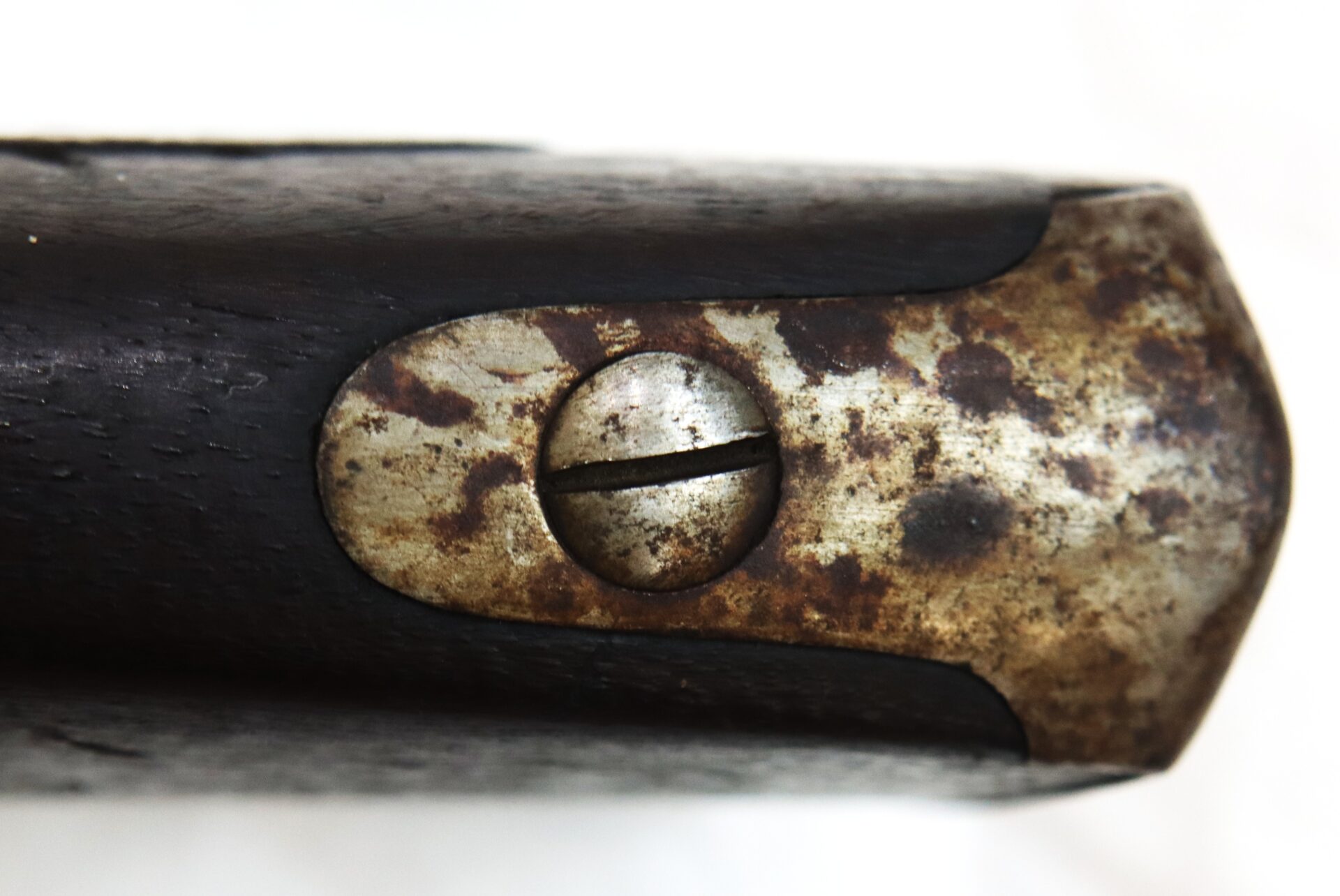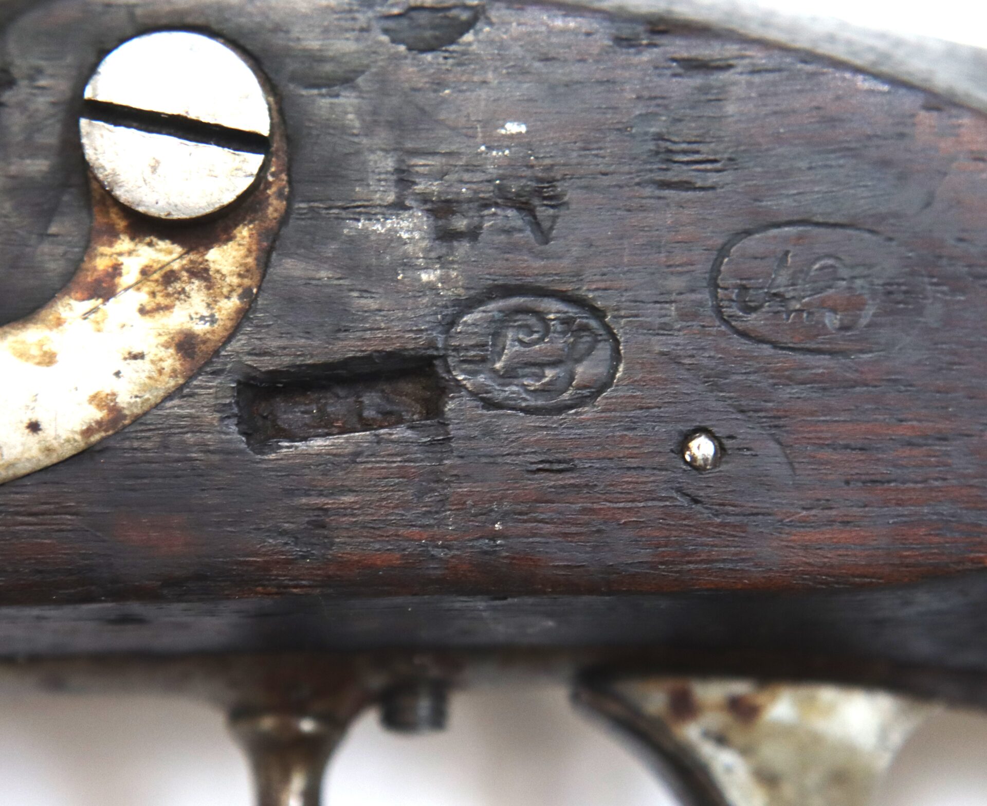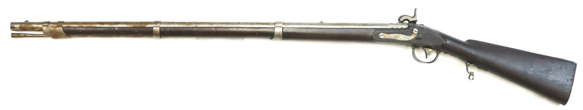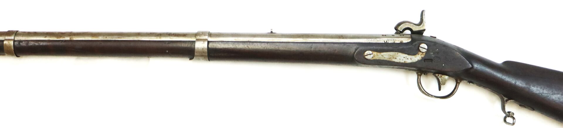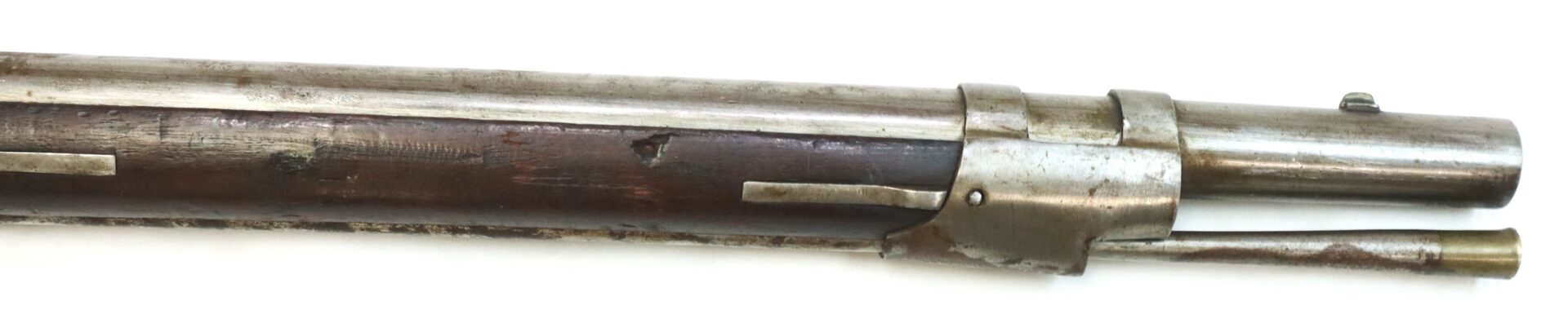 The rifle retains its original brass‑tipped ramrod. Much of the metal still shows armory bright surfaces with scattered areas of darker patina. The buttplate and rear of the trigger guard show deeper toning, while the patchbox displays an attractive salt‑and‑pepper patina. Inspector cartouches remain visible in the stock.