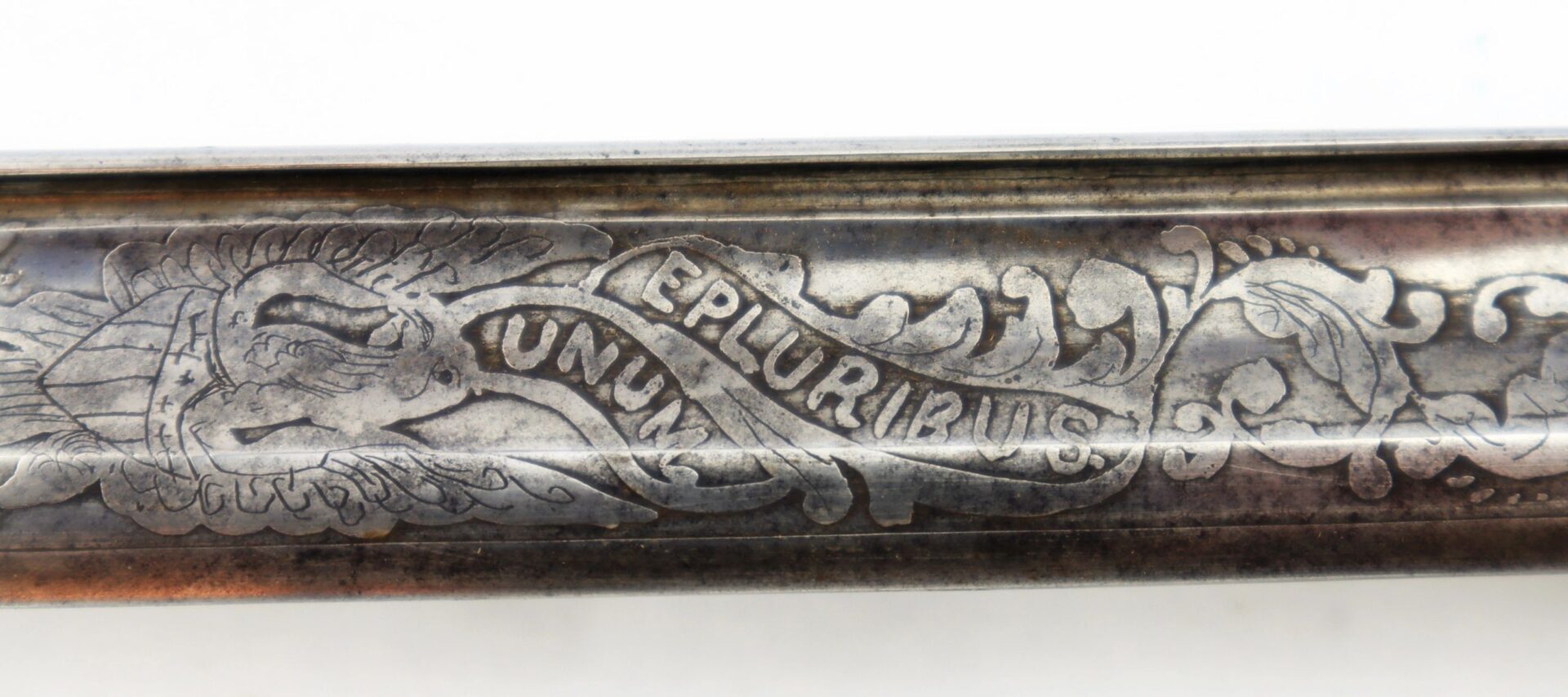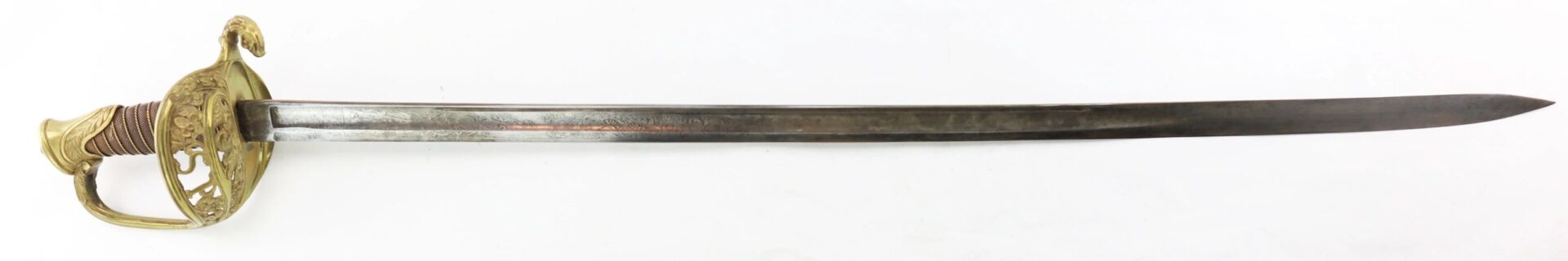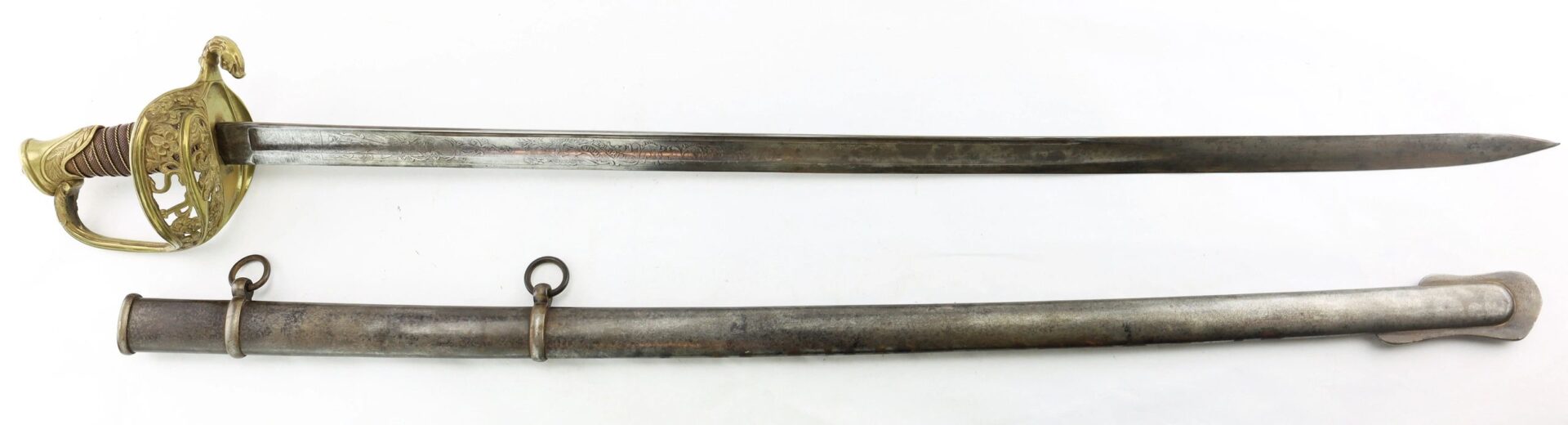 Model 1850 Staff and Field Officer’s Sword Gutta Percha Grip! – Inventory Number: SWO 238 / SOLD Classic large basket Staff and Field officer’s sword. Nicely etched blade with steel bodied scabbard. Brass hilt is in good condition, missing a section of the “U” in the basket. The grip is constructed of gutta percha. A unique variant. Inventory Number: SWO 238 / SOLD