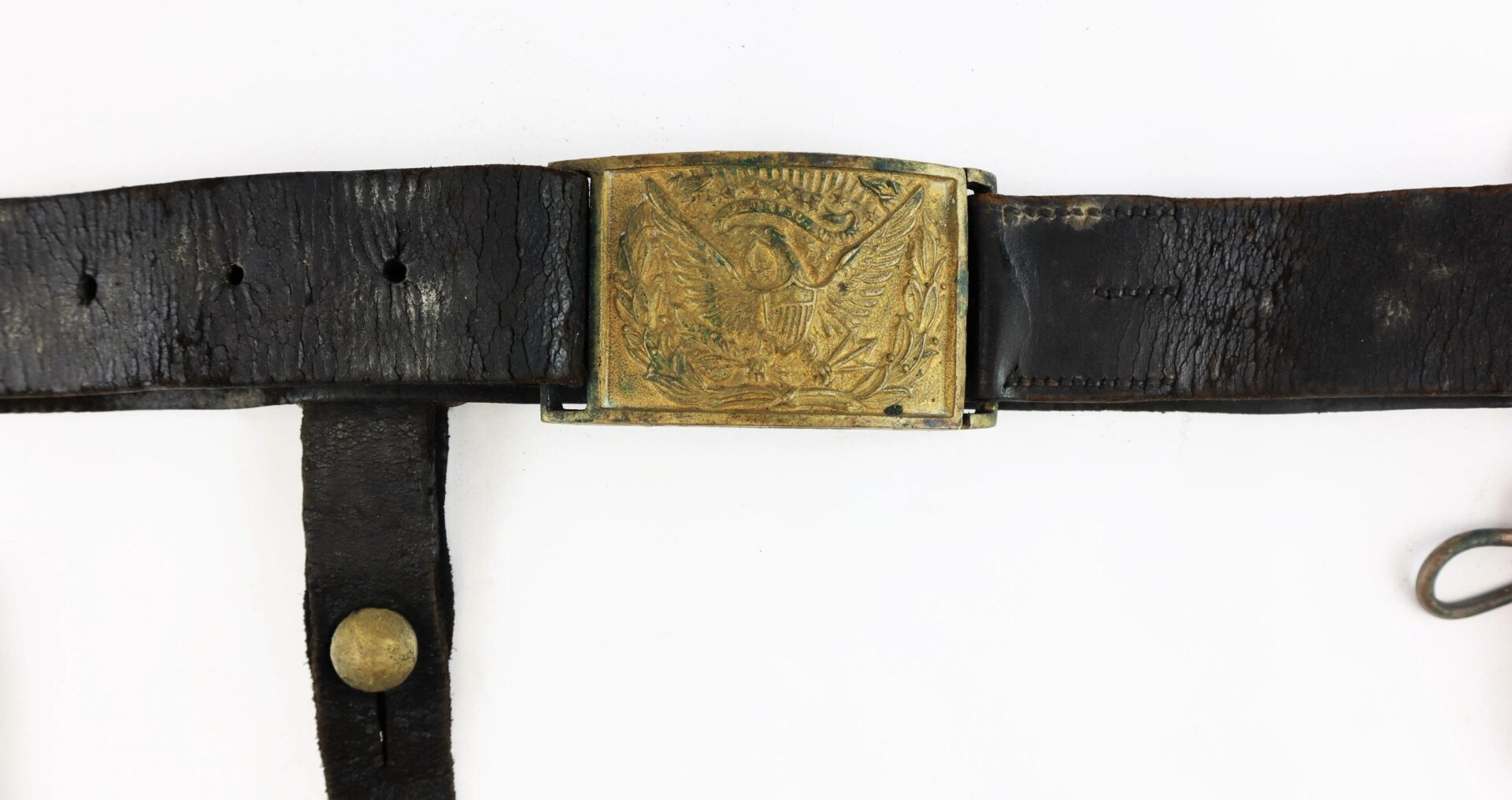 Bridle leather model 1851 saber belt worn by Federal enlisted cavalrymen prior to and during Civil War. Complete with an original regulation 1851 pattern brass eagle belt plate and matching keeper. The belt plate is solid cast brass with a pleasing uncleaned patina.Ā Both long and short leather saber straps and brass saber hook are present. Constructed of smooth out bridle leather, the belt exhibits surface crazing and has a split at the loop at the bottom of the long saber strap but is very supple and flexible. This would display well with a Civil War cavalry saber.