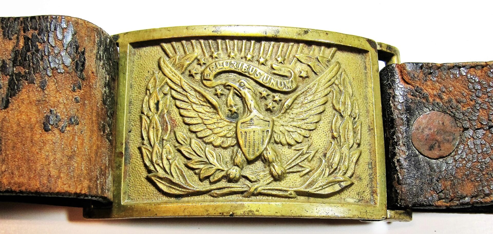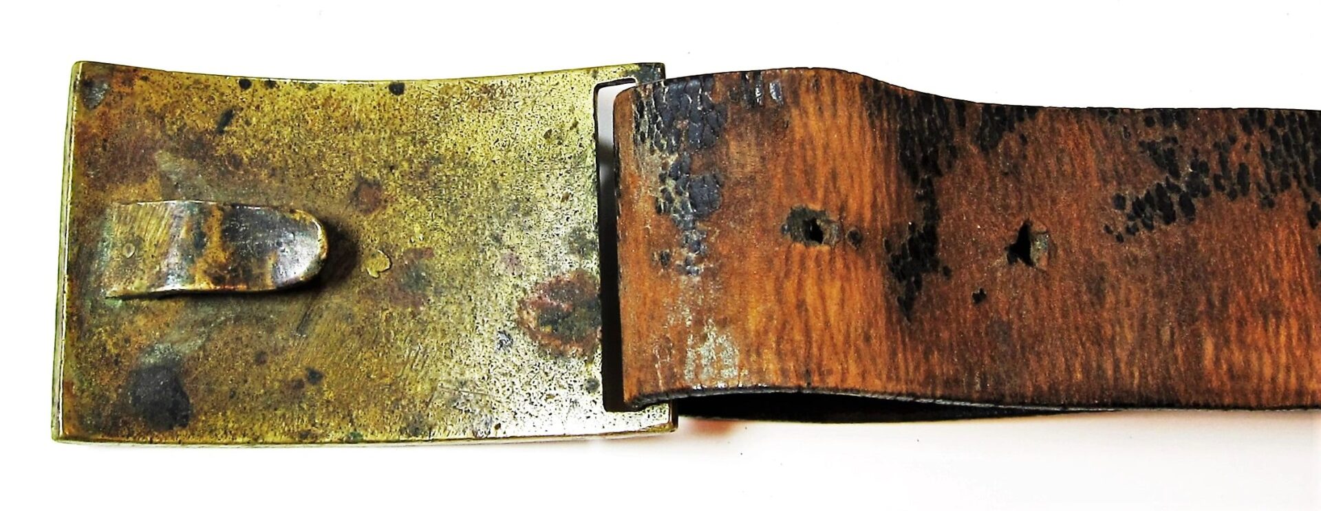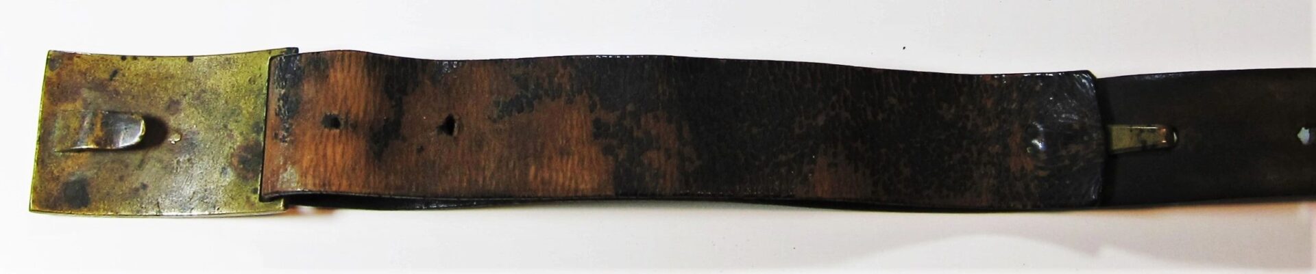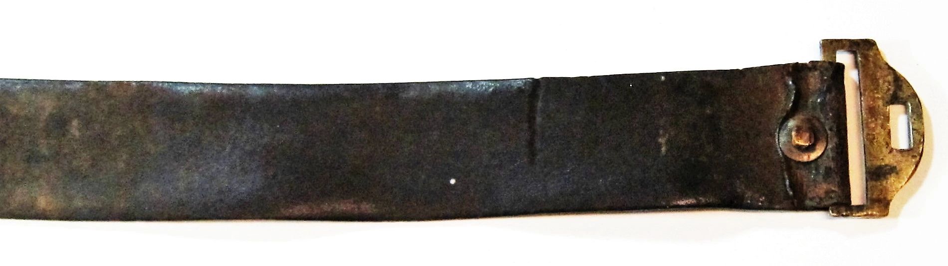 Model 1851 sword belt plate mounted on its original early war belt with copper rivet. possible Confederate usage. Leather is pliable with some surface flaking present, remainder is in stable condition. Nice example for US or CS display. Inventory Number: BEL 105 / SOLD