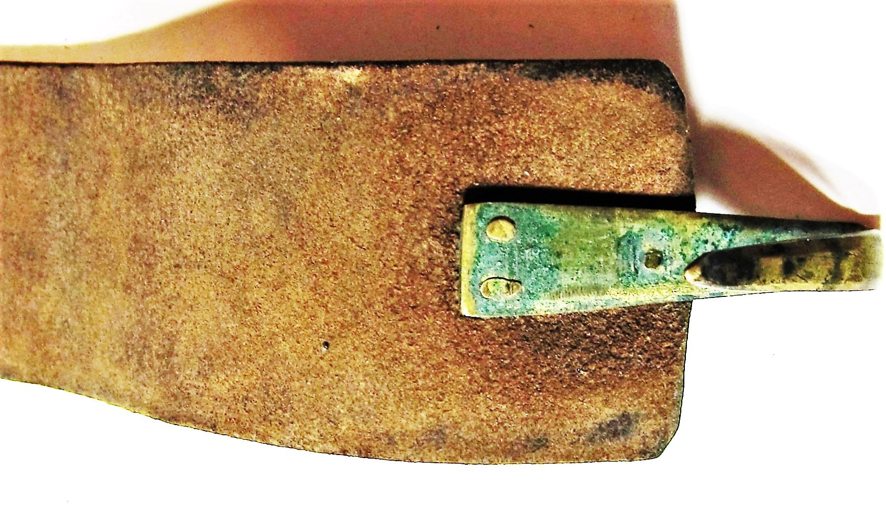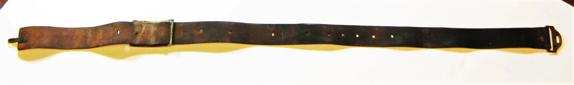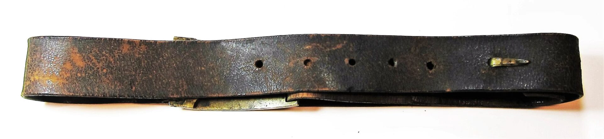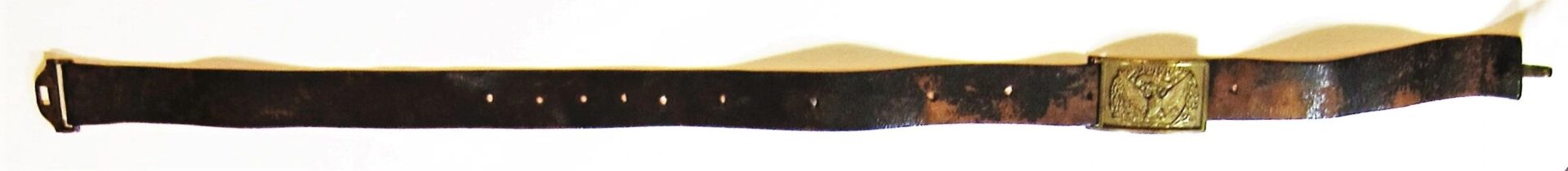 Model 1851 sword belt plate mounted on its original early war belt with copper rivet. possible Confederate usage. Leather is pliable with some surface flaking present, remainder is in stable condition. Nice example for US or CS display. Inventory Number: BEL 105 / SOLD
