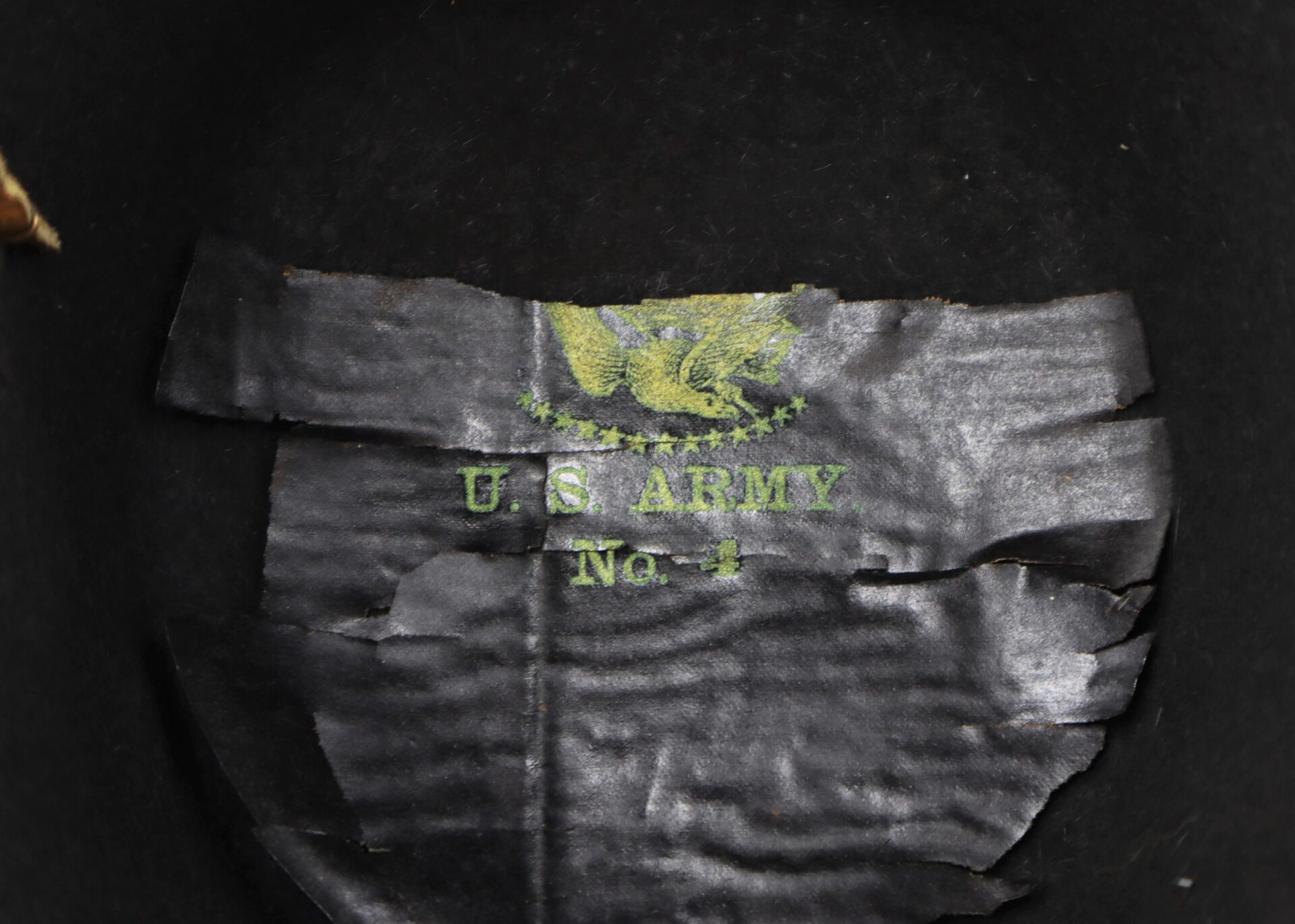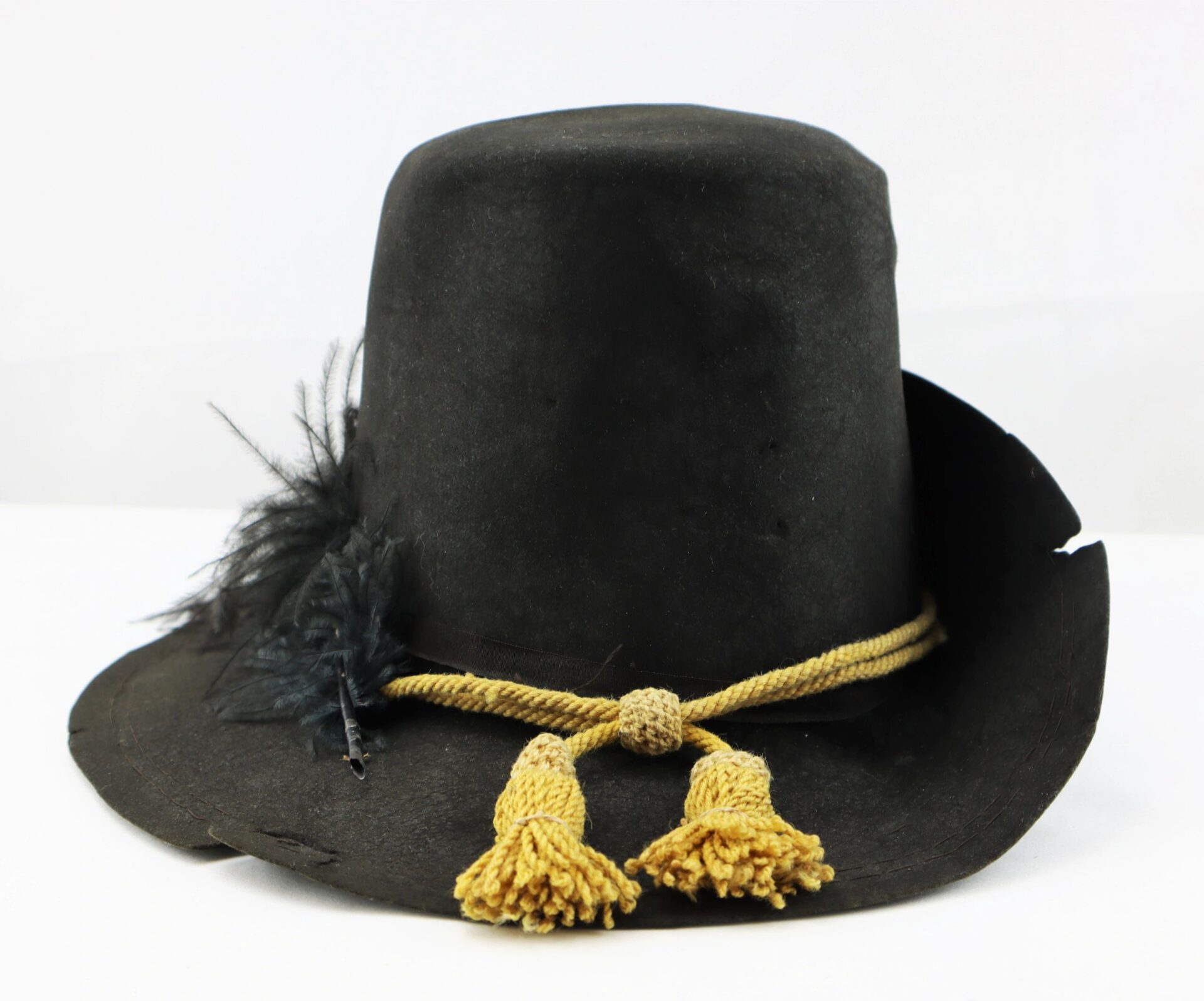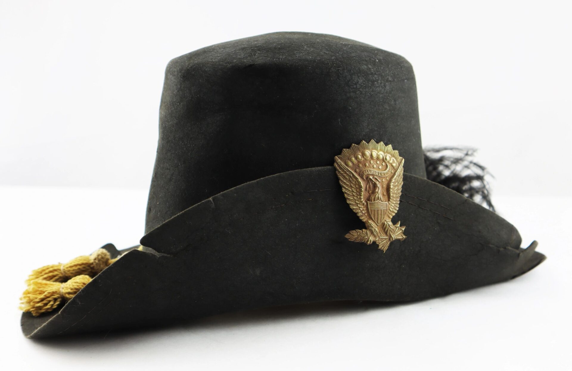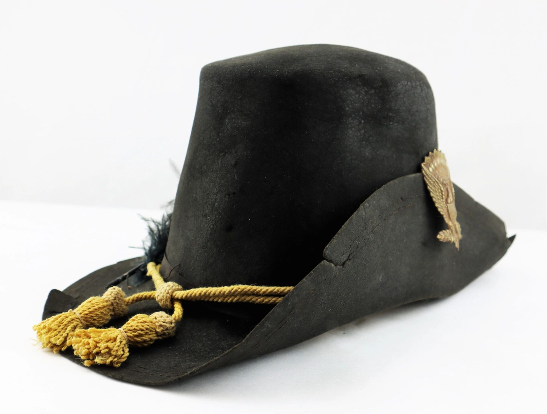 Model 1858 Cavalry Hardee Hat – Inventory Number: UNI 151 / SOLD The Hardee hat, also known as the Model 1858 Dress Hat and sometimes nicknamed the “Jeff Davis”, was the regulation dress hat for enlisted men in the Union Army, during the American Civil War. Most soldiers found the black felt hat to be too hot and heavy and greatly preferred the forage cap, kepi or slouch hat. During the Civil War, the Union Army members of the “Iron Brigade” became the most prominent wearers of the Hardee hat, thereby often being referred to as the Black-Hats. Additionally, some unadorned, plain and often field-modified Hardee hats were worn by Union troops, especially in the Western theater. This example of the Hardee hat has its original worsted wool, yellow hat cord, both denoting cavalry use. The left side of the hat is folded up and affixed to the crown, with the correct, original Hardee hat eagle device. The brim of the hat is bound with two rows of stitching, as seen in all period Hardee hats, and half of the original U.S. Army label remains on the inside, top of the crown. The small, black grosgrain ribbon remains beneath the hat cord, surrounding the crown’s exterior, as well. This hat appears to have seen field use, as it does have some wear and weather exposure areas, especially on the brim. The felt remains in overall good condition, although there are several breaks in the brim. The sweatband is missing, as well. This hat is quite pliable and no longer stiff, a feature also indicative of war period field use. Despite some minor condition issues, the hat displays very well and really is impressive in appearance. Inventory Number: UNI 151 / SOLD