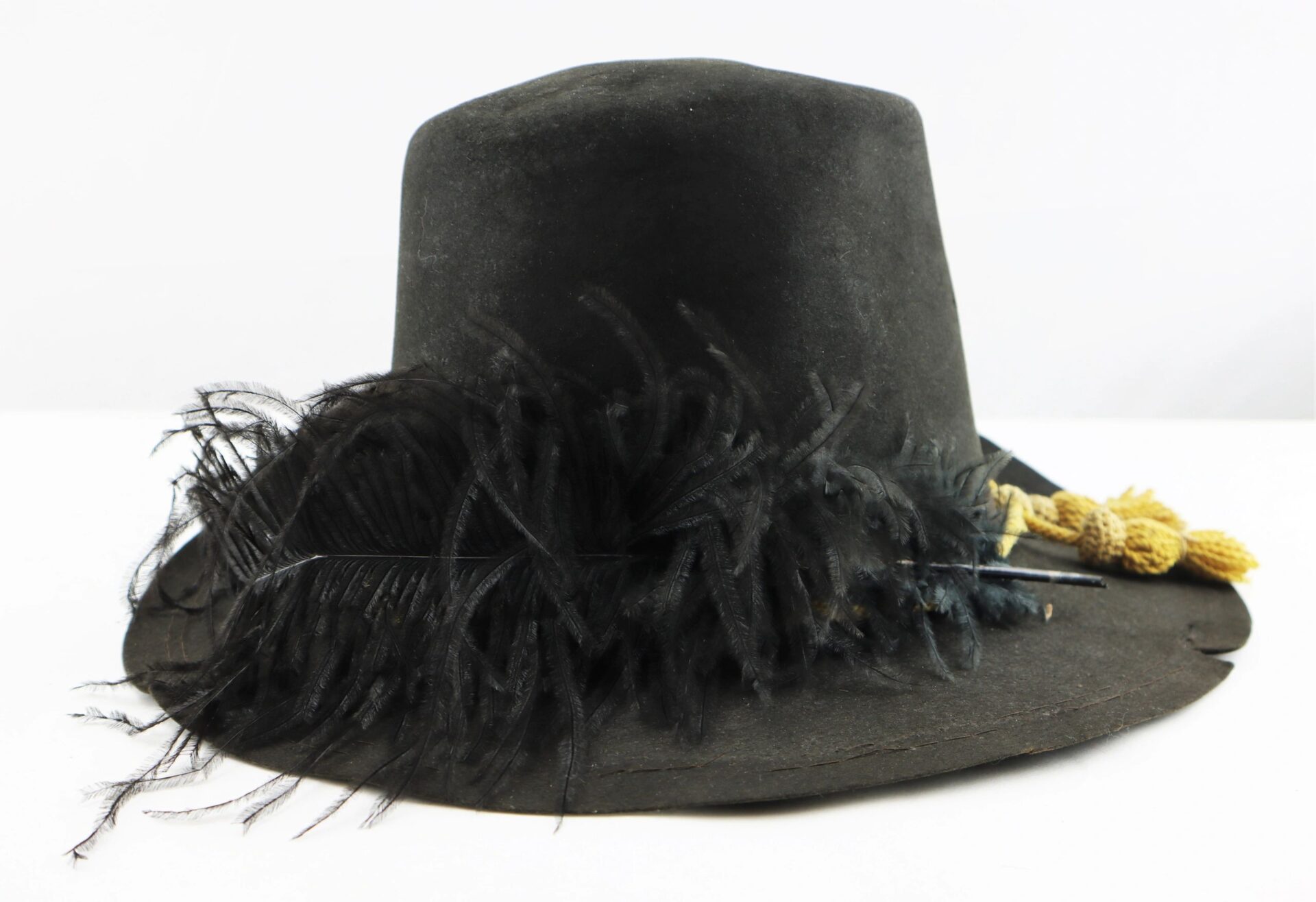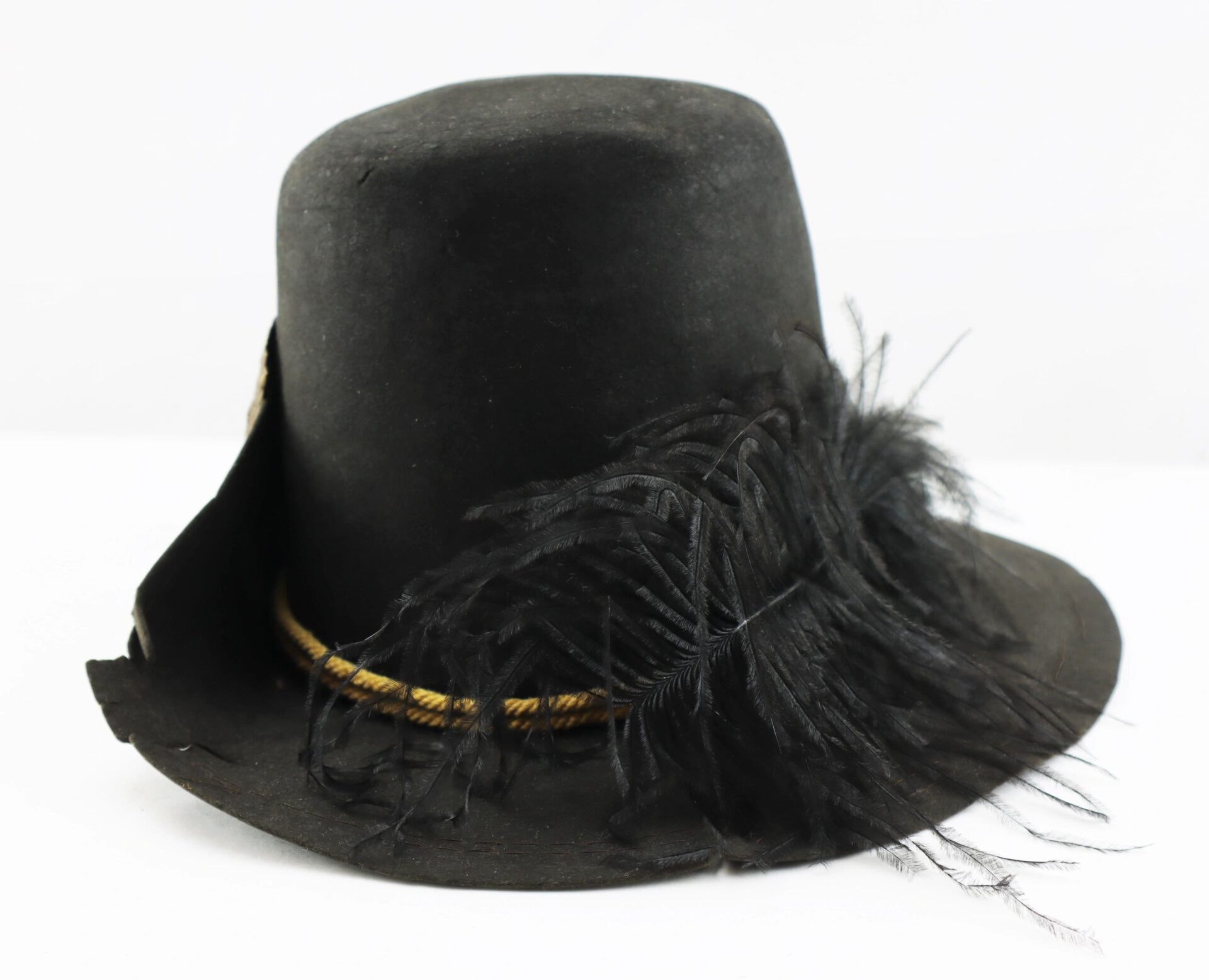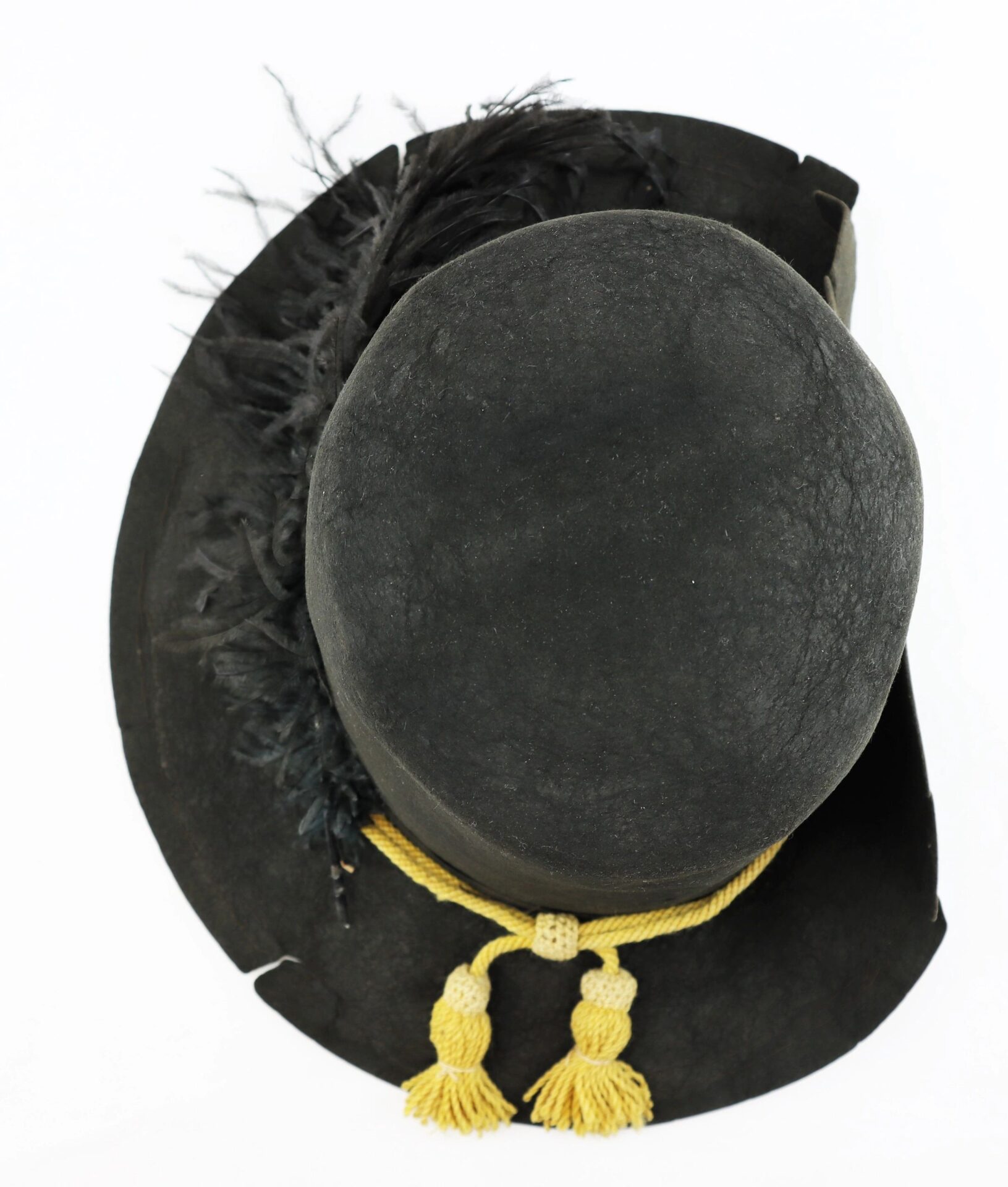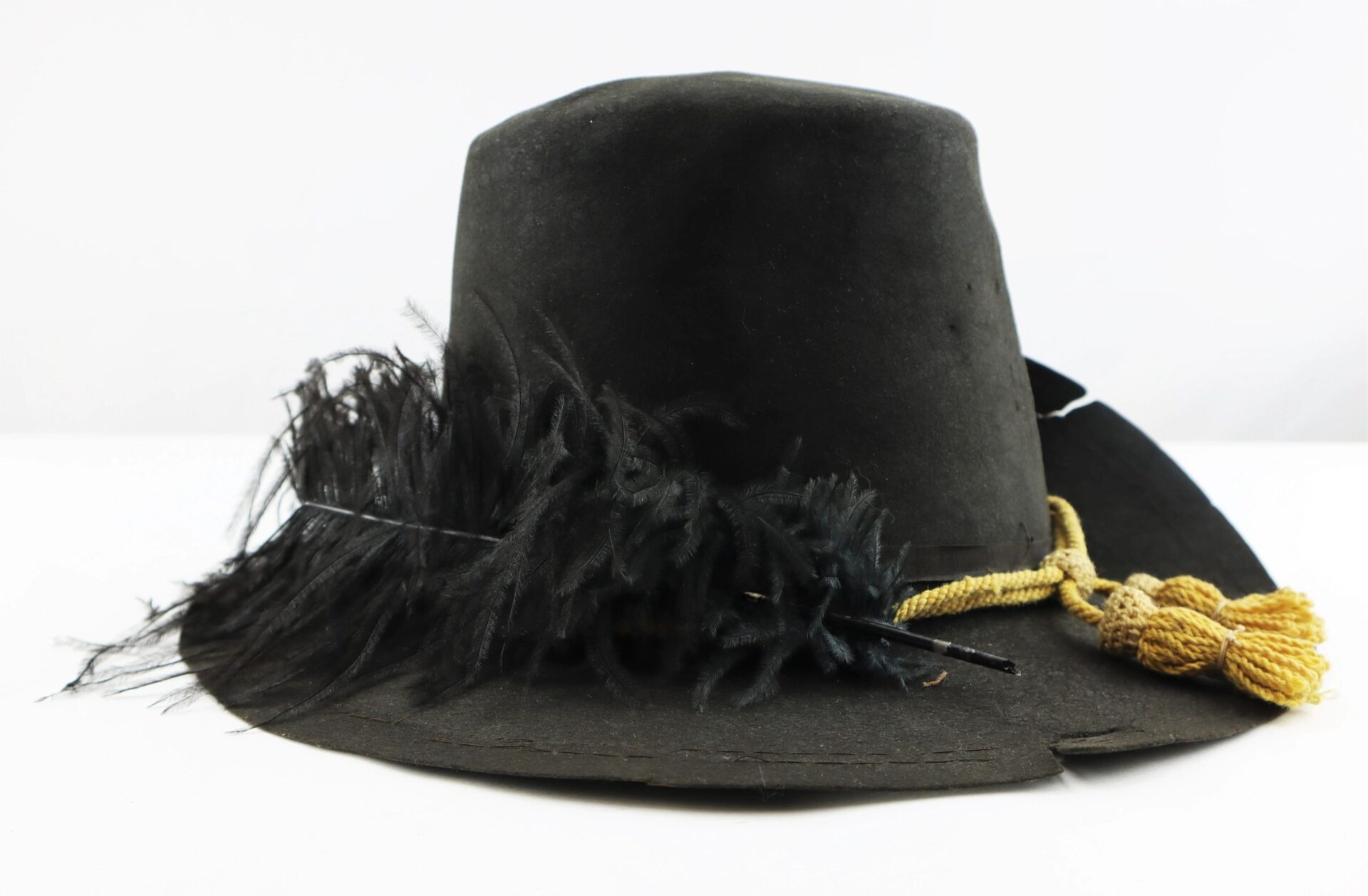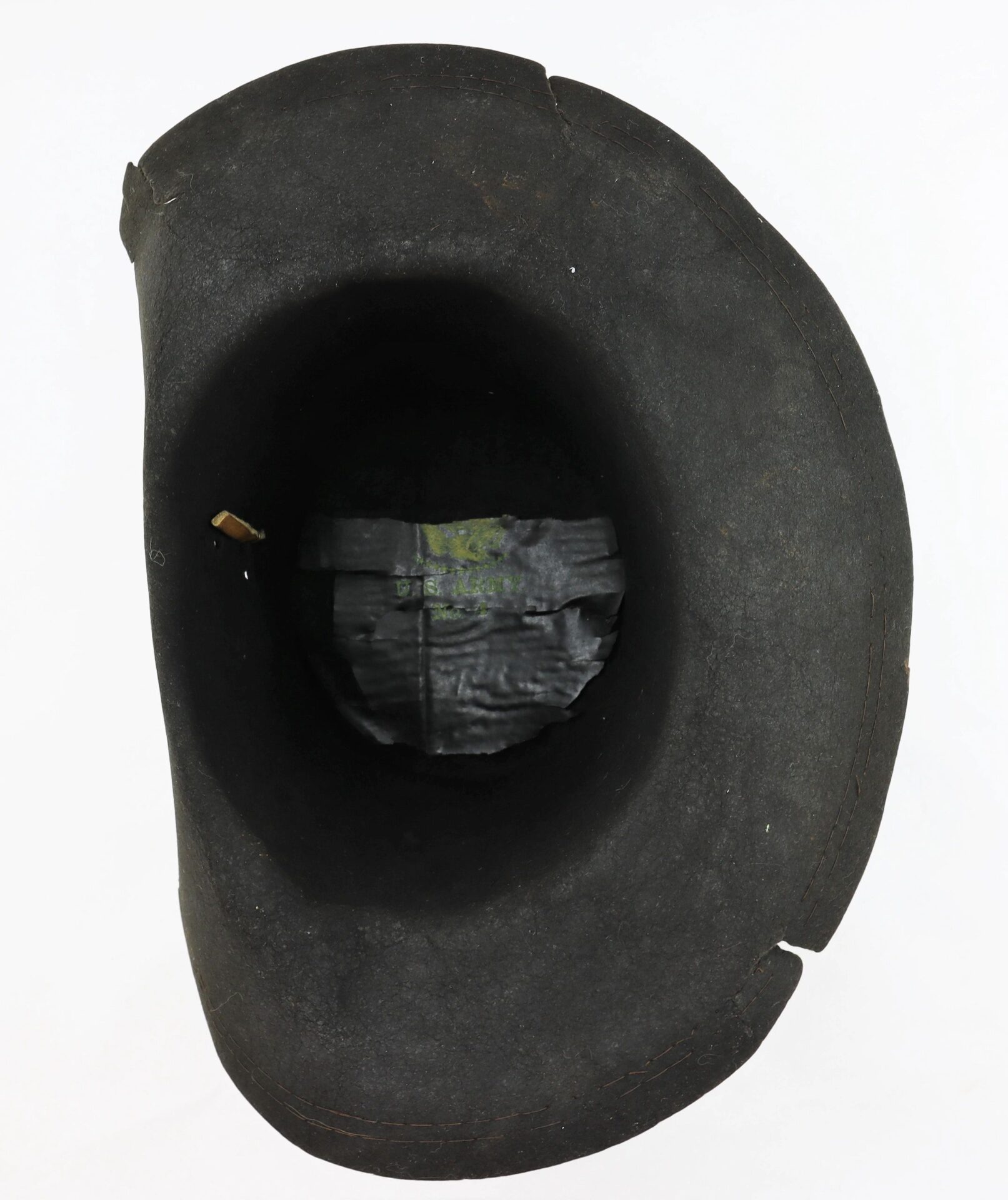 Model 1858 Cavalry Hardee Hat – Inventory Number: UNI 151 / SOLD The Hardee hat, also known as the Model 1858 Dress Hat and sometimes nicknamed the “Jeff Davis”, was the regulation dress hat for enlisted men in the Union Army, during the American Civil War. Most soldiers found the black felt hat to be too hot and heavy and greatly preferred the forage cap, kepi or slouch hat. During the Civil War, the Union Army members of the “Iron Brigade” became the most prominent wearers of the Hardee hat, thereby often being referred to as the Black-Hats. Additionally, some unadorned, plain and often field-modified Hardee hats were worn by Union troops, especially in the Western theater. This example of the Hardee hat has its original worsted wool, yellow hat cord, both denoting cavalry use. The left side of the hat is folded up and affixed to the crown, with the correct, original Hardee hat eagle device. The brim of the hat is bound with two rows of stitching, as seen in all period Hardee hats, and half of the original U.S. Army label remains on the inside, top of the crown. The small, black grosgrain ribbon remains beneath the hat cord, surrounding the crown’s exterior, as well. This hat appears to have seen field use, as it does have some wear and weather exposure areas, especially on the brim. The felt remains in overall good condition, although there are several breaks in the brim. The sweatband is missing, as well. This hat is quite pliable and no longer stiff, a feature also indicative of war period field use. Despite some minor condition issues, the hat displays very well and really is impressive in appearance. Inventory Number: UNI 151 / SOLD