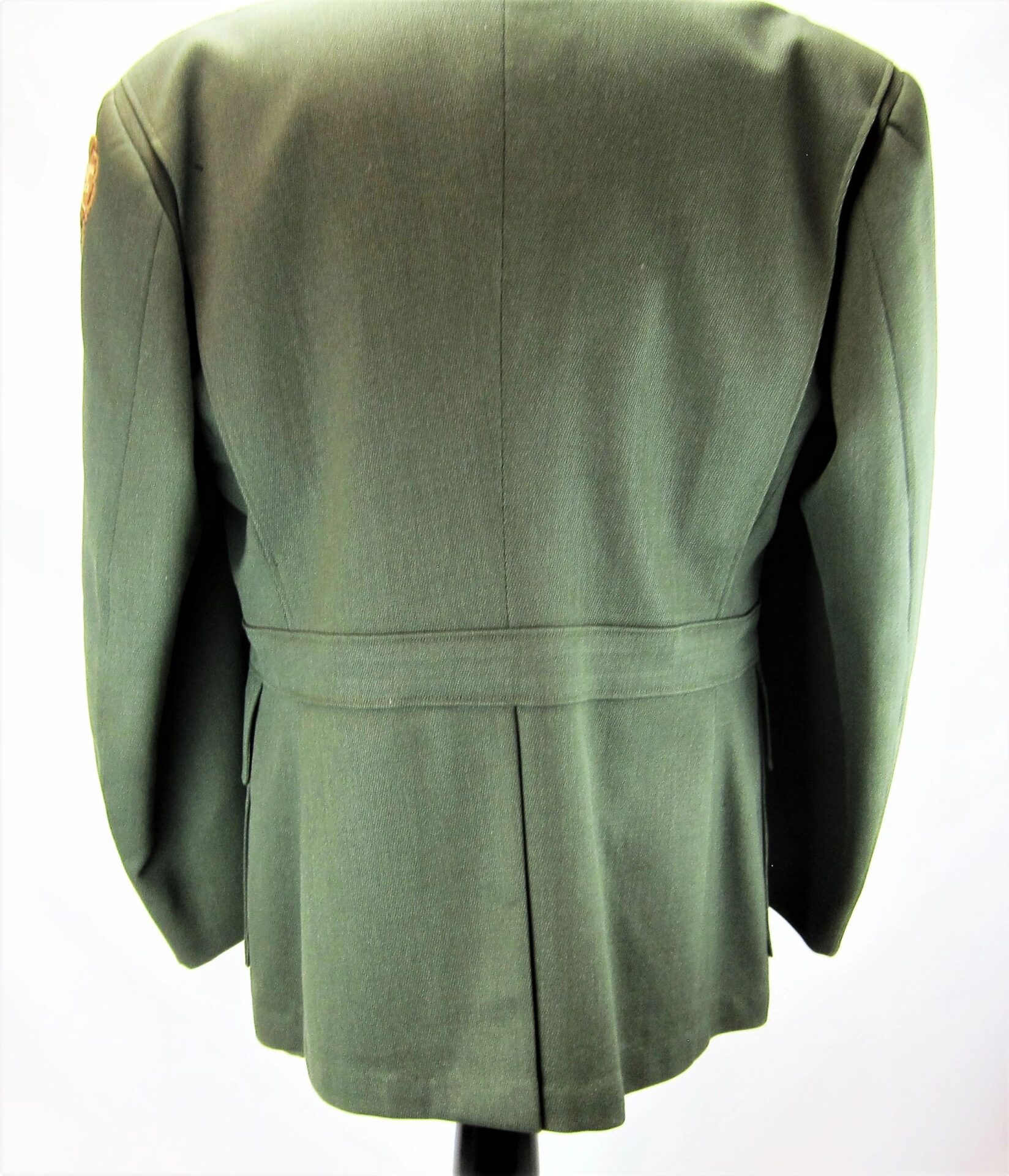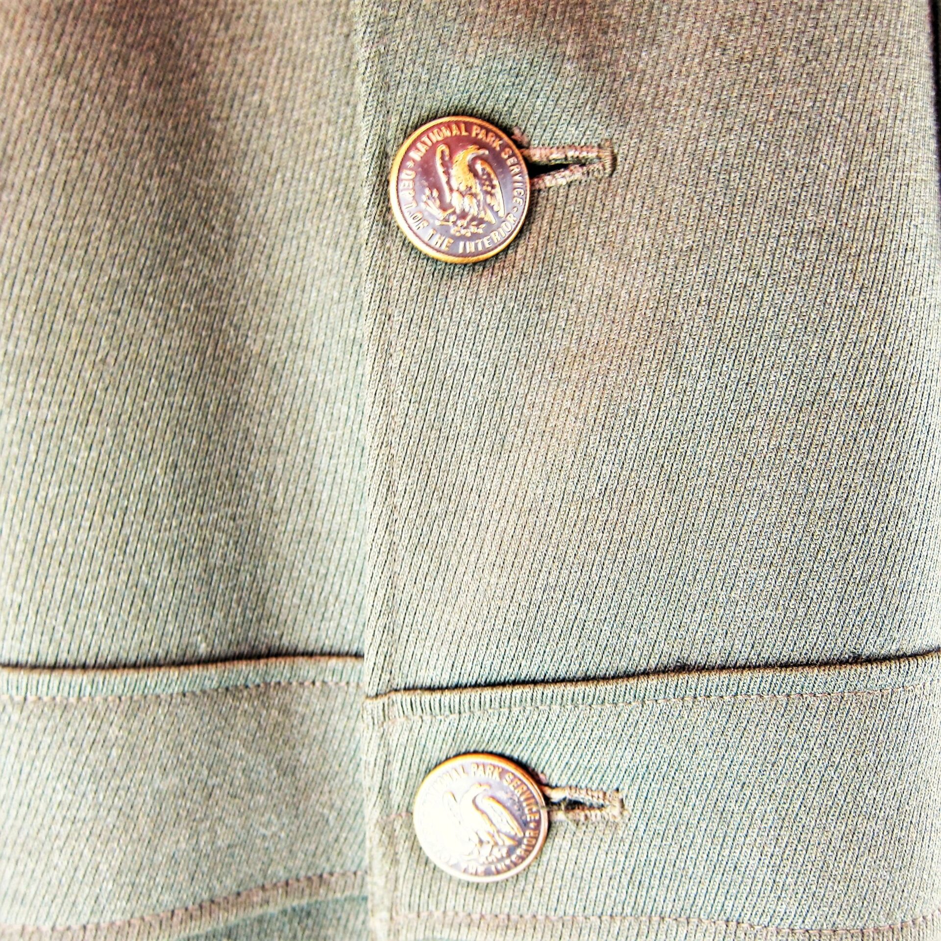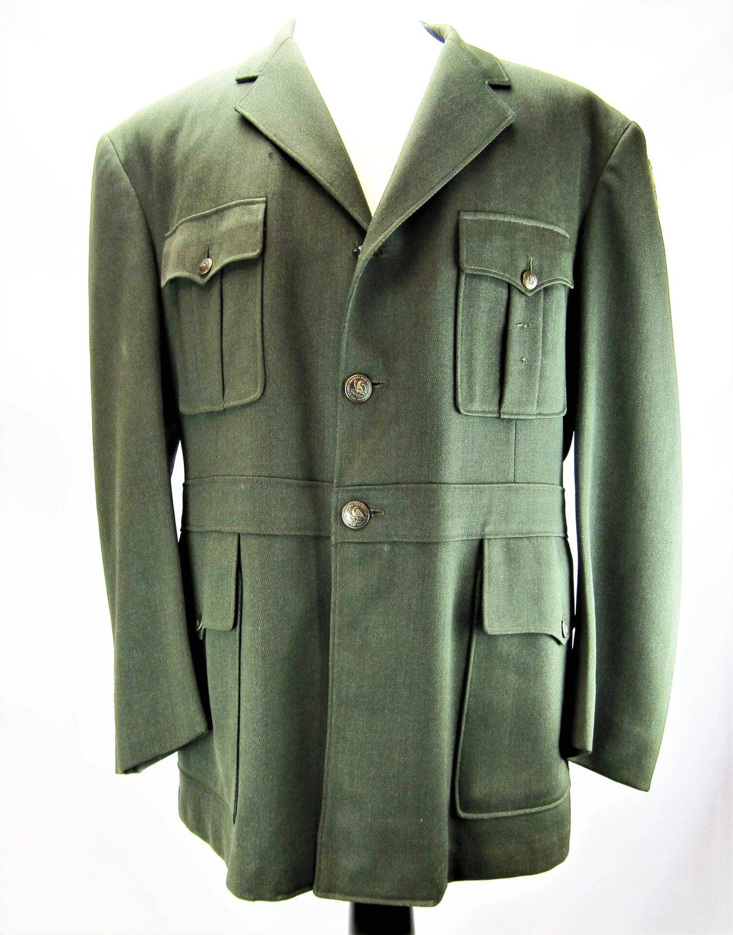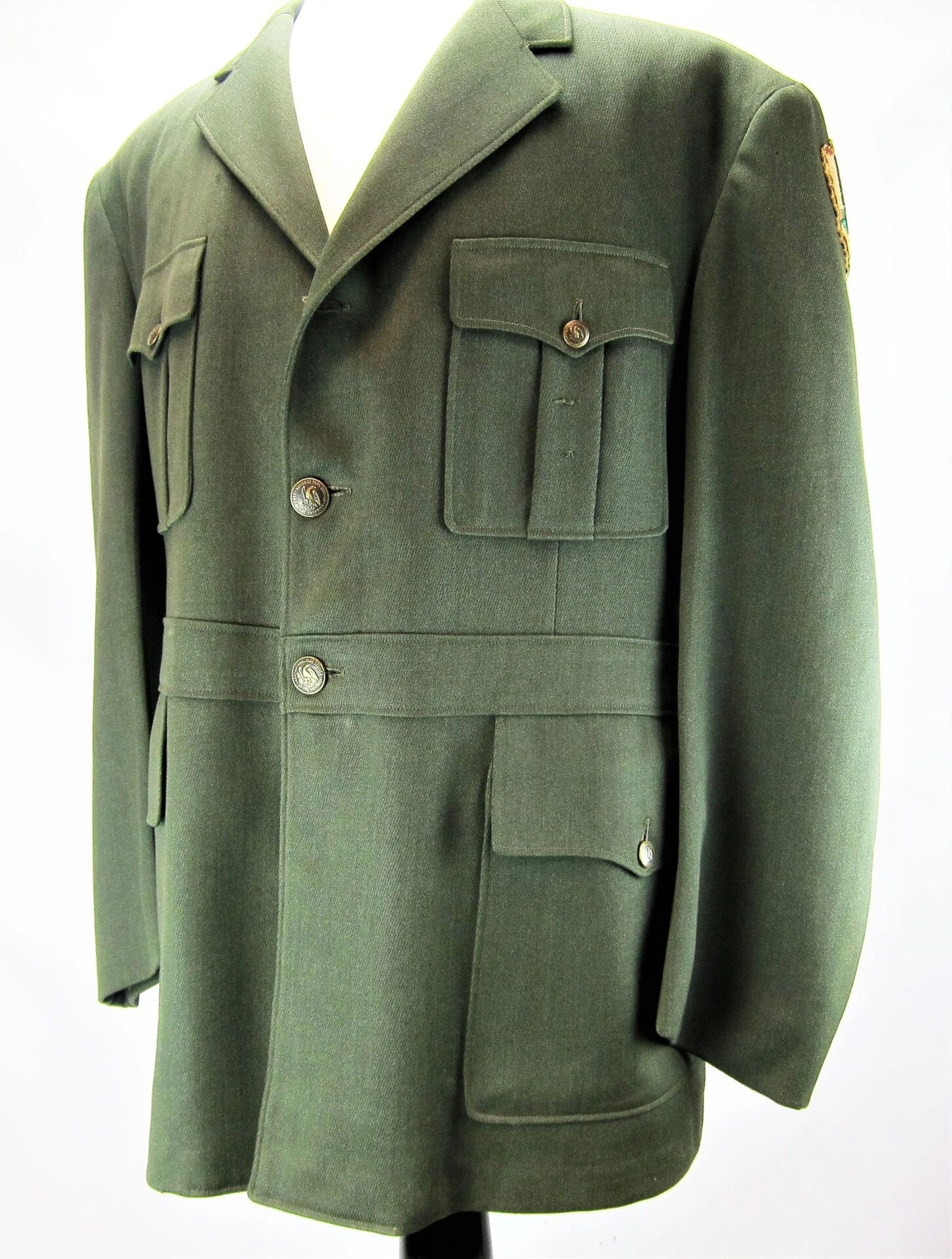 National Park Service Guide Uniform Jacket –  Sold  Ca 1950.  Excellent shape overall.  Would pair nicely with Inventory Number: UNI 046 National Park Service Hat which is not included but shown above for display purposes.  Inventory Number: UNI 045 / Sold