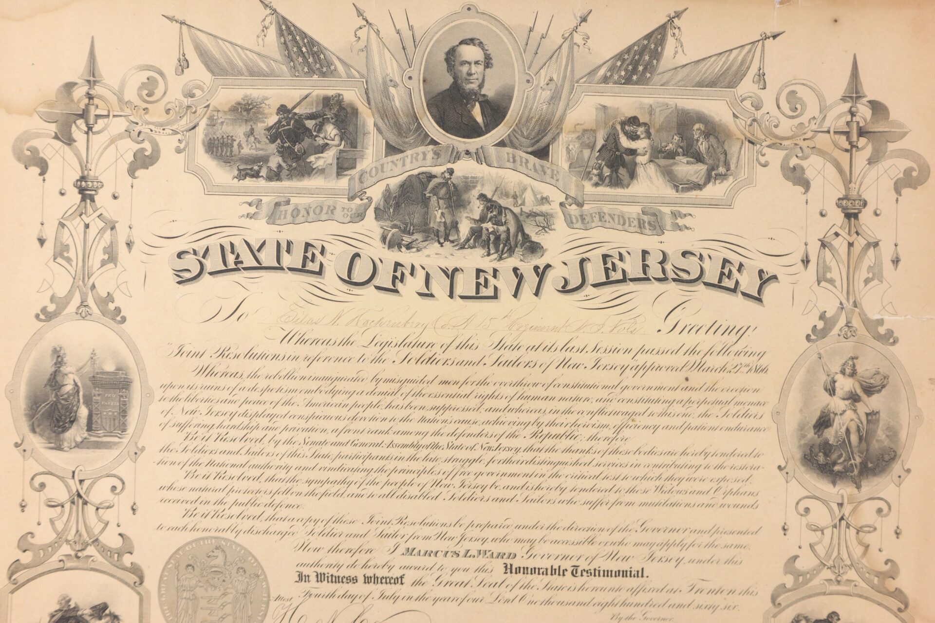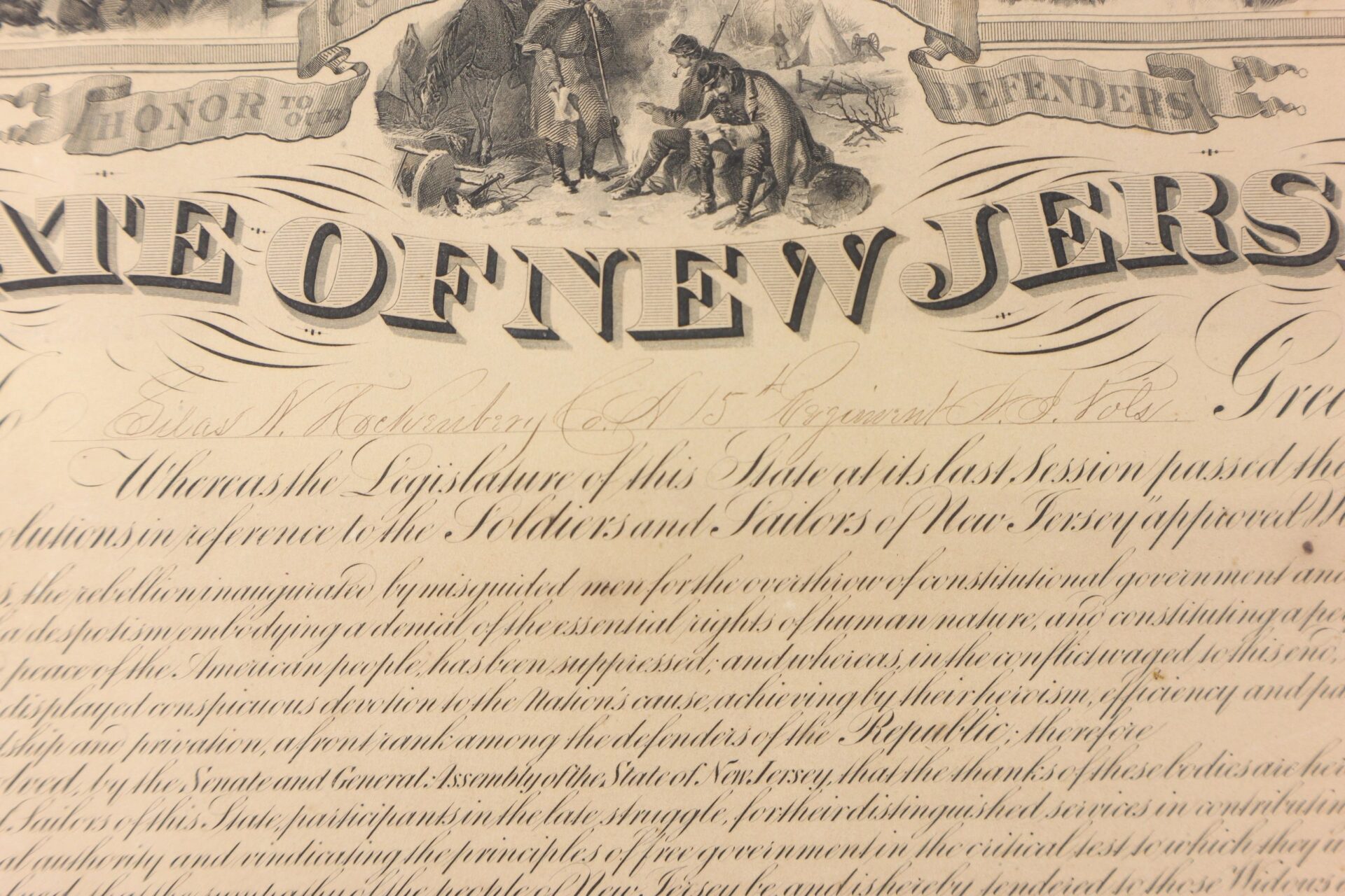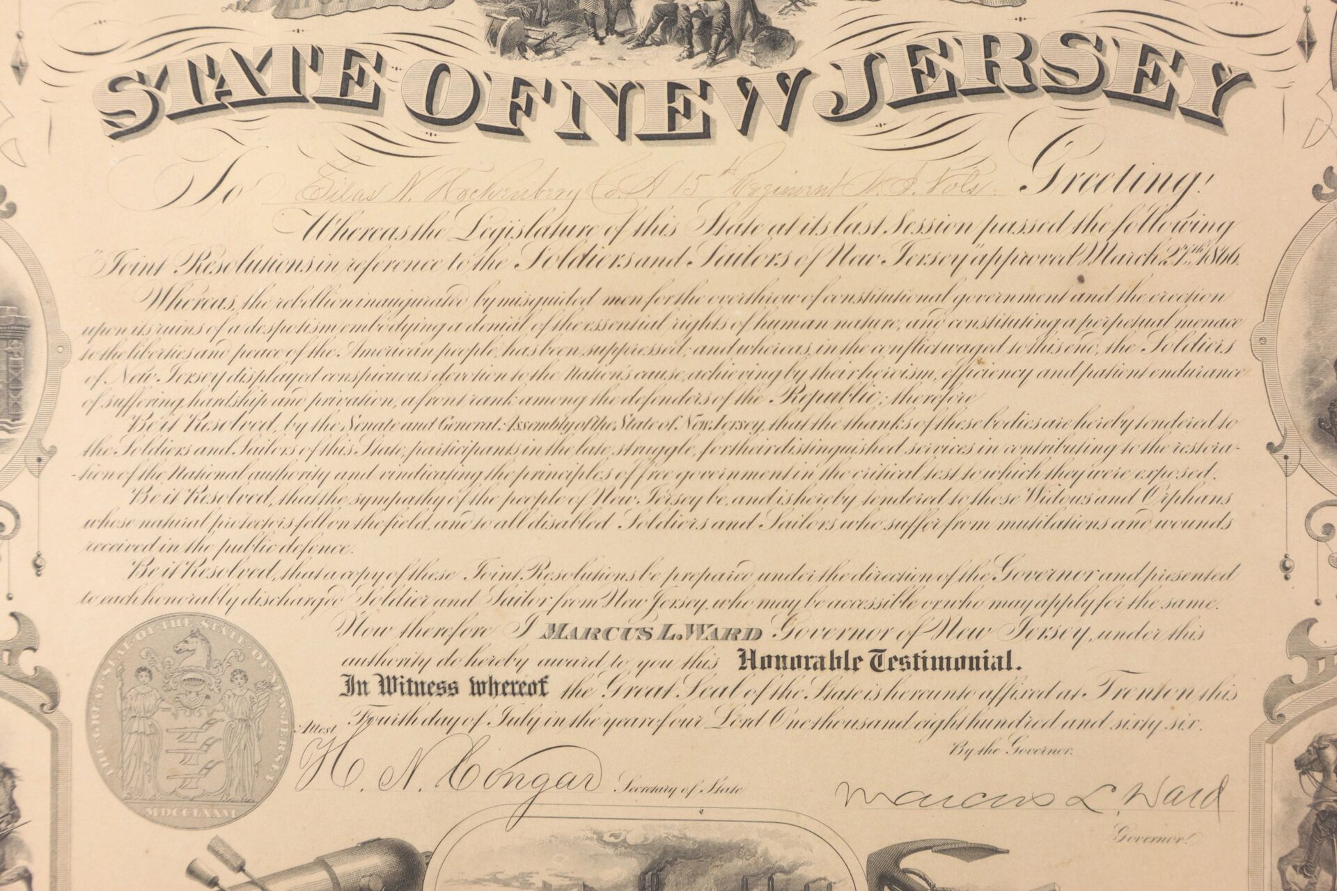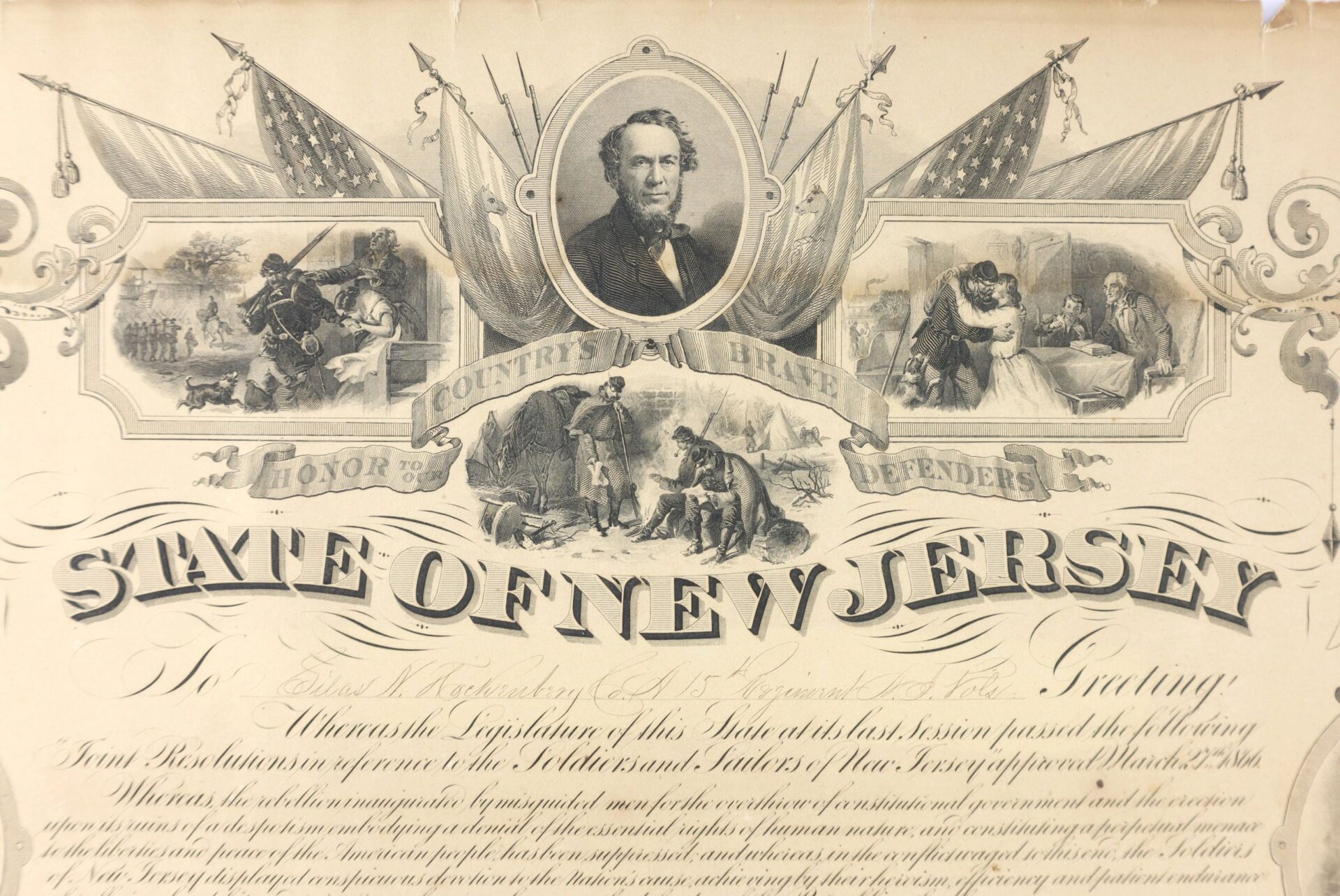 Signed by the Governor Marcus Ward and Presented to Silas Hockenbury of Co. “A” of the 15th New Jersey Infantry. Silas N. Hockenbury Residence was not listed; Enlisted on 8/9/1862 as a Private. On 8/25/1862 he mustered into “A” Co. NJ 15th Infantry He was Killed on 5/12/1864 at Spotsylvania Court House, VA Inventory Number: DOC 298 / SOLD