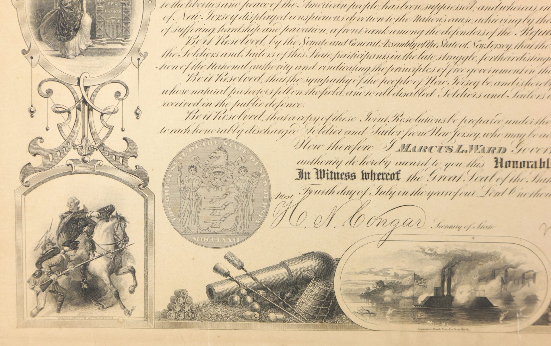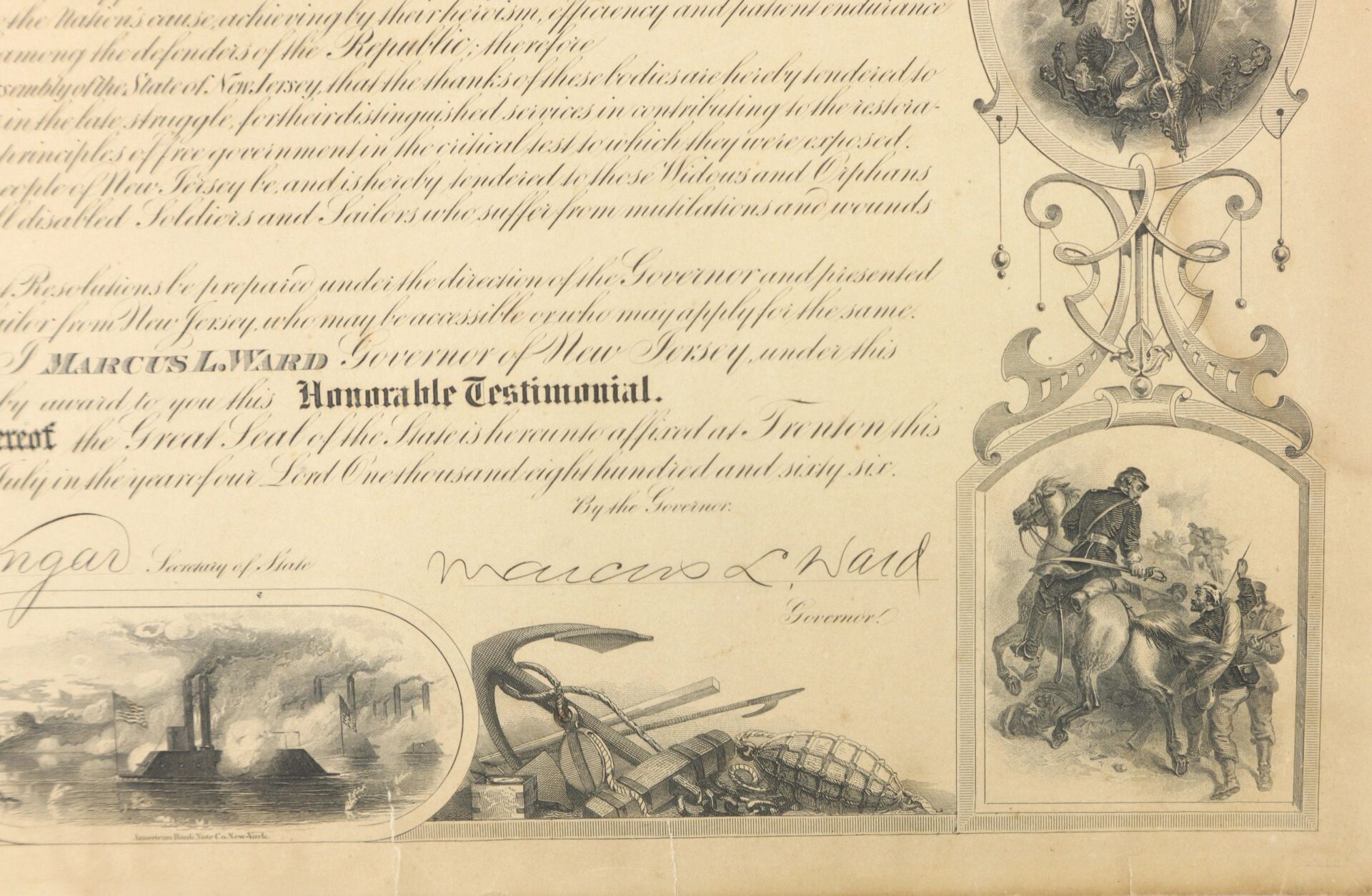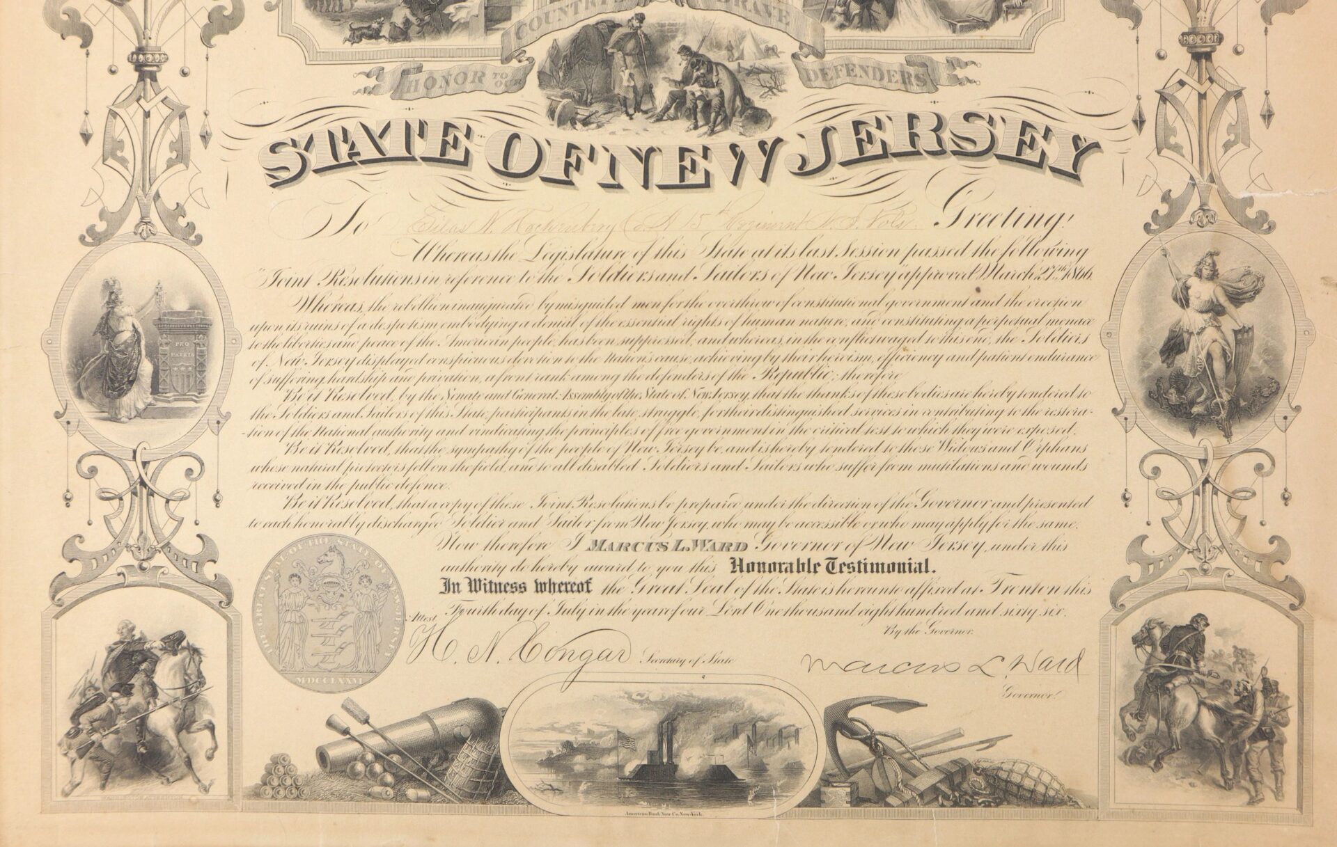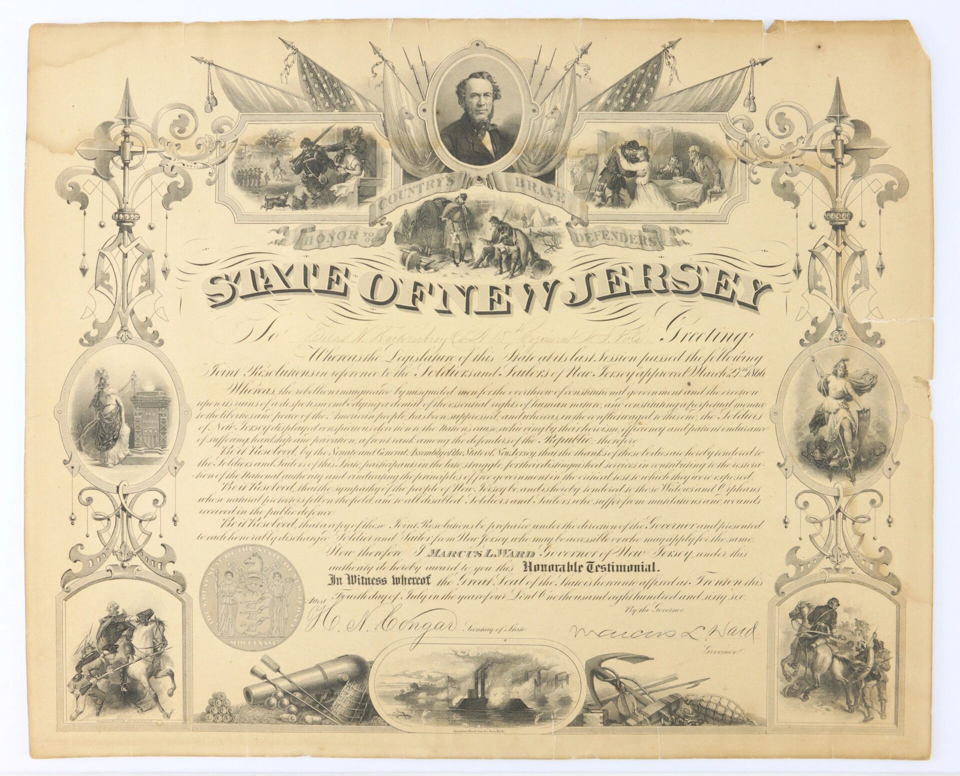 Signed by the Governor Marcus Ward and Presented to Silas Hockenbury of Co. “A” of the 15th New Jersey Infantry. Silas N. Hockenbury Residence was not listed; Enlisted on 8/9/1862 as a Private. On 8/25/1862 he mustered into “A” Co. NJ 15th Infantry He was Killed on 5/12/1864 at Spotsylvania Court House, VA Inventory Number: DOC 298 / SOLD