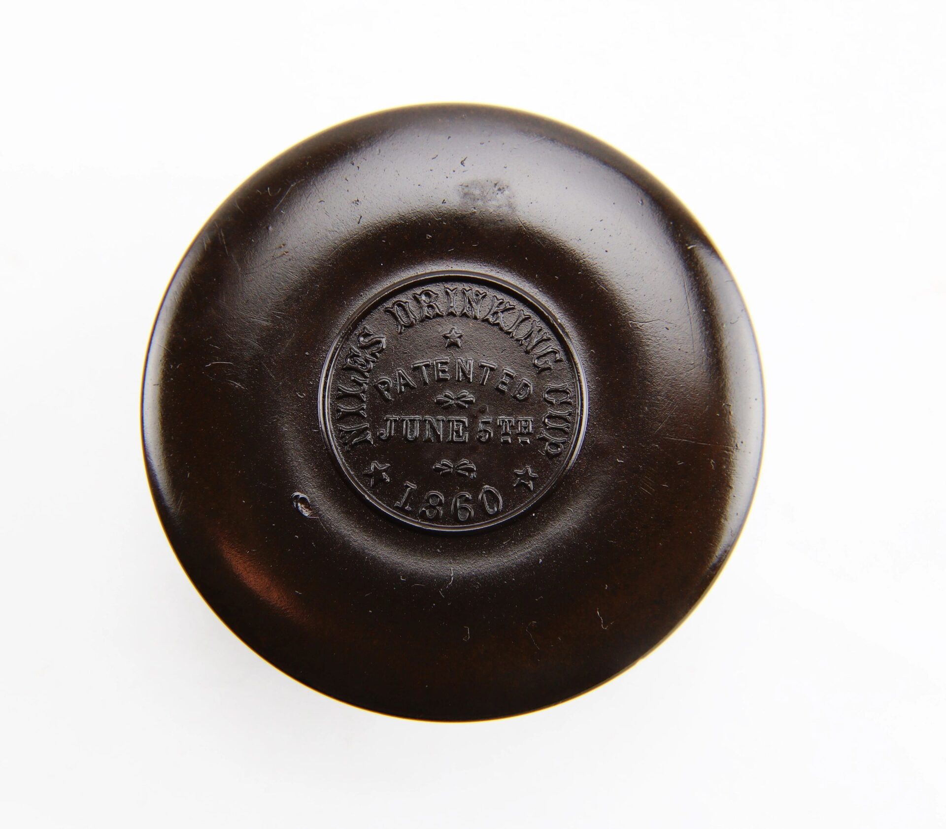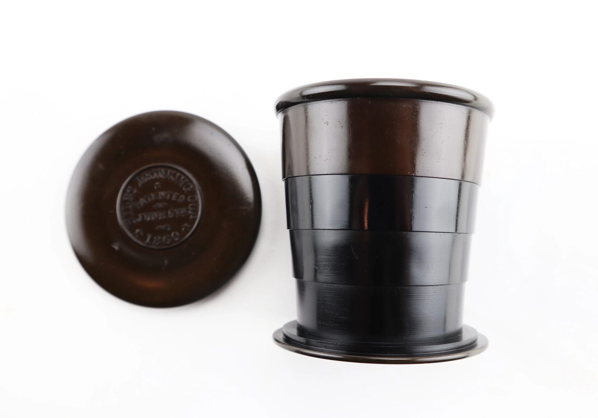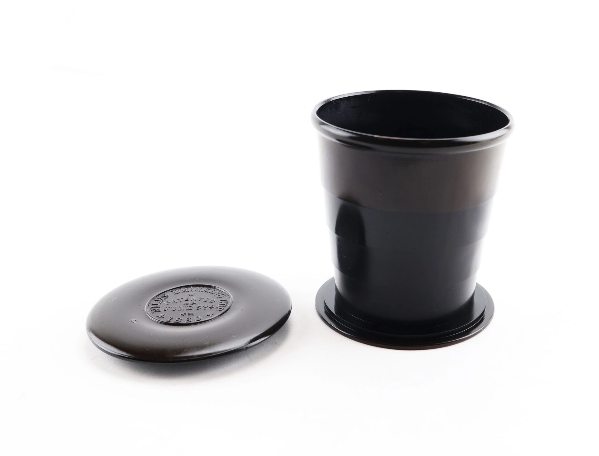 Nile’s Patent Drinking Cup – Inventory Number: CAM 346 / SOLD When Goodyear discovered and patented hard rubber in 1851, new devices were invented and the ingenious rushed to patent improvements on the old. Collapsible drinking cups in metal had been around for a while handy for travelers and carrying in one’s pocket. The India Rubber Comb Company rushed out an India rubber version as fast as they could. Peter Niles, however, went them one better. By adding a wide base, he stabilized the cup, prevented the concentric bands from slipping apart, and obviated the need for a separate container by simply supplying a lid that would meet the base.  This one is complete and very nice, with no chips or warping. The Niles 1860 patent information is perfectly legible in sharp, raised letters in a circle on the top of the lid. Designed, as were its forerunners, for convenient carrying and use, these fit in with collections of mess gear and personal items carried by soldiers, who were just as anxious as anyone to have the latest gadget that promised to make things easier. More than one was probably a gift from a well-meaning relative, along with patented inflatable rubber pillows, combination mess sets, combination writing, sewing and gaming kits, patent canteens, bullet-proof vests, and the like. Inventory Number: CAM 346 / SOLD