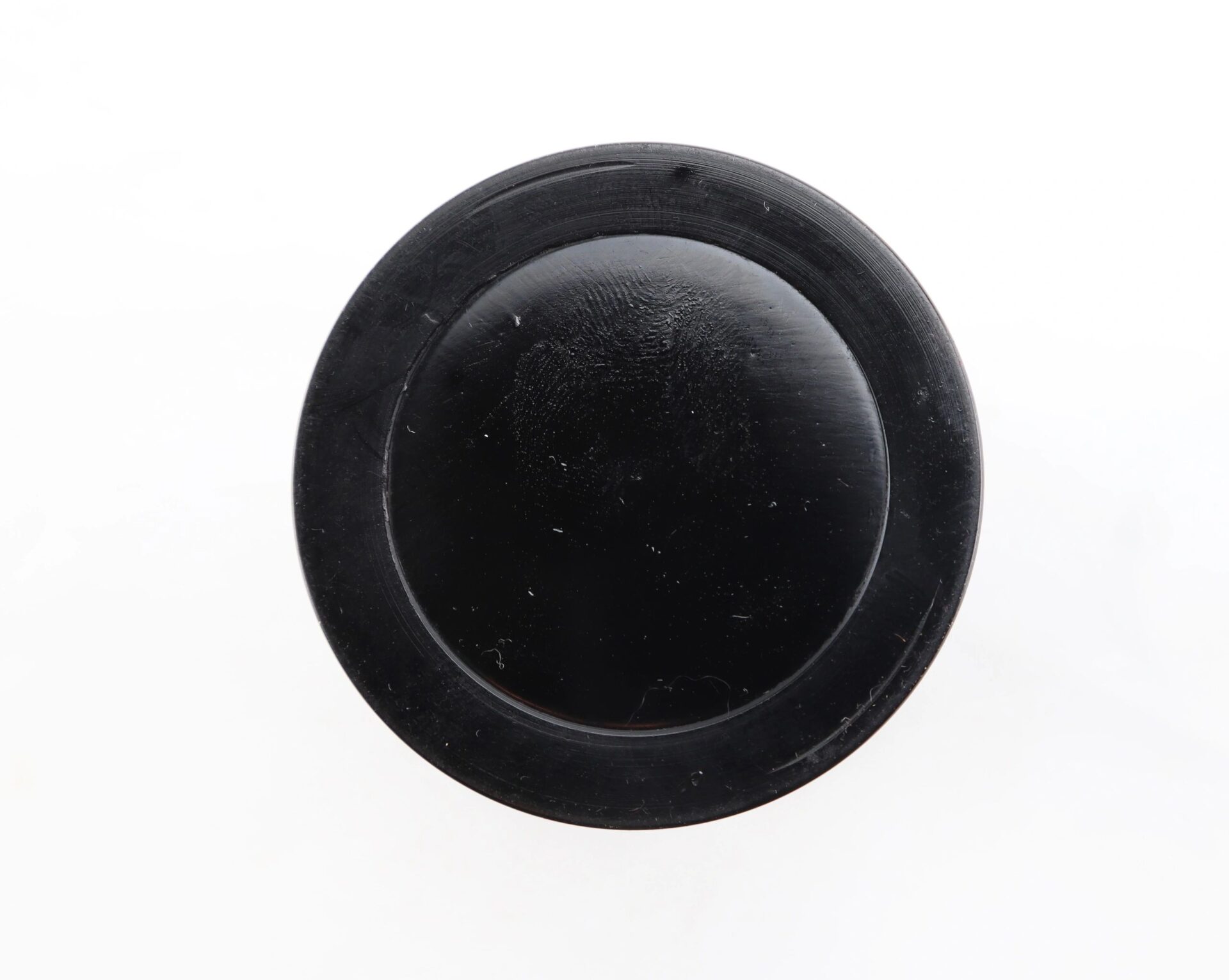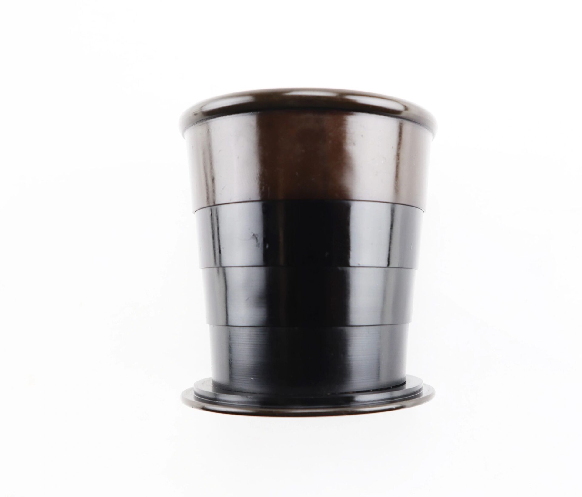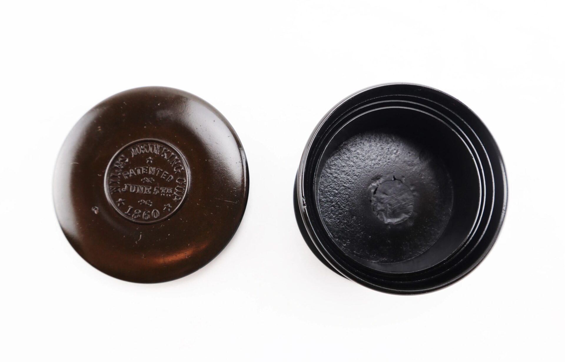 Nile’s Patent Drinking Cup – Inventory Number: CAM 346 / SOLD When Goodyear discovered and patented hard rubber in 1851, new devices were invented and the ingenious rushed to patent improvements on the old. Collapsible drinking cups in metal had been around for a while handy for travelers and carrying in one’s pocket. The India Rubber Comb Company rushed out an India rubber version as fast as they could. Peter Niles, however, went them one better. By adding a wide base, he stabilized the cup, prevented the concentric bands from slipping apart, and obviated the need for a separate container by simply supplying a lid that would meet the base.  This one is complete and very nice, with no chips or warping. The Niles 1860 patent information is perfectly legible in sharp, raised letters in a circle on the top of the lid. Designed, as were its forerunners, for convenient carrying and use, these fit in with collections of mess gear and personal items carried by soldiers, who were just as anxious as anyone to have the latest gadget that promised to make things easier. More than one was probably a gift from a well-meaning relative, along with patented inflatable rubber pillows, combination mess sets, combination writing, sewing and gaming kits, patent canteens, bullet-proof vests, and the like. Inventory Number: CAM 346 / SOLD