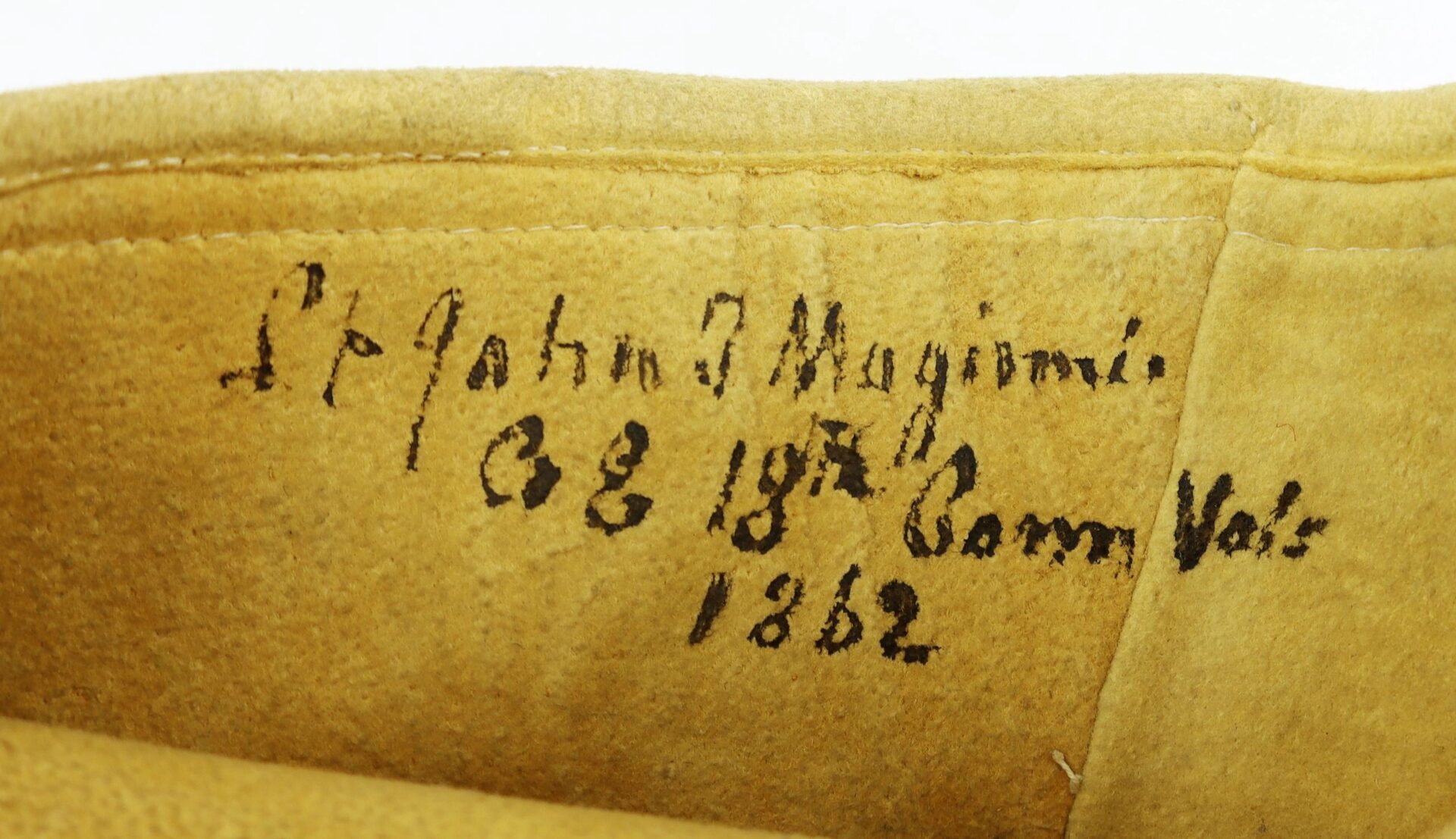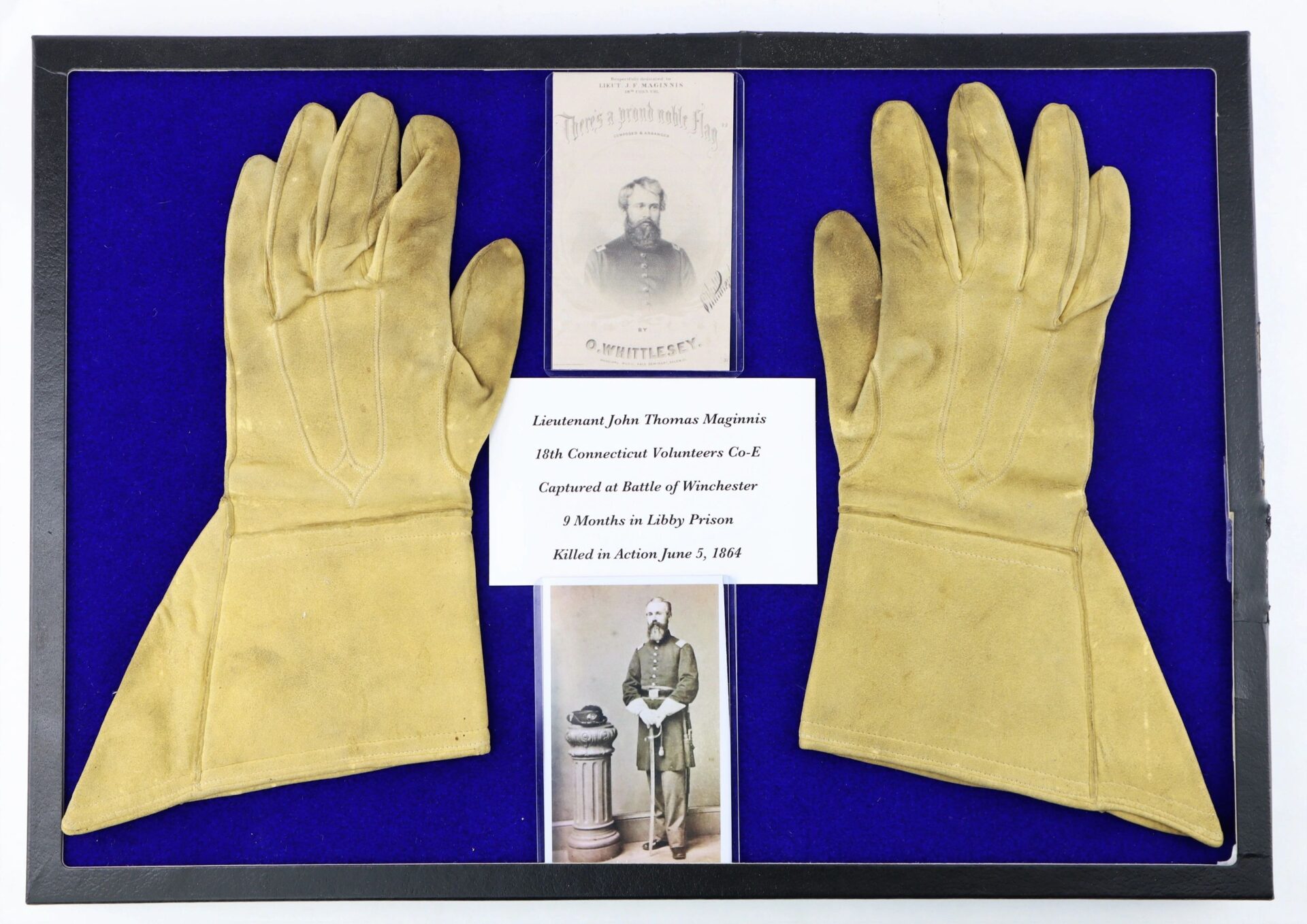 Officer’s Gauntlets of Lieutenant John Thomas Maginnis, 18th Connecticut Infantry Captured at Winchester and Held at Libby Prison  Killed at the Battle of Piedmont – Inventory Number: UNI 141 / SOLD Buckskin gauntlets worn by John Thomas Maginnis, who was commissioned as a lieutenant in the 18th Connecticut Infantry in August 1862. The regiment was part of the 8th Corps and suffered severely in killed and wounded at the Second Battle of Winchester during the Gettysburg Campaign, where the regiment was captured en masse. Lieutenant Maginnis was held for nine months at Libby Prison. The regimental history provides a brief account of Maginnis’ service.  “They were immediately marched to Libby Prison, Richmond, suffering greatly from fatigue, thirst and hunger, where they arrived June 23d, 1863. Lieut. McGinnis was not discharged until March 16th, 1864.  At one time while in prison he was very sick. From cold, privation and suffering he contracted a cough from which he never recovered. Receiving a furlough he returned home to his family for a few weeks, and though still suffering from illness, when his leave of absence expired he expressed an ardent desire to return to his regiment, many of whom he had not seen for ten months. His lungs were visibly affected. Many of his friends endeavored to have him obtain an extension of furlough, but his reply was: ‘My boys are already in the field; they are on the march; they need me. My country needs the help of every single arm. Of what account is my poor life, and of what account are the lives of a million men if thereby our nation is saved.’ It was hard parting from his family, but God gave him strength. He joined his regiment, then under Gen. Hunter, near Strasburg, Va, May 24th, 1864. His last words were true to himself and his great nature. He writes from Woodstock, Va.: ‘I regret that my health is not sufficiently good to justify much exposure, but poor as it is I wish you to know and feel that I shall not shirk my duty in the hour of trial.’  On the morning of Sunday, June 5th, 1864, Gen.Hunter’s command met the rebels, under Gen. Jones, at Piedmont, Va. Lieut. McGinnis led his company into action, and by his coolness and bravery, as in former battles, won the praise and admiration of his brother soldiers. At mid-day he fell mortally wounded in the left forehead, killed by an English Tower rifle ball.  ‘If I am to fall’ said he, ‘let it be on a victorious battlefield, amid the cheers of the boys in blue, and under the triumphant shadows of our noble flag.’ The prayer of the brave lieutenant was answered. He proved himself, like thousands of his countrymen, a true patriot, a brave soldier, a noble man. His name is honorably mentioned by Col. Ely, of the Eighteenth Regiment, in his report to the adjutant general, ‘as a valuable officer, who in camp inspired the soldiers to excel in the faithful discharge of military duties, and on the battle-field encouraged the men by gallant examples.’ One who knew him best has written: ‘Lieut. McGinnis was an honest, upright, whole-souled man; everywhere and under all circumstances a true gentleman. No officer in the regiment had more attached and devoted friends than he, and among his military companions, as well as in a wide circle of relatives and friends, his loss will be deeply and sincerely felt.’ Each gauntlet has an ink inscription by Maginnis with his company, regiment, and “1862”. They remain in very good condition with supple leather and light soiling from use. The gauntlets are housed in a wood and glass display case, and the lot includes a binder with additional information on Maginnis and the 18th Connecticut, as well as copies of photographs of Maginnis wearing these exact gloves. A wonderful identified pair of gauntlets from a brave Union officer.  John T. Maginnis – Residence Salem CT; Enlisted on 7/25/1862 as a 2nd Lieutenant. On 8/18/1862 he was commissioned into “E” Co. CT 18th Infantry. He was Killed on 6/5/1864 at Piedmont, VA. He was listed as: POW 6/15/1863 Winchester, VA (Confined at Macon, GA). Paroled 3/14/1864 Macon, GA. Promotions: 1st Lieut 12/26/1862. . CONNECTICUTEIGHTEENTH REGIMENT C. V. INFANTRY.(Three Years.) WRITTEN BY BVT. BRIGADIER-GENERAL WILLIAM G. ELY, LATE COLONEL OF THE EIGHTEENTH CONNECTICUT VOLUNTEERS.      AUGUST 4,1862, in response to the call of Governor William A. Buckingham, the formation of the Eighteenth Regiment Connecticut Volunteers was begun at Camp Aiken, Norwich, Conn., under the supervision of General Daniel Tyler.  August 11th Colonel William G. Ely, who had been promoted from the lieutenant-colonelcy of the Sixth Regiment, took command.  Officers and men were inspired with patriotic enthusiasm, and in eleven days left Norwich with a full regiment, composed of the best blood of New London and Windham Counties.  They marched under elegant colors, presented by the ladies of Norwich.      August 24th the regiment camped at Fort McHenry, Baltimore, and remained in that vicinity until ordered to the Shenandoah Valley, May 22, 1863.  Its first battle was at Winchester, Va., June 13th, 14th, and 15th, under General Milroy’s command.  The engagement was disastrous to the Union forces.  Milroy had but 7,000 men, and his opponent, General Early, 30,000, and 87 field guns.  The Eighteenth won unqualified praise from General Milroy for its desperate fighting.  In a third and last charge it wholly disabled a Confederate battery; but it had charged into the center of General Johnson’s Division, 9,000 strong, and 500 of its men were captured.  General Walker, of Stonewall Jackson’s Brigade, generously praised the valor and discipline of the Eighteenth Regiment, and returned Colonel Ely’s sword to him on the battle-field.  Color-Sergeant George Torrey escaped with the regimental colors.  General Milroy met the Eighteenth at Martinsburg, on their return from rebel prisons, and made the follow