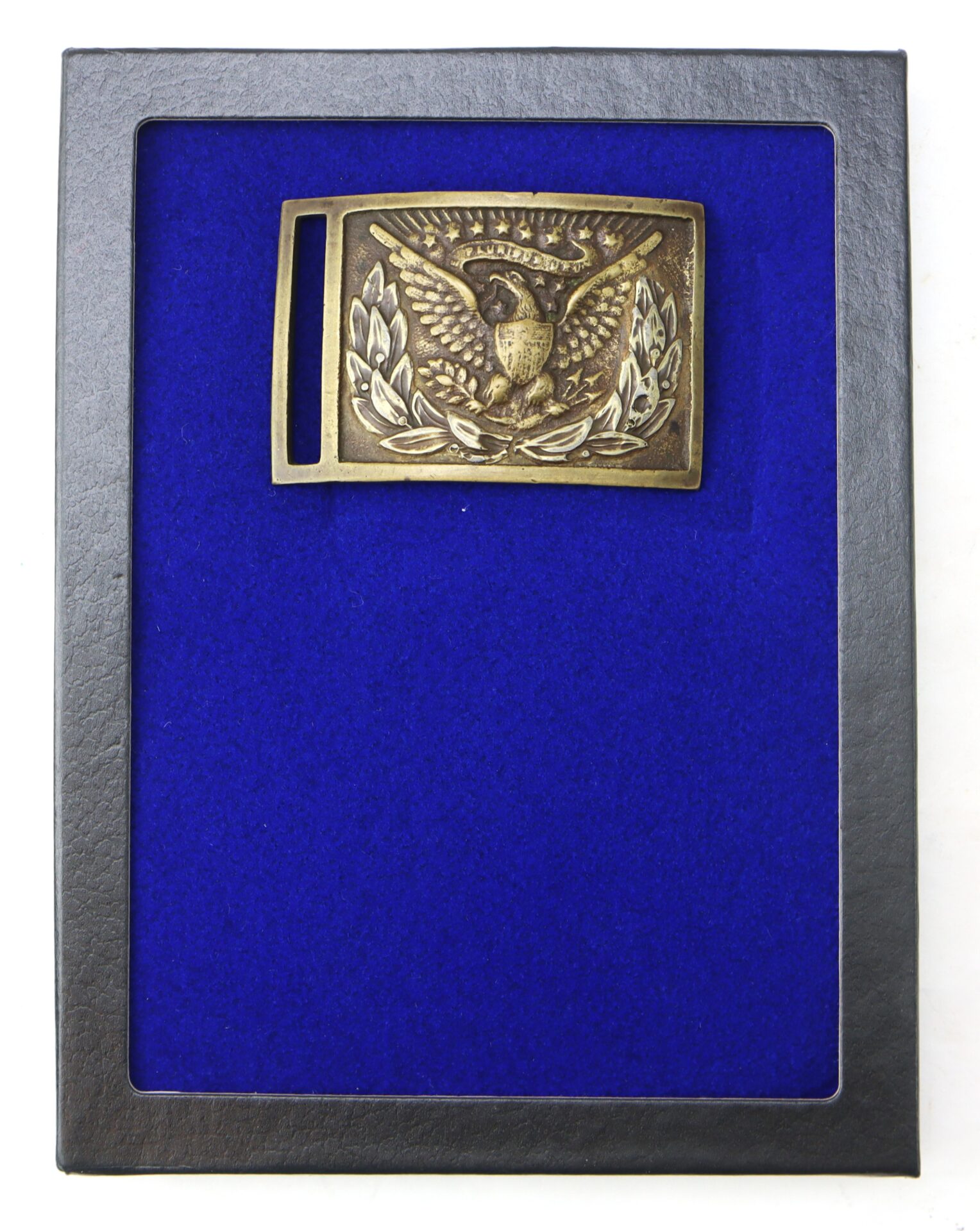 This is the sword belt plate worn by non-commissioned officers in the Union Army and by more than a few Confederate officers. Features an American eagle on the front with wings spread high grasping a banner in its beak that reads “E PLURIBUS UNUM”. The wreath is separately applied silver as is regulation for this belt plate. The plate retains a nice patina and is an attractive example.
