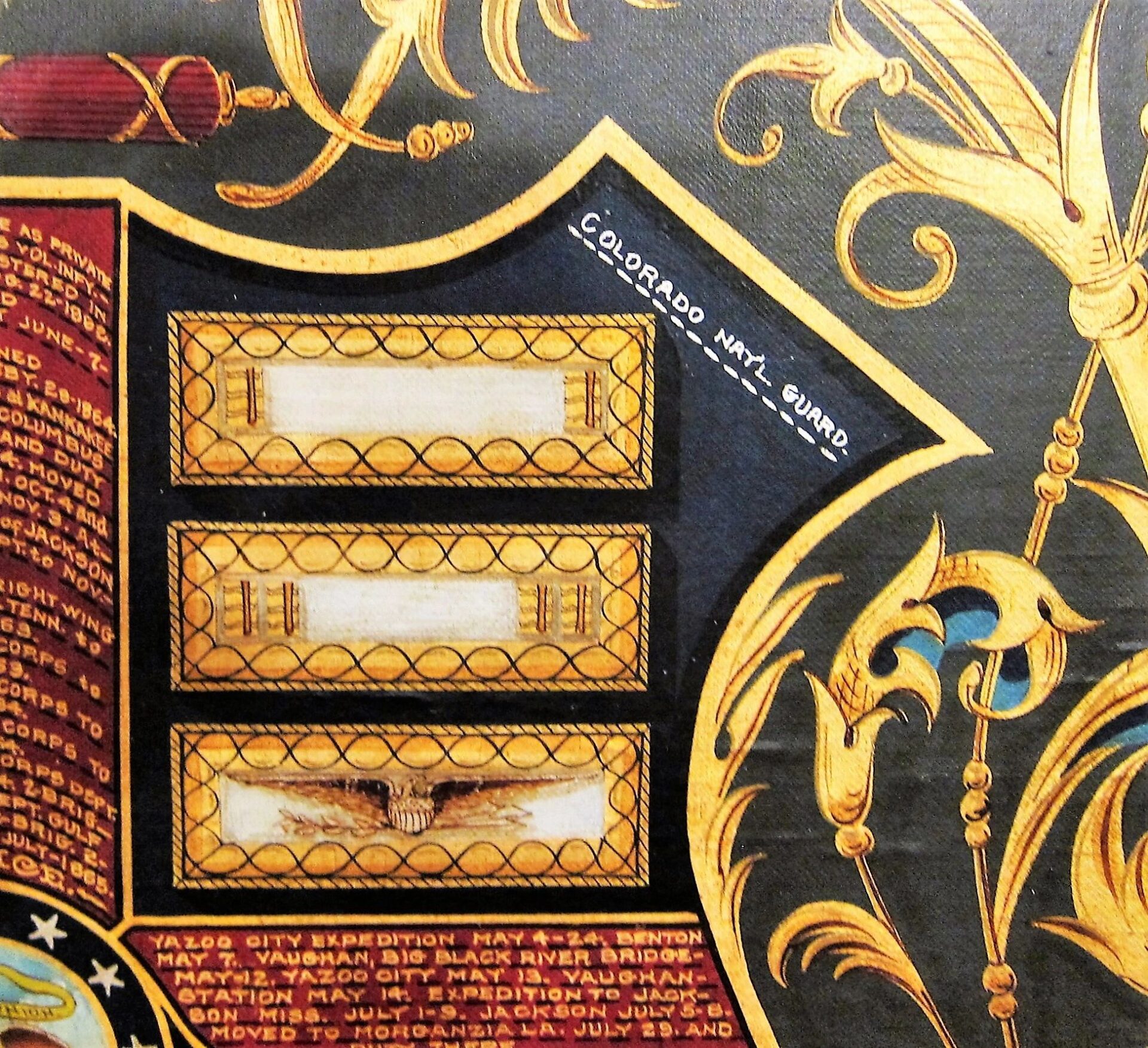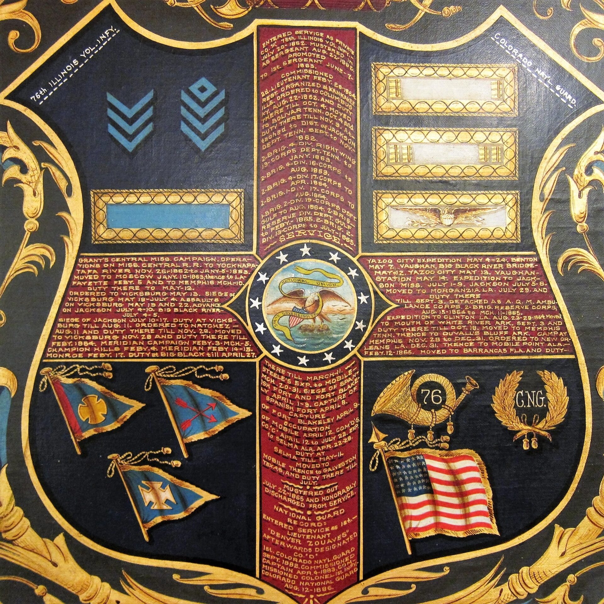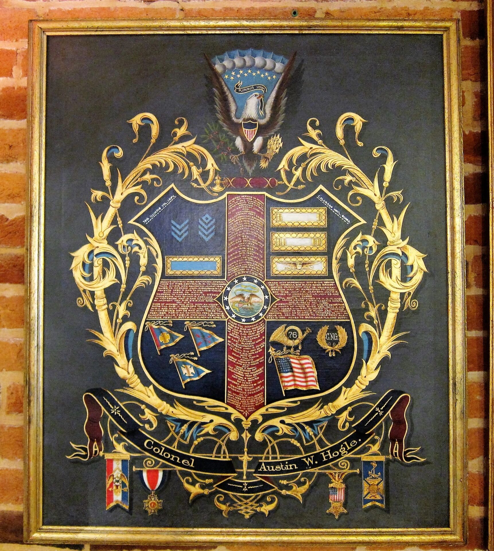 The likeness of Hogle is painted as a 2nd Lieutenant , which dates the painting between February 28, 1864 and July 22, 1865, during which he received his commission. A seated Hogle wears a frock coat and 2nd Lt. of Infantry shoulder bars. He is shown with a distant gaze. A US flag is draped over a column to his right. Frame measures approximately 30 3/4″ x 35 5/8″, canvas 25″ x 29 3/4″. Civil War Escutcheon of Colonel Austin W. Hogle, 76th Illinois Volunteer Infantry – This magnificent escutcheon has a large, full color, spread winged eagle, with a Federal shield on its chest. It’s head is turned to it’s left and in its beak it holds a ribbon that reads “E PLURIBUS UNUM.” In his left talons he holds 13 arrows and in his right an olive branch with berries. Above the eagle, between his wings, are 13 gold stars. Below the eagle is a shield divided into 4 sections by a red cross. Hogle’s military service is painted in gold upon the four arms of the cross. Dividing the shield into four quadrants. At the center of this cross is the great seal of the United States, with an Eagle holding a ribbon in it’s beak that reads, “NATIONAL UNION / STATE SOVEREIGNITY”. The upper left quadrant denotes Hogle’s chevrons of Sergeant and 1st Sergeant, as well as his Lieutenant of Infantry bar. Painted in white letters above this sections is, “76th ILLINOIS VOL. INF.” The upper right quadrant depicts 1st Lt, 2nd Lt, and Colonel’s Shoulder bars. Painted in white letters above this is, “COLORADO NAT’L GUARD”.