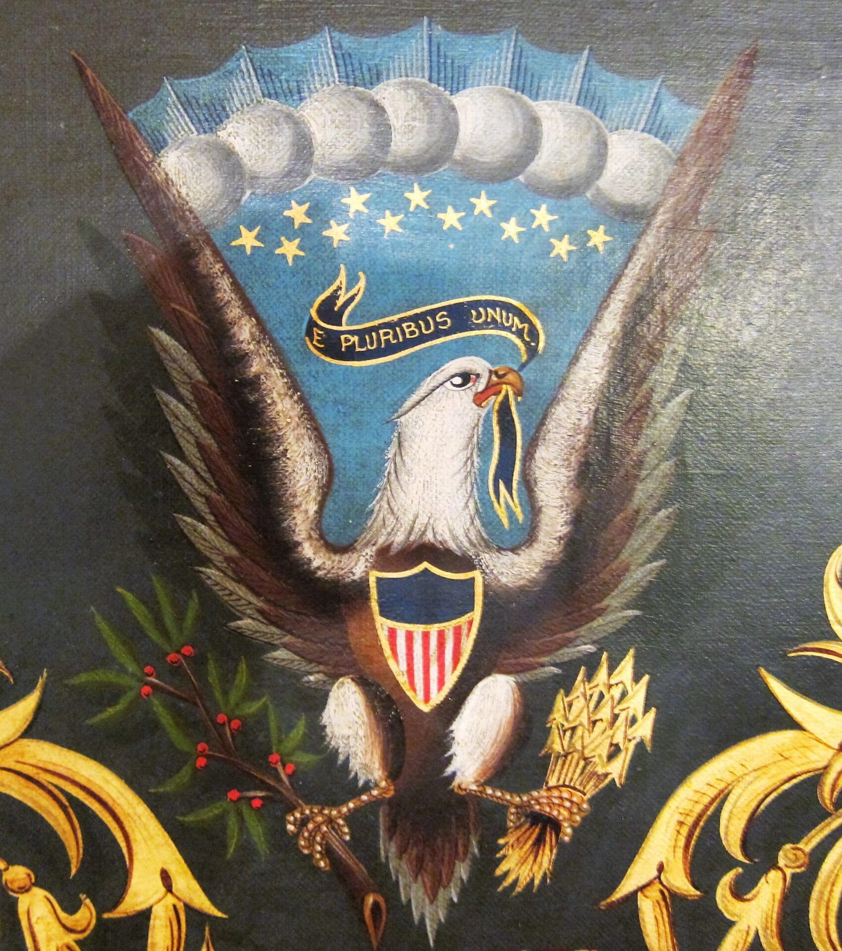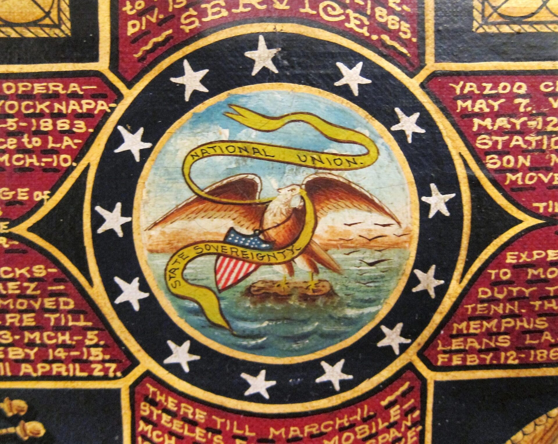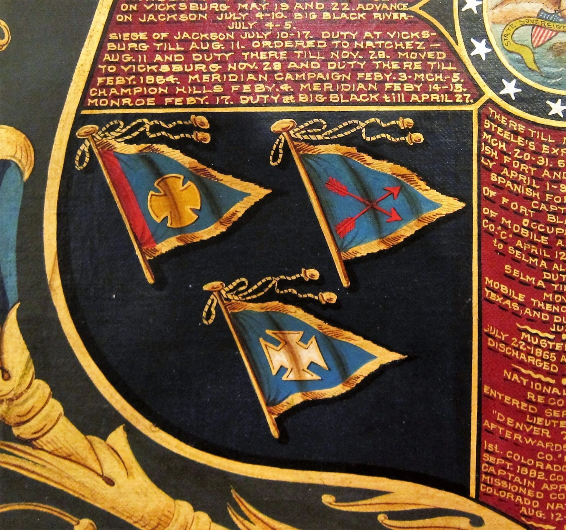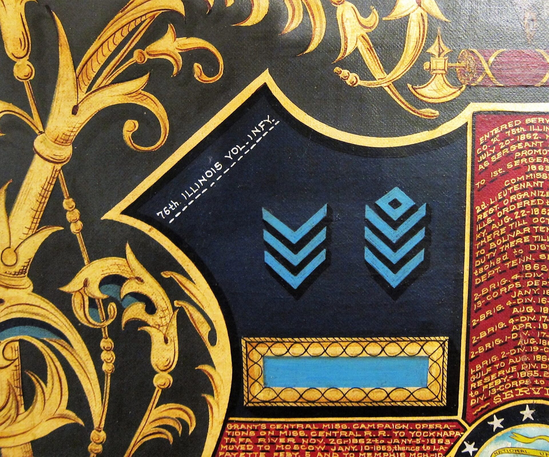 The likeness of Hogle is painted as a 2nd Lieutenant , which dates the painting between February 28, 1864 and July 22, 1865, during which he received his commission. A seated Hogle wears a frock coat and 2nd Lt. of Infantry shoulder bars. He is shown with a distant gaze. A US flag is draped over a column to his right. Frame measures approximately 30 3/4″ x 35 5/8″, canvas 25″ x 29 3/4″. Civil War Escutcheon of Colonel Austin W. Hogle, 76th Illinois Volunteer Infantry – This magnificent escutcheon has a large, full color, spread winged eagle, with a Federal shield on its chest. It’s head is turned to it’s left and in its beak it holds a ribbon that reads “E PLURIBUS UNUM.” In his left talons he holds 13 arrows and in his right an olive branch with berries. Above the eagle, between his wings, are 13 gold stars. Below the eagle is a shield divided into 4 sections by a red cross. Hogle’s military service is painted in gold upon the four arms of the cross. Dividing the shield into four quadrants. At the center of this cross is the great seal of the United States, with an Eagle holding a ribbon in it’s beak that reads, “NATIONAL UNION / STATE SOVEREIGNITY”. The upper left quadrant denotes Hogle’s chevrons of Sergeant and 1st Sergeant, as well as his Lieutenant of Infantry bar. Painted in white letters above this sections is, “76th ILLINOIS VOL. INF.” The upper right quadrant depicts 1st Lt, 2nd Lt, and Colonel’s Shoulder bars. Painted in white letters above this is, “COLORADO NAT’L GUARD”.