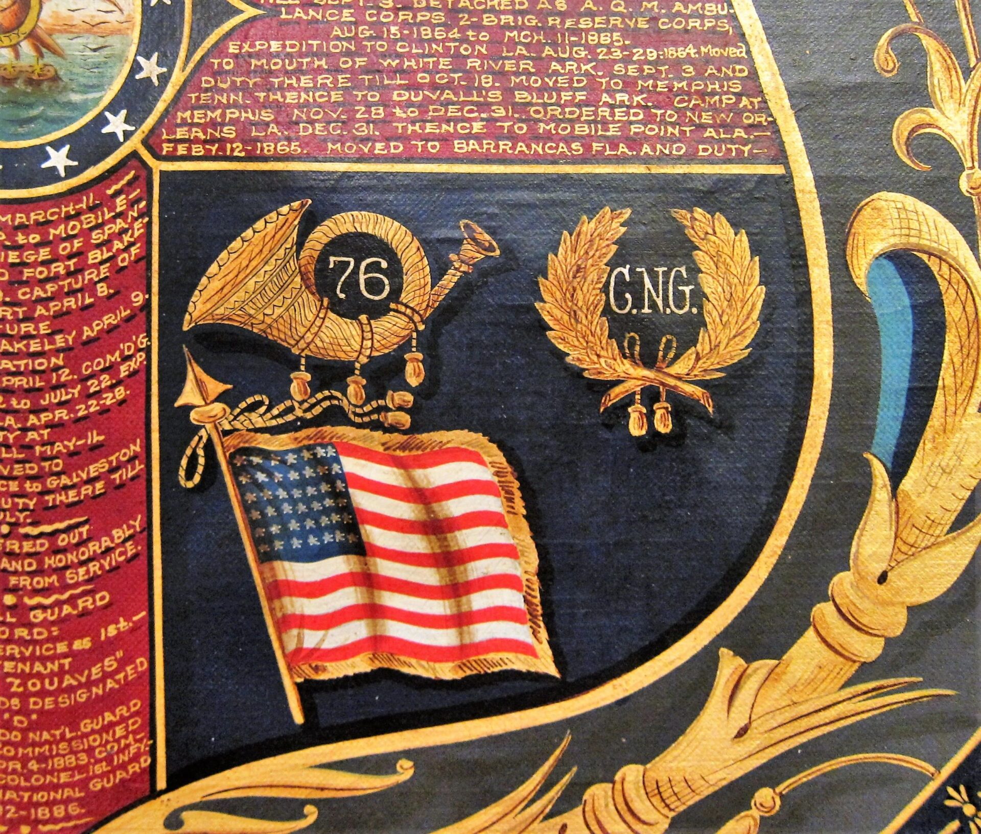 The Regiment returned to Vicksburg May 21, and occupied its camp on the hills until June 26, when it was moved to Mount Albans, on the railroad between Vicksburg and the Big Black River. On the 28th moved back to Vicksburg and camped near its old quarters. On July 1, 1864, the Regiment started on an expedition to Jackson, commanded by General Slocum. On its return the command was met between Jackson and Clinton by the enemy, and a sharp battle was fought on the 6th, and renewed on the 7th, when the Seventy-sixth, which bore a prominent part in the engagement, was cut off from the balance of the command, but cut its way out, losing one hundred and two men, sixteen of whom were reported killed and left on the field, and eighty-six wounded and missing. The Regiment returned to Vicksburg July 9, much fatigued. On July 29 the Regiment embarked, and was run down the river on a marine boat to Morganzia; landed there, and remained camped along the levee until August 23, when it was embarked and was transported down the river to Port Hudson; landed and marched, with five days’ rations, in great haste, night and day, to Clinton, expecting to annihilate the enemy in that vicinity, but he fled before the Yankee hosts. The Regiment returned to Morganzia, arriving there August 29, foot-sore and weary. On September 3 the Regiment embarked on the steamer Nebraska, and moved up the Mississippi River to the mouth of White River, landed and camped on the Arkansas shore, and remained until October 18, when it was ordered to Memphis, Tenn., but returned October 28, and occupied quarters there until November 7, when it embarked and moved up White River to Duvall’s Bluff, Arkansas, where it built neat log cabins, and fixed to stay; but, in obedience to orders, it broke up its pleasant camp on the 28th , embarked, and was landed at Memphis, Tenn., on the 30th, and camped on the environs of the city; remained there until December 31, 1864, and was then ordered to embark on the steamer Niagara for New Orleans, at which place it arrived January 4, 1865, and went into camp a few miles above the city, at Kenner, behind the levee, where the mud was almost fathomless. Remained there until February 12, when the Regiment was ordered to embark on Gulf steamers and proceed across the Gulf to Mobile Point. The Regiment was divided, and carried on three different crafts. The George Peabody carried the Regimental Headquarters, with four companies of the Seventy-sixth, and parts of other regiments, and a large number of horses, mules and wagons. A terrible storm on the Gulf nearly wrecked the craft. The horses, mules and wagons were consigned to the deep, and the boat was barely gotten back to the Mississippi River with its human freight. Went back to New Orleans, crossed over to Lake Pontchartrain, embarked on the steamer Alice Vivian, and moved by the lakes to Fort Morgan, and from there to Fort Barrancas, near Pensacola, Florida, where the Regiment was again united, February 18, and went into camp, and remained there until March 11, when the camp was moved to Pensacola. On March 20, the Regiment started with General Steel’s expedition to Spanish Fort and Fort Blakely, near Mobile Alabama. Traveled through pine swamps, corduroying the quicksand roads as it moved along, and fighting the enemy in front, until April 1, when the Army approached Blakely, and on the 2nd drove the enemy inside his fortifications. General Steel’s forces united with General Canby’s and General Granger’s, from Fort Morgan. On April 8 Spanish Fort was captured, and April 9 the Seventy-sixth participated in the charge on Fort Blakely, capturing the entire garrison. The colors of the Seventy-sixth were the first planted on the enemy’s works. The Regiment lost in this, the last battle of the war, seventeen killed and eighty-one wounded. Among the latter was the colonel of the Regiment, who was painfully wounded while gallantly leading his men in the assault. The Regiment camped inside the fortifications until April 20, when it was transported to Mobile. On the 22d of April the regiment accompanied a fleet of steamers, loaded with soldiers, up the Alabama River, General Steel in command; landed at Selma, Alabama, April 28; remained there until May 11, and was then ordered back to Mobile, and camped near the city. Remained there doing duty until the latter part of June, when it was ordered to Galveston, Texas, where it remained until July 22, and was then mustered out, and ordered to Chicago, Illinois, where it was paid off and disbanded August 4, 1865.