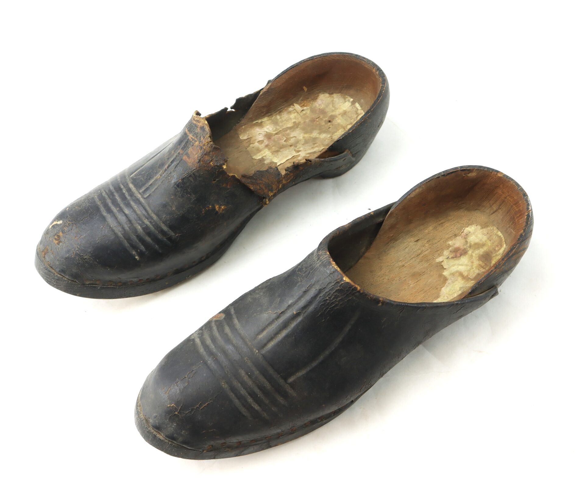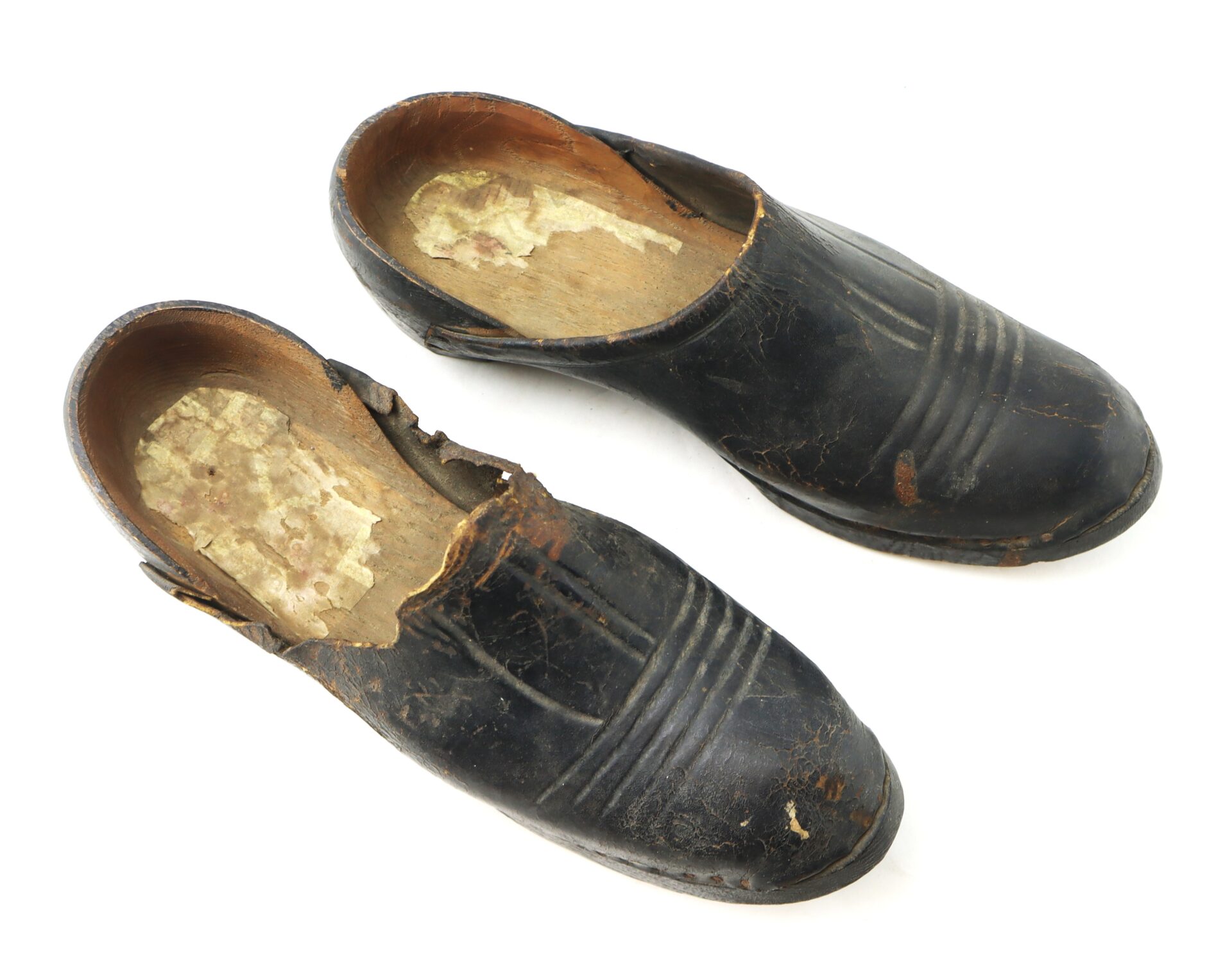 A remarkable pair of original shoes from upstate New York near Saratoga Springs and dating to the 1700s. Each shoe is constructed with carved wooden soles and retains its original tooled leather uppers, decorated with simple line designs across the vamp. The pair reflects the sturdy utilitarian footwear of the colonial and early republic period, with low heels and pegged construction typical of 18th century craftsmanship. Surviving examples of everyday footwear from this era are uncommon, as most were heavily worn and discarded. These shoes display significant age and wear, with losses to the leather and portions of the uppers, a relic of early American domestic life. Condition: Fragile overall with cracks, flaking, and losses to leather uppers; wooden soles intact with expected wear.