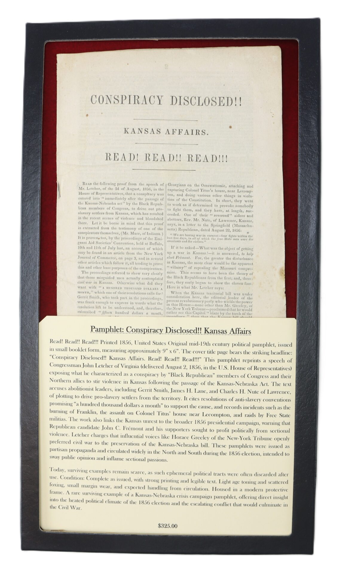 Read! Read!! Read!!! Printed 1856, United States Original mid-19th century political pamphlet, issued in small booklet form, measuring approximately 9” x 6”. The cover title page bears the striking headline: “Conspiracy Disclosed!! Kansas Affairs. Read! Read!! Read!!!” This pamphlet reprints a speech of Congressman John Letcher of Virginia (delivered August 2, 1856, in the U.S. House of Representatives) exposing what he characterized as a conspiracy by “Black Republican” members of Congress and their Northern allies to stir violence in Kansas following the passage of the Kansas-Nebraska Act. The text accuses abolitionist leaders, including Gerrit Smith, James H. Lane, and Charles H. Nute of Lawrence, of plotting to drive pro-slavery settlers from the territory. It cites resolutions of anti-slavery conventions promising “a hundred thousand dollars a month” to support the cause, and records incidents such as the burning of Franklin, the assault on Colonel Titus’ house near Lecompton, and raids by Free State militias. The work also links the Kansas unrest to the broader 1856 presidential campaign, warning that Republican candidate John C. Frémont and his supporters sought to profit politically from sectional violence. Letcher charges that influential voices like Horace Greeley of the New-York Tribune openly preferred civil war to the preservation of the Kansas-Nebraska bill. These pamphlets were issued as partisan propaganda and circulated widely in the North and South during the 1856 election, intended to sway public opinion and inflame sectional passions.