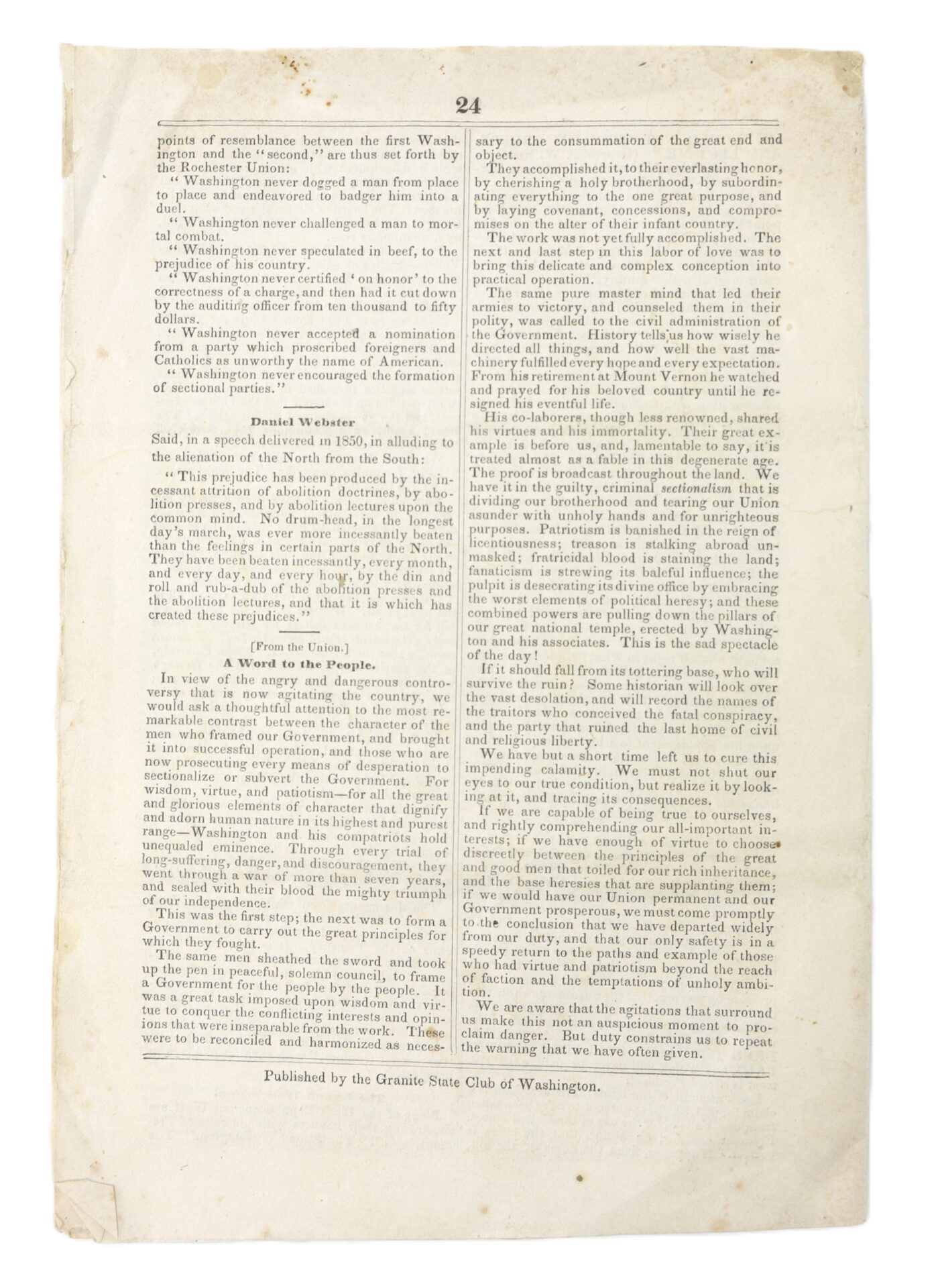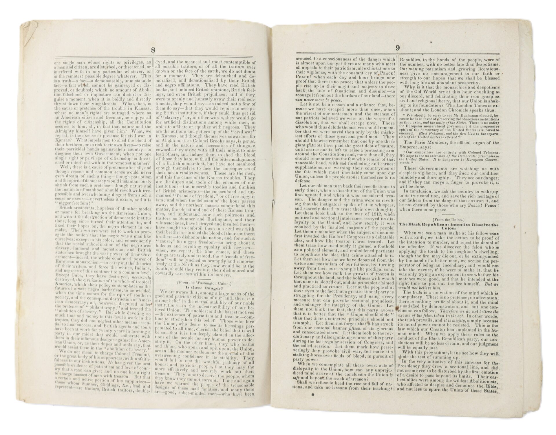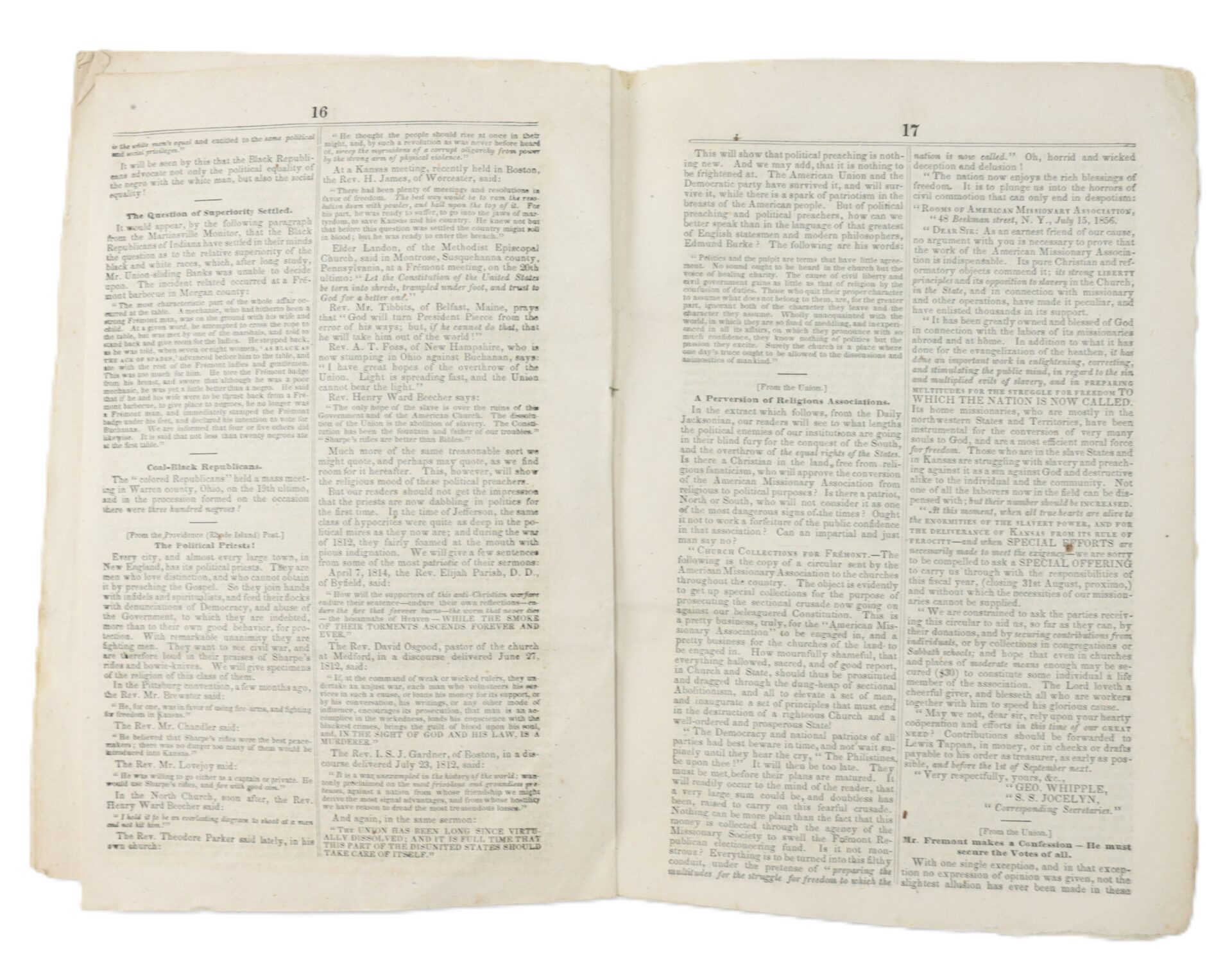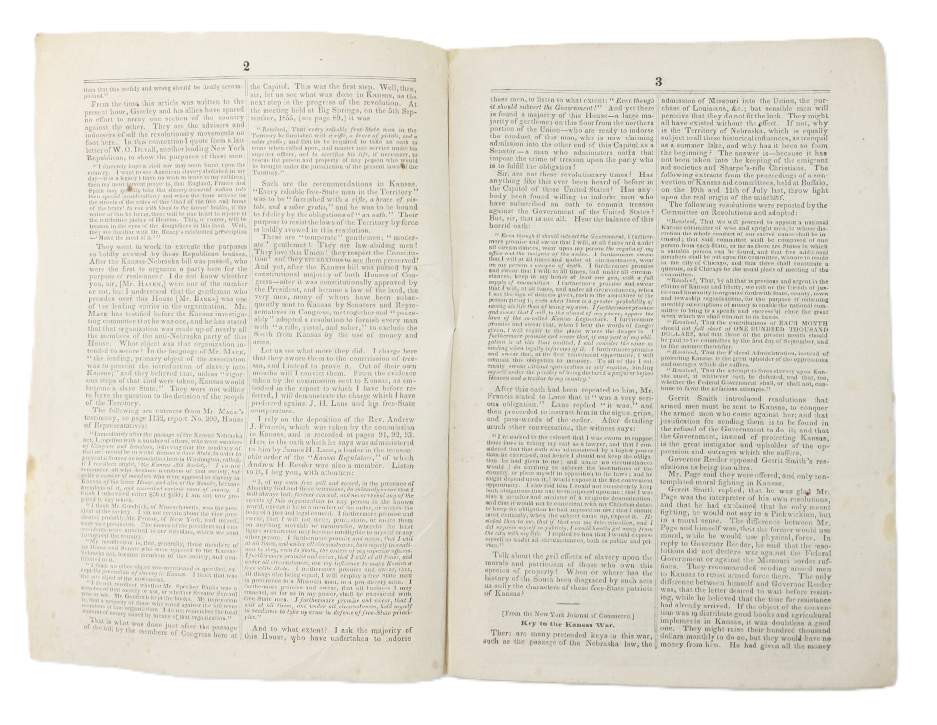Today, surviving examples remain scarce, as such ephemeral political tracts were often discarded after use. Condition: Complete as issued, with strong printing and legible text. Light age toning and scattered foxing, small margin wear, and expected handling from circulation. Housed in a modern protective frame. A rare surviving example of a Kansas-Nebraska crisis campaign pamphlet, offering direct insight into the heated political climate of the 1856 election and the escalating conflict that would culminate in the Civil War.