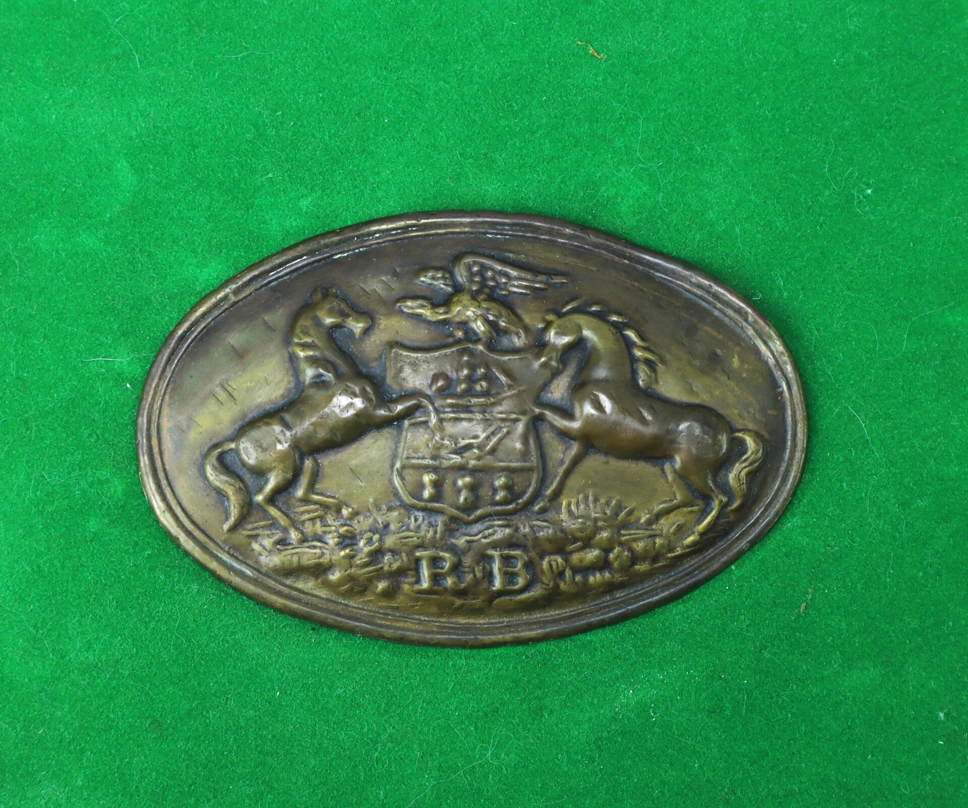 This is a rare Pennsylvania oval cartridge box plate from the Pennsylvania Reserve Brigade. This plate depicts the state seal of Pennsylvania, two horses over a coat of arms with symbolism of agriculture and commerce, and “RB” for Philadelphia Reserve Brigade. This brigade served with the 119th Pennsylvania Volunteer Infantry. This was an elite unit from Philadelphia and served on the battlefield as well as home guard duties.