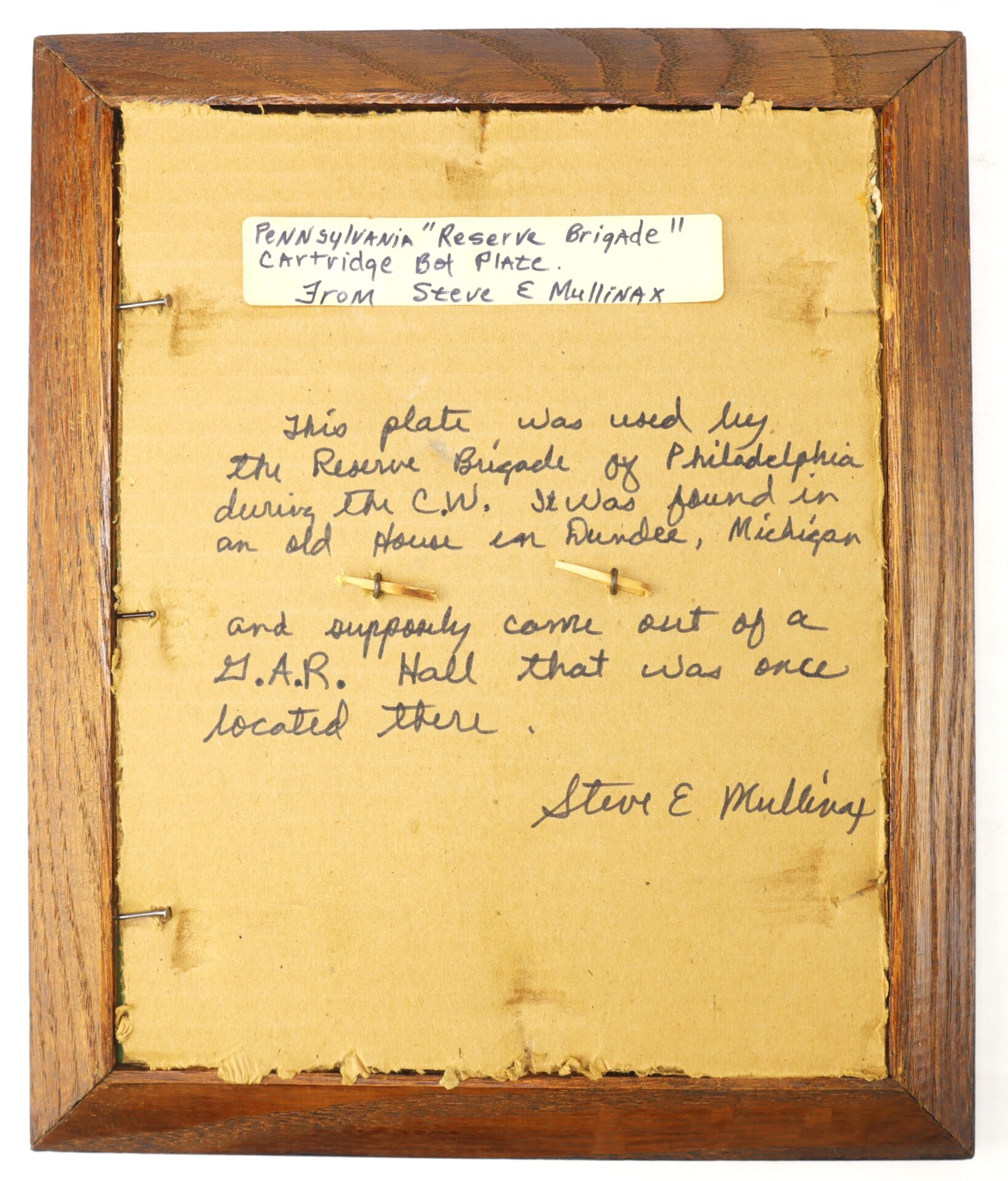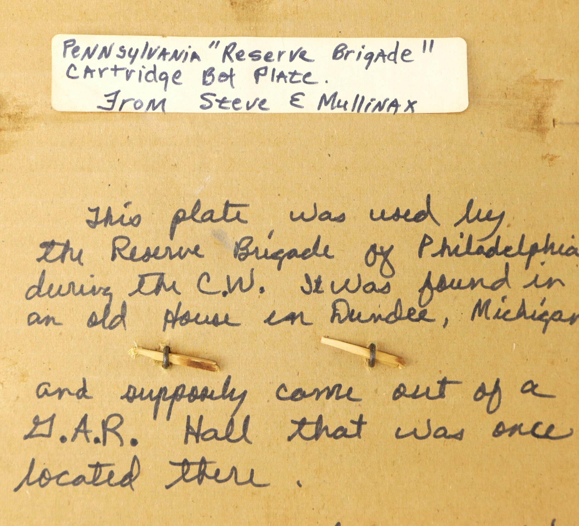 This plate is believed to have been manufactured during the war and was probably contracted with a local Philadelphia maker who produced limited quantities. This plate is oval following the Federal Regulation of 1839 and was used as ornamentation on the flap of cartridge boxes. Face is stamped out of thin sheet brass, lead filled and configured with iron loops as a box plate. Reference O’Donnell & Campbell’s book, plate 588. this example was from the famed Steve Mullinax collection and was gifted by him to a friend as the provenance states. A great example of a rare plate.