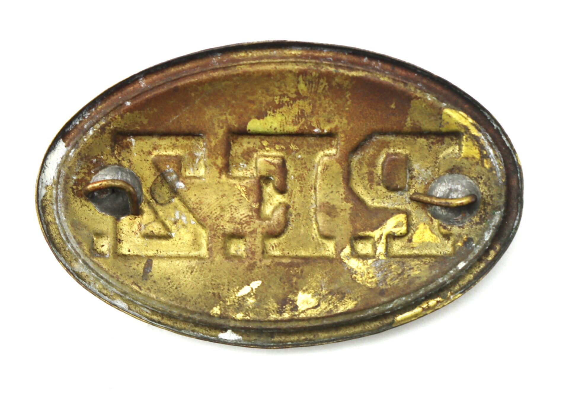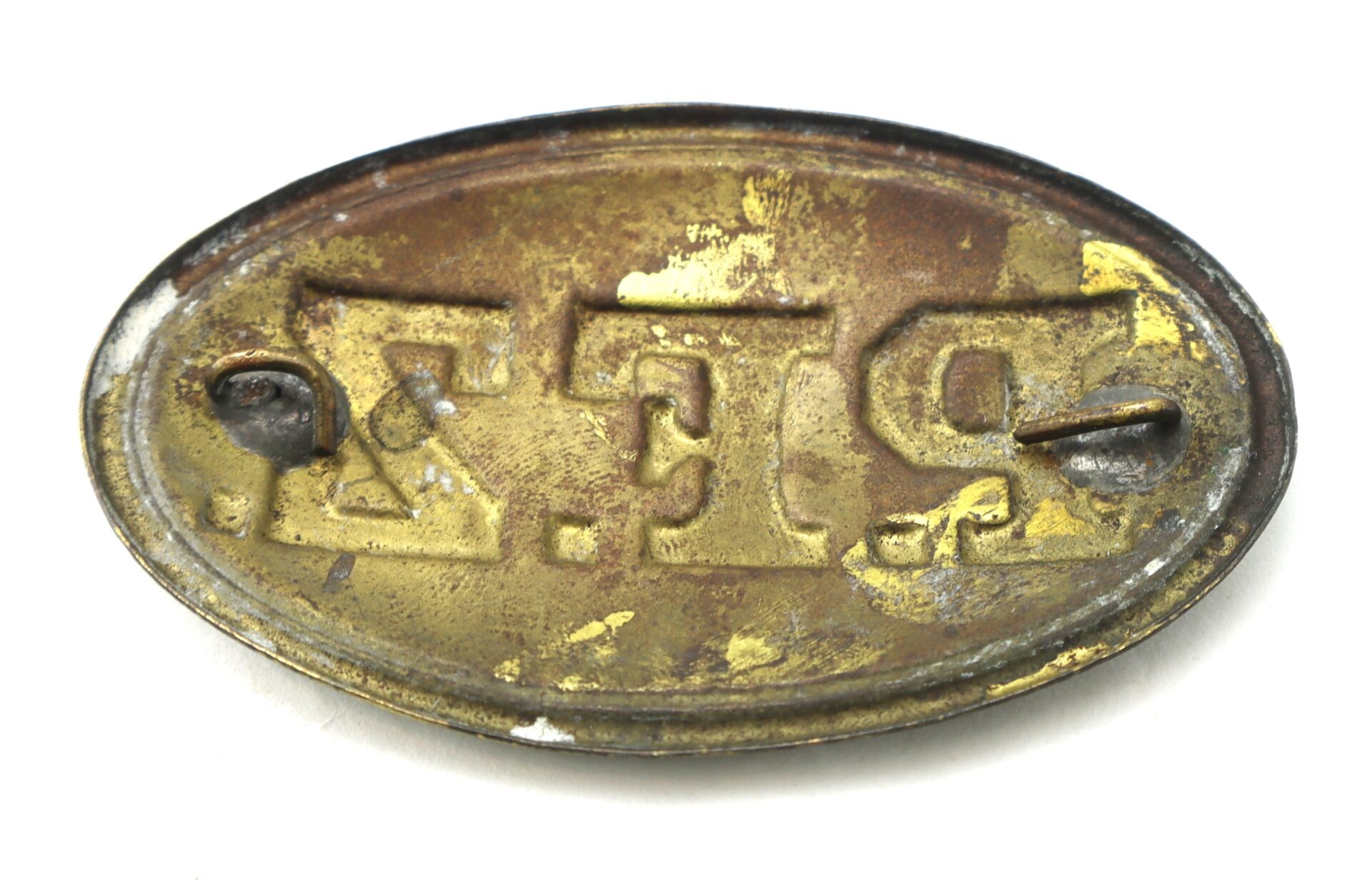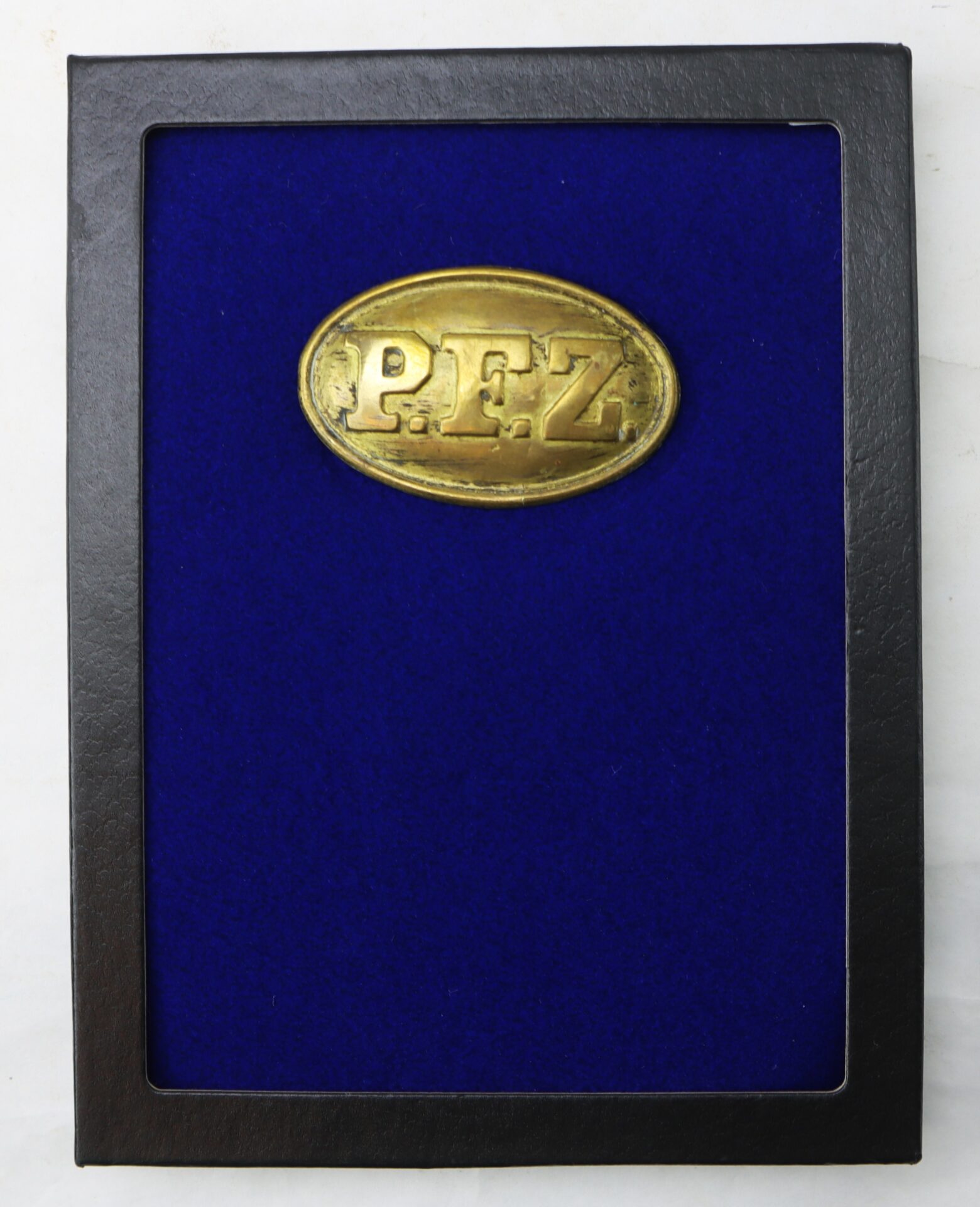 Die-struck rolled brass oval cartridge box plate featuring letters “P.F.Z.” on front and brass wire loops soldered on the reverse. Cataloged as Plate 592 in O’Donnell and Duncan Campbell. Circa 1867-72.