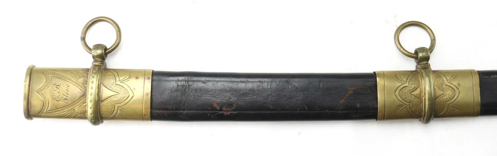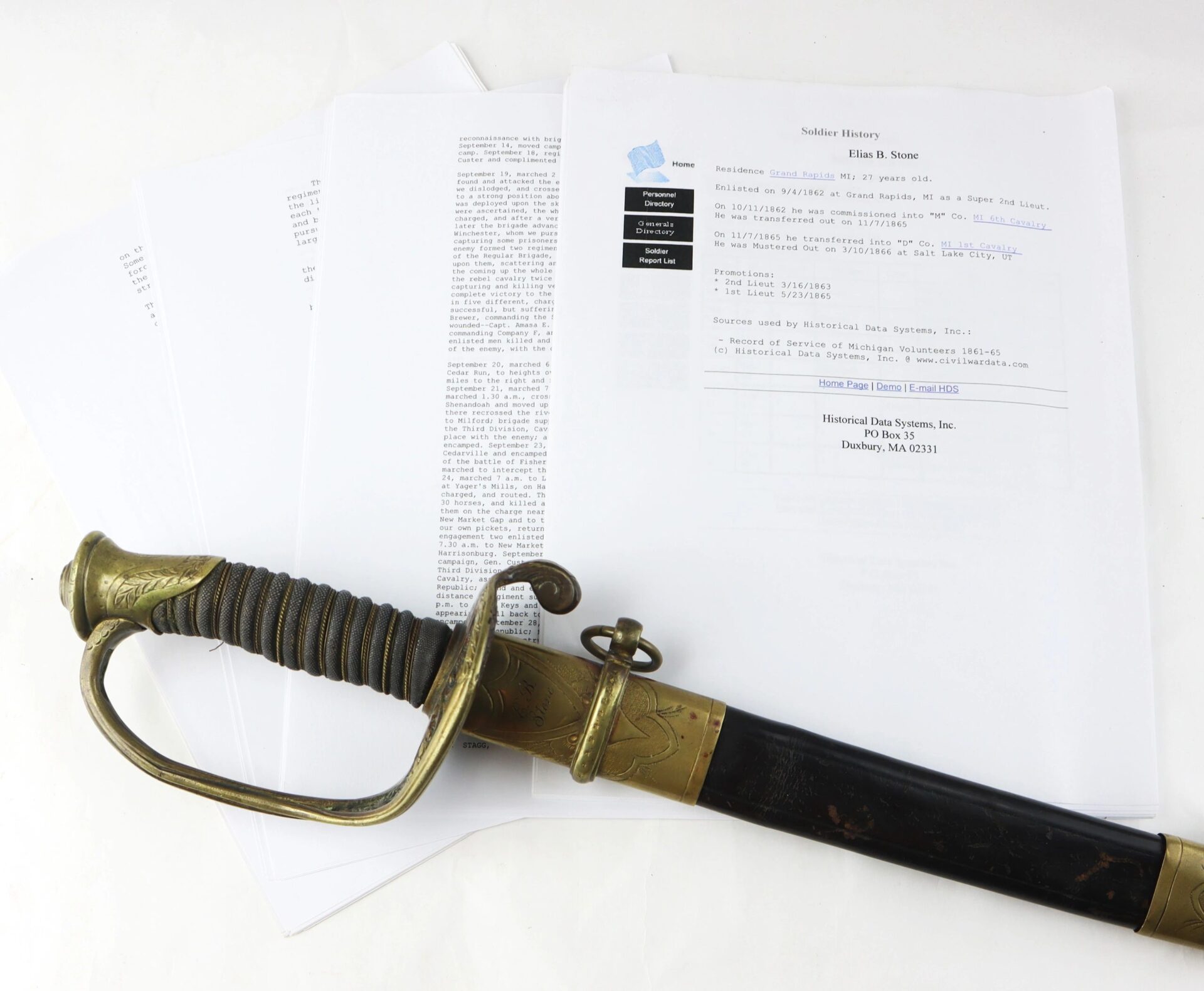 Presentation Sword of Elias B. Stone – Inventory Number: SWO 276 / SOLD 1st and 6th Michigan Cavalry Commanded by Custer – Engaged at Gettysburg! Elias B. Stone: Residence Grand Rapids MI; 27 years old. Enlisted on 9/4/1862 at Grand Rapids, MI as a Super 2nd Lieut. On 10/11/1862 he was commissioned into “M” Co. MI 6th Cavalry He was transferred out on 11/7/1865 On 11/7/1865 he transferred into “D” Co. MI 1st Cavalry He was Mustered Out on 3/10/1866 at Salt Lake City, UT Promotions: * 2nd Lieut 3/16/1863 * 1st Lieut 5/23/1865 MICHIGAN Sixth Cavalry (Three Years) The Sixth Regiment of Michigan Volunteer Cavalry was organized in the summer of 1862, under authority of the Secretary of War, granted directly to Hon. Francis W. Kellogg, member of Congress from the (then) Fourth Congressional District of Michigan. It comprised twelve troops of a maximum strength of 100 men each, including the proper complement of non-commissioned officers. The rendezvous was Grand Rapids. George Gray, a leading lawyer of the state, was commissioned Lieutenant Colonel and assigned to command of the camp. Troop commanders were ordered to report to him. Subsequently, and before the date of muster, Governor Blair, in compliance with a petition of the officers of the regiment, commissioned him as Colonel. Major Russell A. Alger of the Second Michigan Cavalry, was commissioned to succeed Colonel Gray as Lieutenant Colonel. The regiment was mustered into the United States service October 11, 1862, with 1229 officers and men. But four of the officers had seen service, viz: Lieutenant Colonel R. A. Alger, previously Captain and Major of the Second Michigan Cavalry; Captain Peter A. Weber, in the Third Michigan Infantry, and Battalion Adjutant of the Second Michigan Cavalry; Lieutenant Don G. Lovell, as Corporal in the Third Infantry, and Lieutenant Phineas G. White, as Sergeant in the First Michigan Cavalry. MICHIGAN First Cavalry. (Three Years) The First Cavalry was organized at Detroit and mustered into the United States service Sept. 13, 1861, with an enrollment of 1,144 officers and men. The field, staff and line officers at organization were as follows: Colonel, Thornton F. Brodhead, Grosse Isle. Lieutenant Colonel, Joseph T. Copland, Pontiac. Majors, William S. Atwood, Detroit; Angelo Paldi, Detroit; Charles H. Town, Detroit. Surgeon, George K. Johnson, Grand Rapids. Assistant Surgeon, Alfred K. Nash, Trenton. Adjutant, William M. Brevoort, Detroit. Quartermaster, James I. David, Trenton. Chaplain, Jonathan Hudson, Trenton. Inventory Number: SWO 276 / SOLD