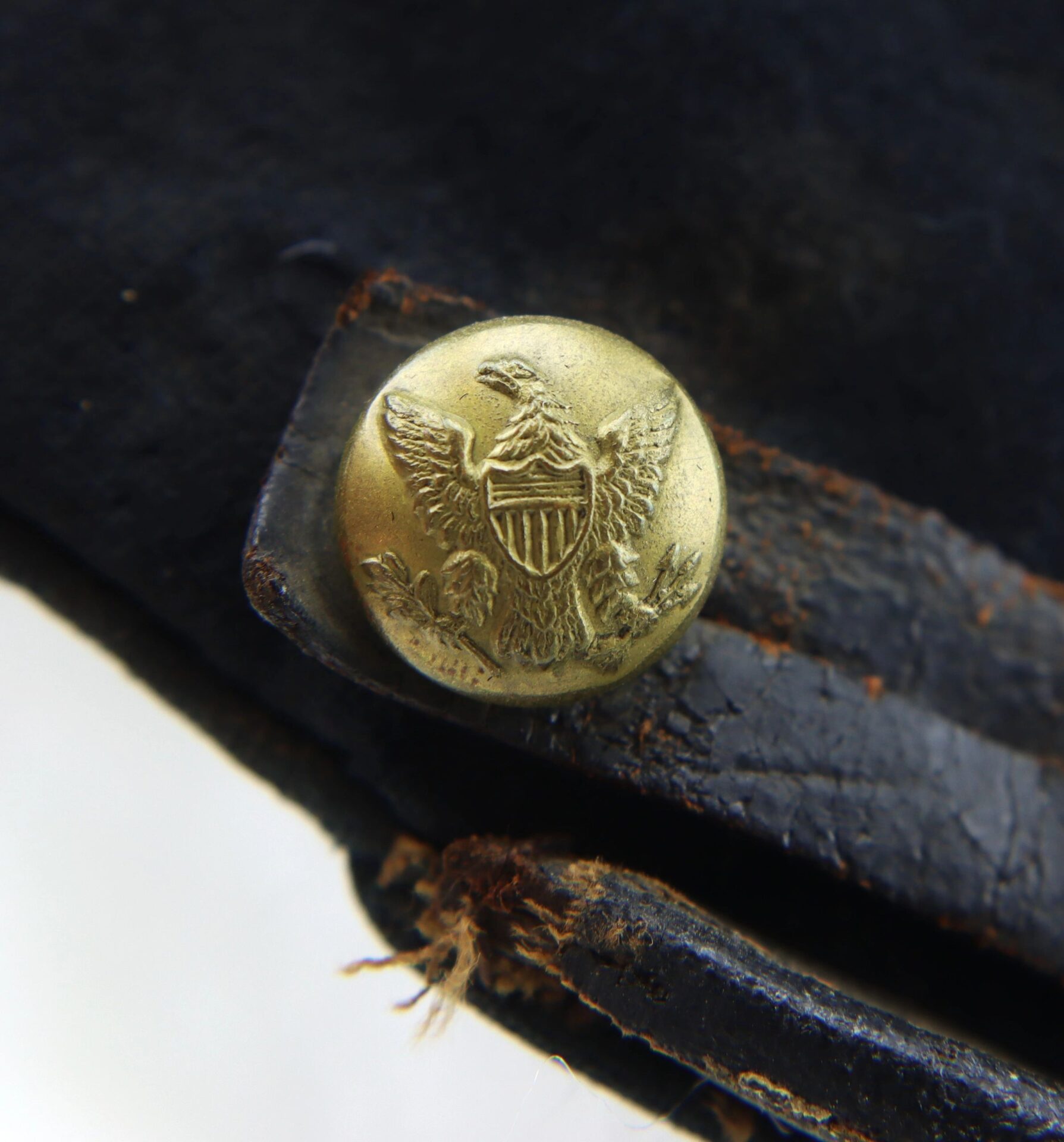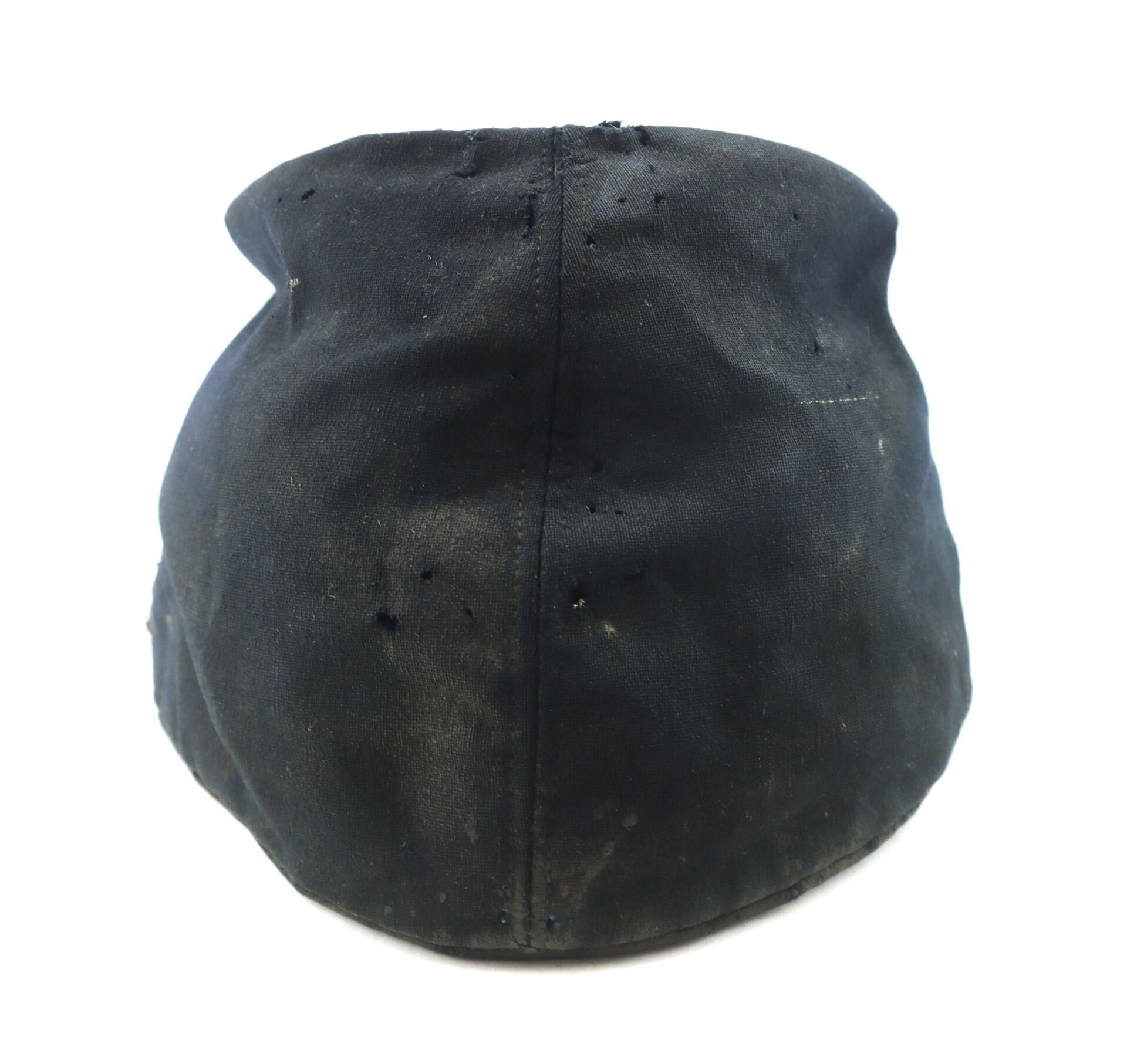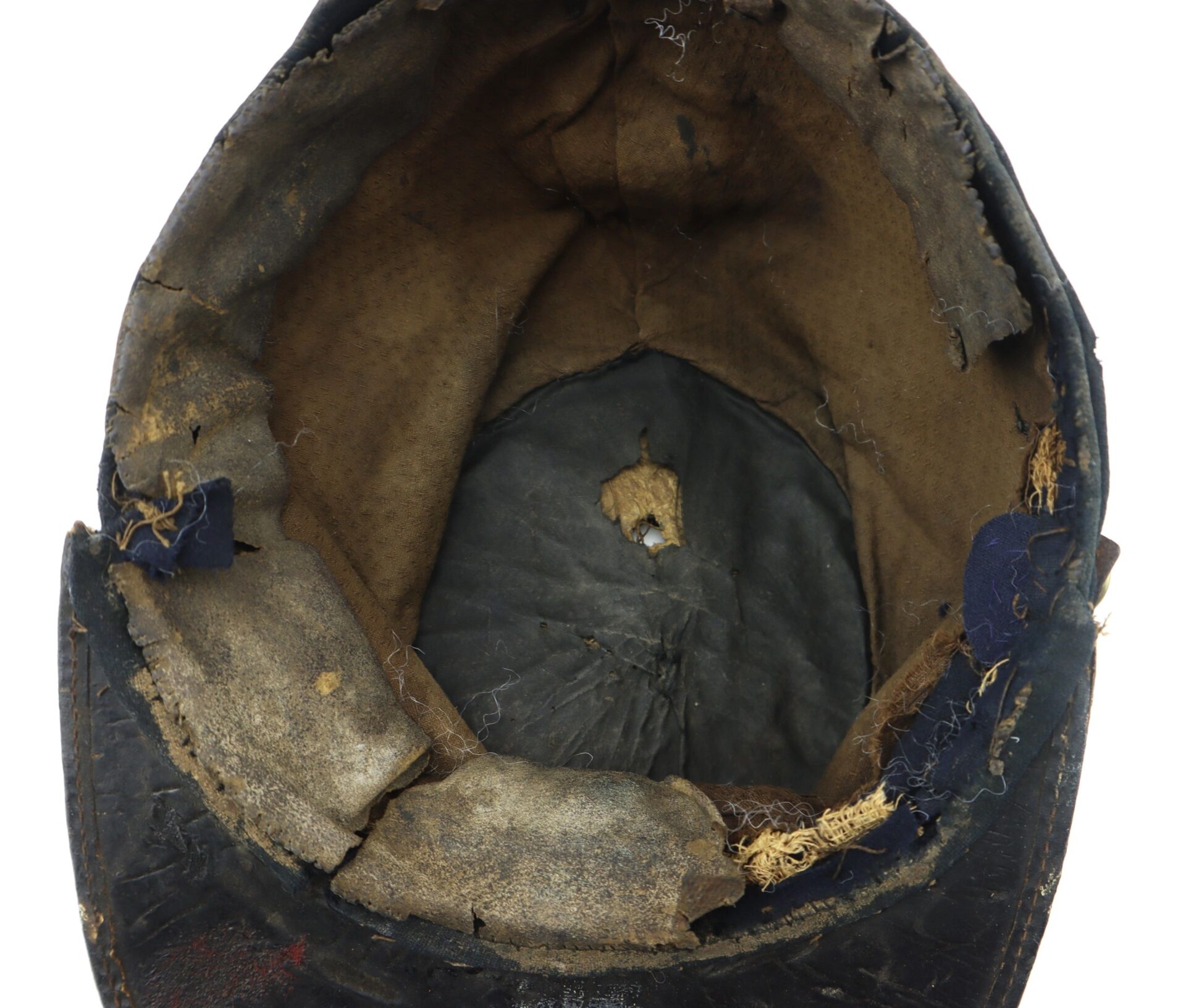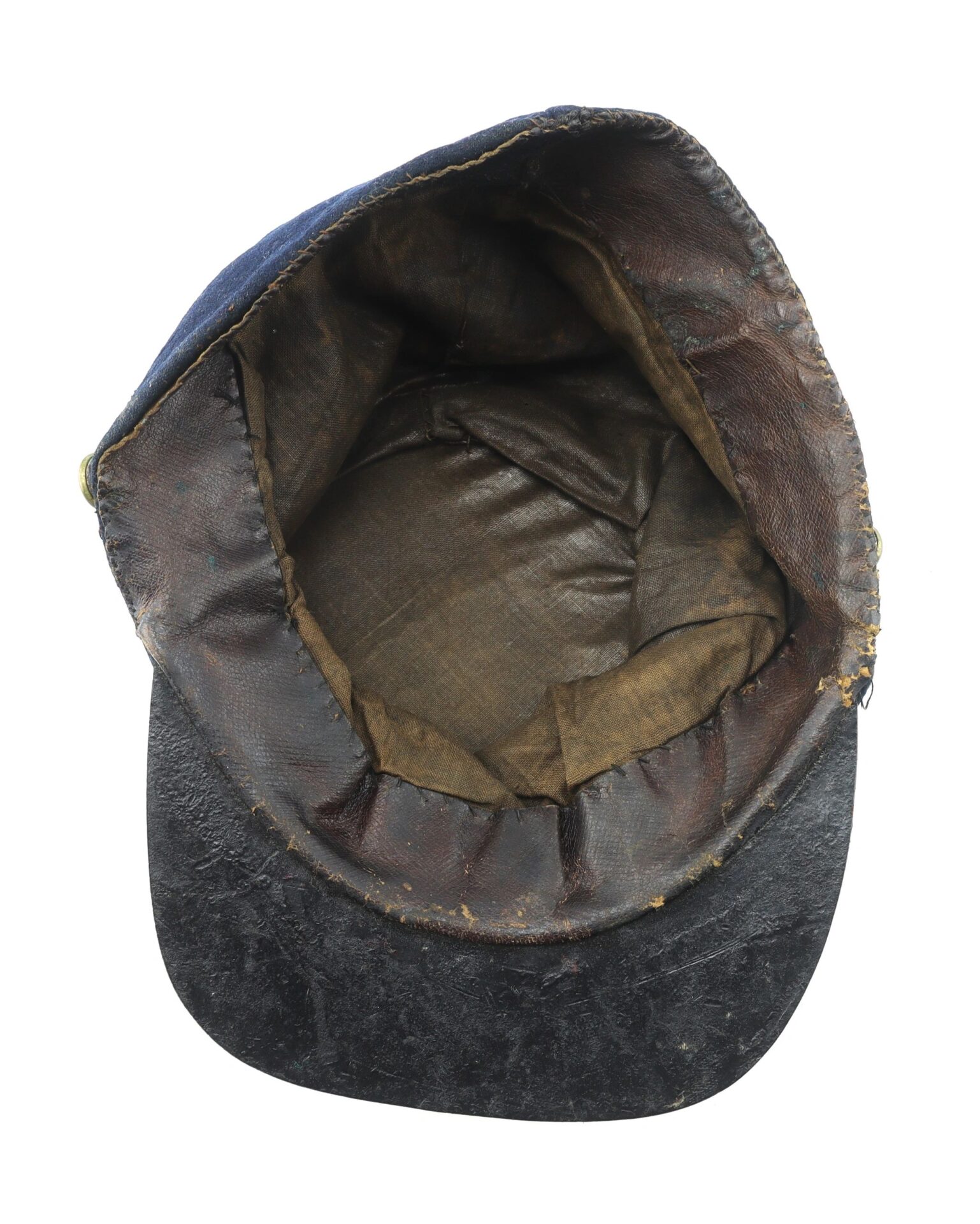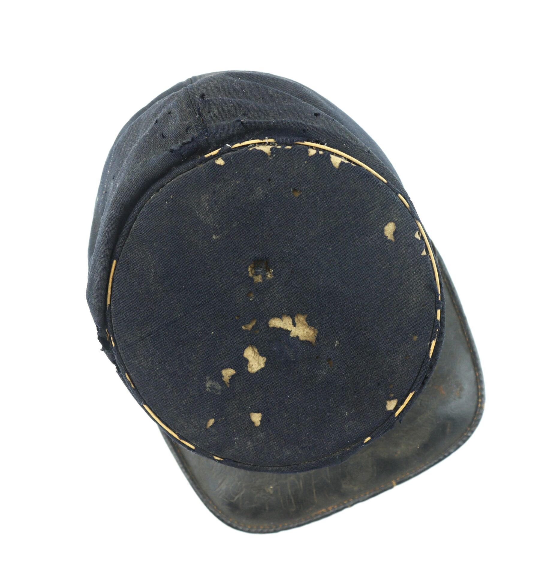 Private Purchased Civil War Forage Cap Scarce example – Worn in the field – Not Surplus! – Inventory Number: UNI 143 / SOLD Commercially produced Civil War forage cap, popular with officers and soldiers that preferred to wear a cap of higher quality that those issued by the government. This example has a brim bound with painted cloth, and the body is lined with brown cotton with a unique textured pattern. The body of the cap rises 3 ¼” at the front. The leather sweatband is fragile and is partially missing. There is some moth damage to the crown of the cap, exposing the reed used to reinforce the piping around the crown. Overall, a nice Civil War forage cap that shows genuine wear in the field. Inventory Number: UNI 143 / SOLD