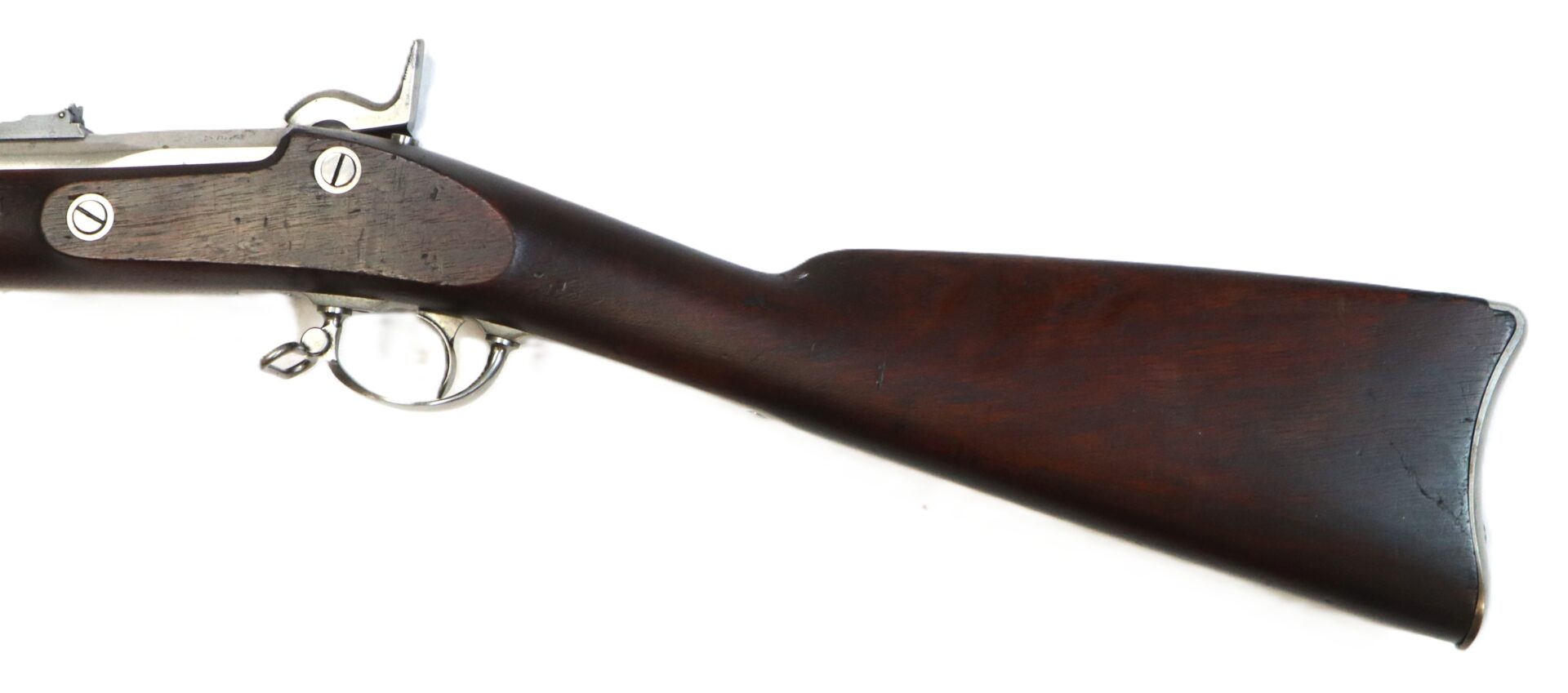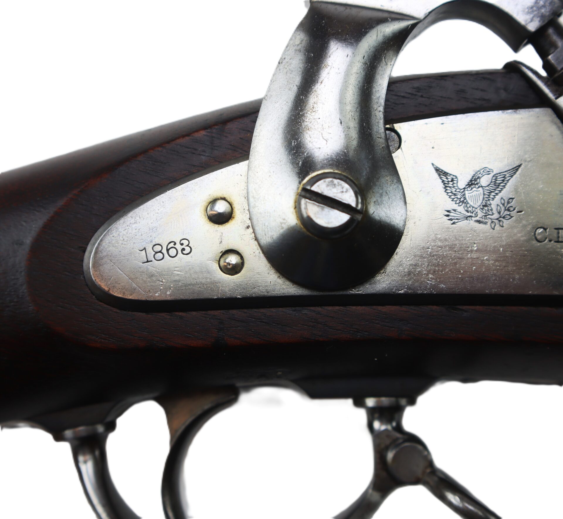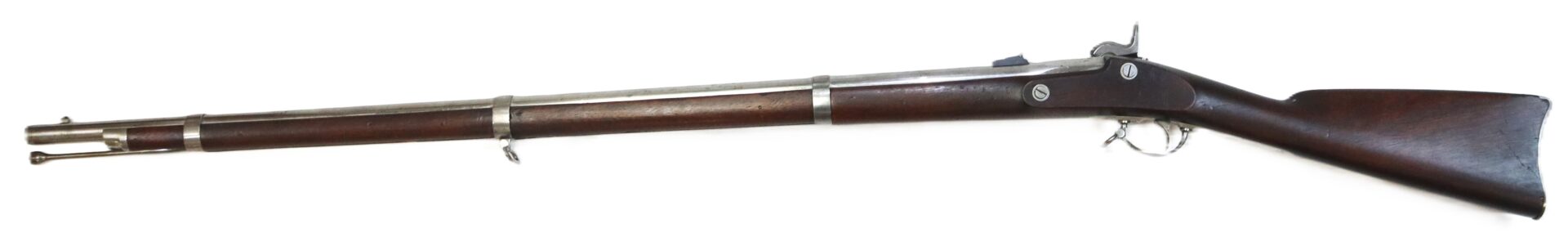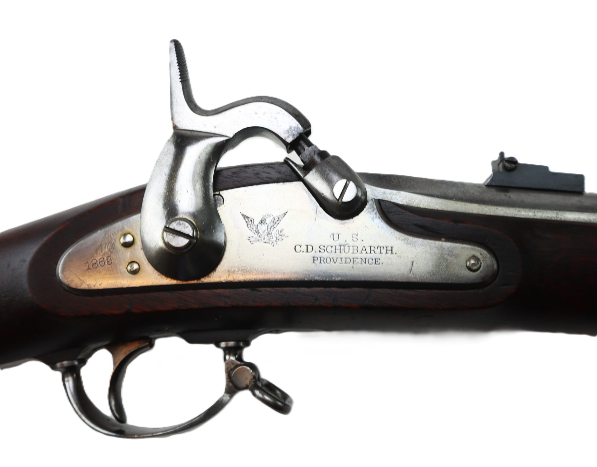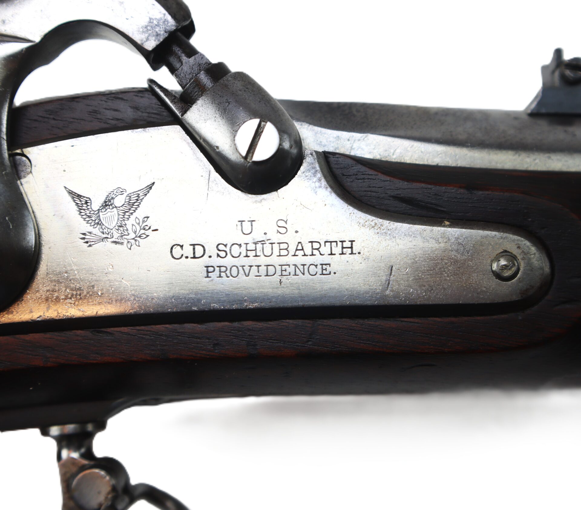 This Model 1861, .58 caliber, percussion rifle-musket, dated 1863, is in complete, fine condition. Produced by C. D. Schubarth and Co. of Providence, Rhode Island. In 1862, the firm received a government contract from the US Ordnance Department for 9,500 such weapons. The 40” long barrel features a two-leaf sight with strong/bright factory blue, the barrel has a dull to bright factory finish on gun metal (lockplate, hammer, butt plate, bands, trigger guard, and ramrod) all exhibit the same silver look. Lock plate is stamped “U. S. / C.D. SCHUBARTH / PROVIDENCE” in front of the hammer and stamped “1863” behind hammer. A spread-winged eagle motif is stamped on lockplate between hammer and bolster. Steel butt plate strongly stamped with “U S”. Has the original two-leaf rear sight and small blade front sight. Matching “1863” barrel date stamp is on the breech top flat. Barrel bore is clean and bright with excellent rifling. All screw heads are good with no wear. Government proof marks “V / P / [eagle head]” on left facet of the breech are clear. Mechanics are strong and crisp. Black walnut full stock is in very good condition overall. It has clean edge contours on the flat opposite the hammer. Stock exhibits two strong government cartouches. No blemishes in the wood save usual dings and dents from use and storage. Retains its tulip-head steel ramrod with a threaded tip. A scarce and ultra nice Civil War contract musket.