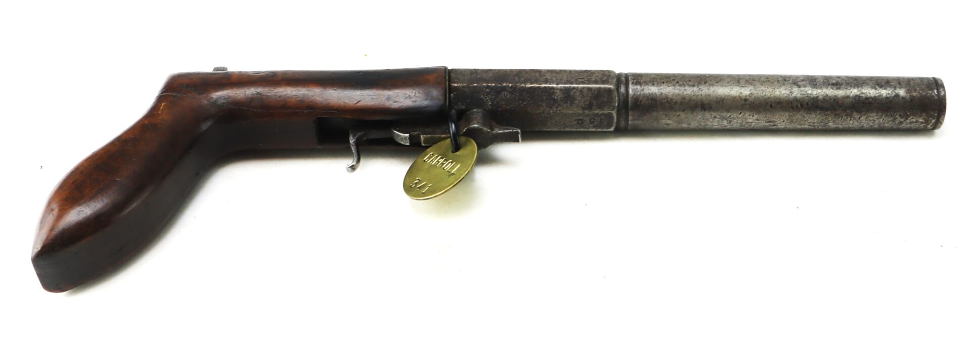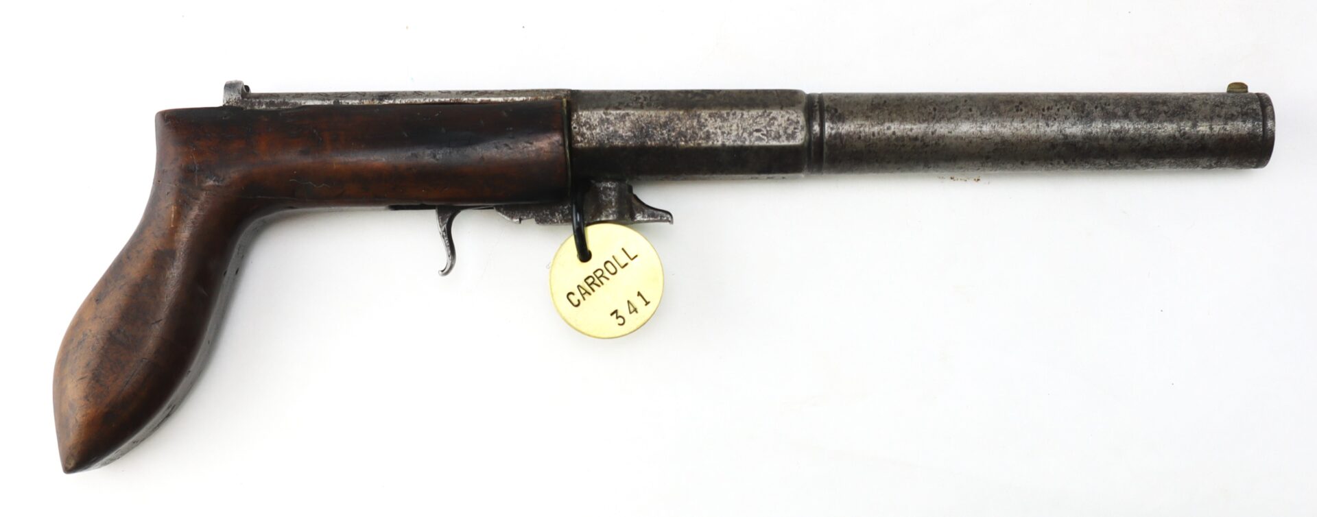 Scarce and highly collectible American underhammer pistol, clearly marked on the barrel “CARROLL & CO. BALTIMORE,” a desirable regional maker active in the mid-19th century. This classic single-shot percussion pistol features the distinctive underhammer ignition system, prized for its simplicity, reliability, and direct ignition.