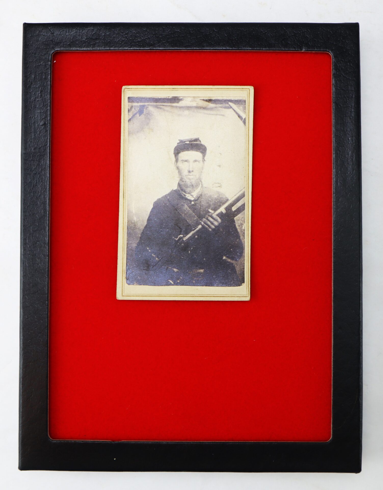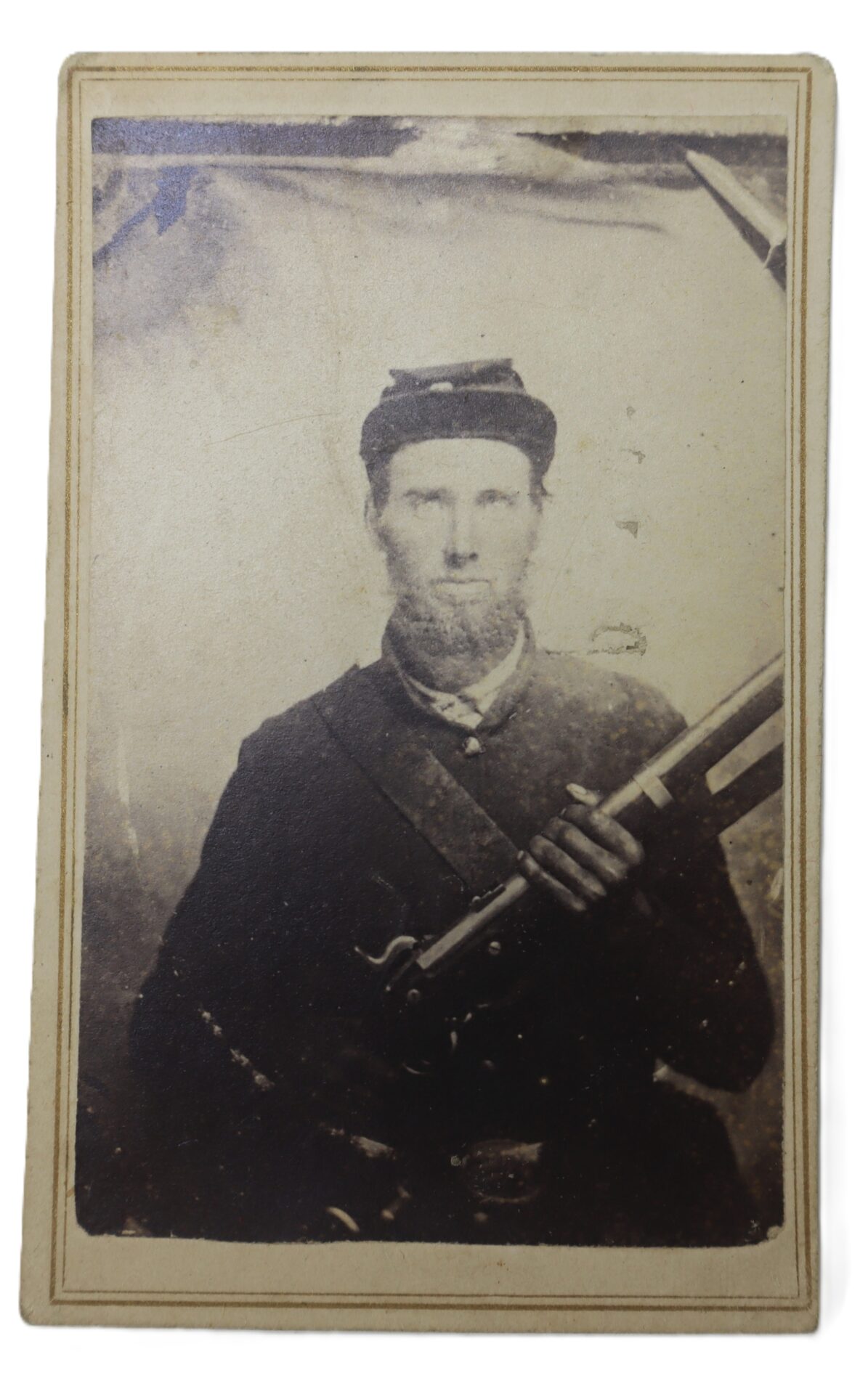 Armed soldier CDVs are always desirable, particularly when the weapon is boldly positioned as the focal point of the composition. This example has wonderful eye appeal — the straightforward stare, the slightly angled musket, and the quiet determination that makes these wartime portraits so compelling.