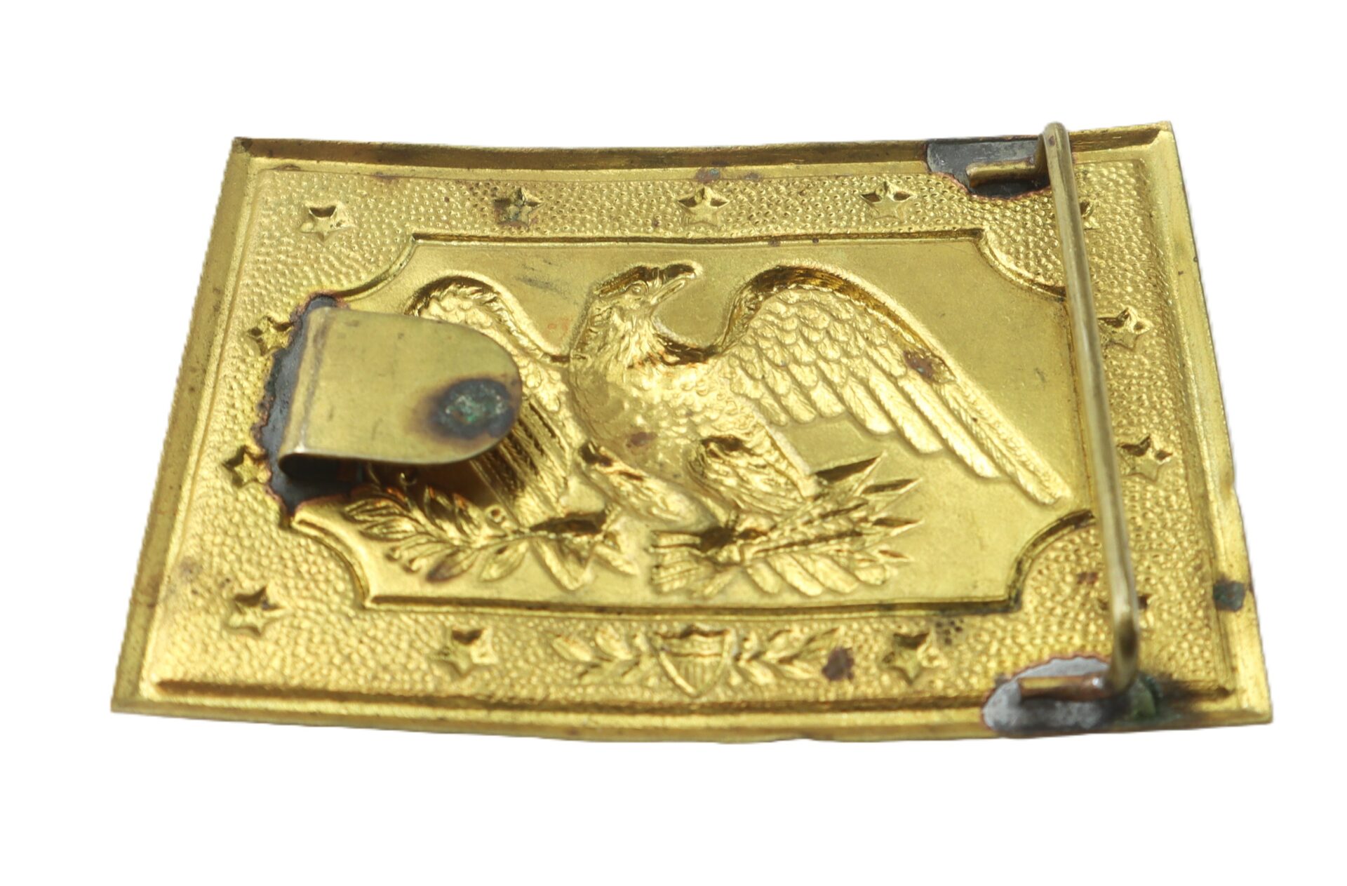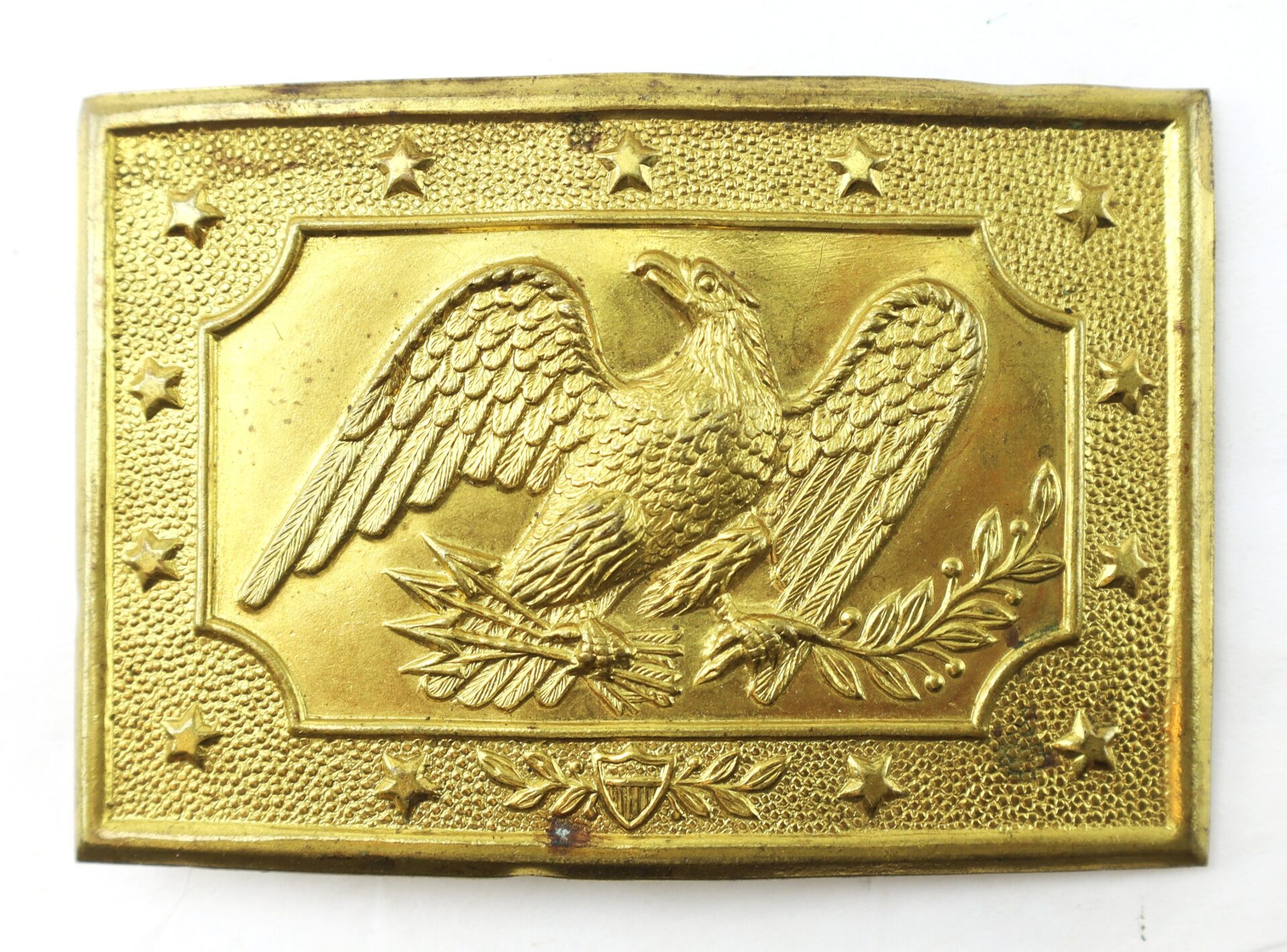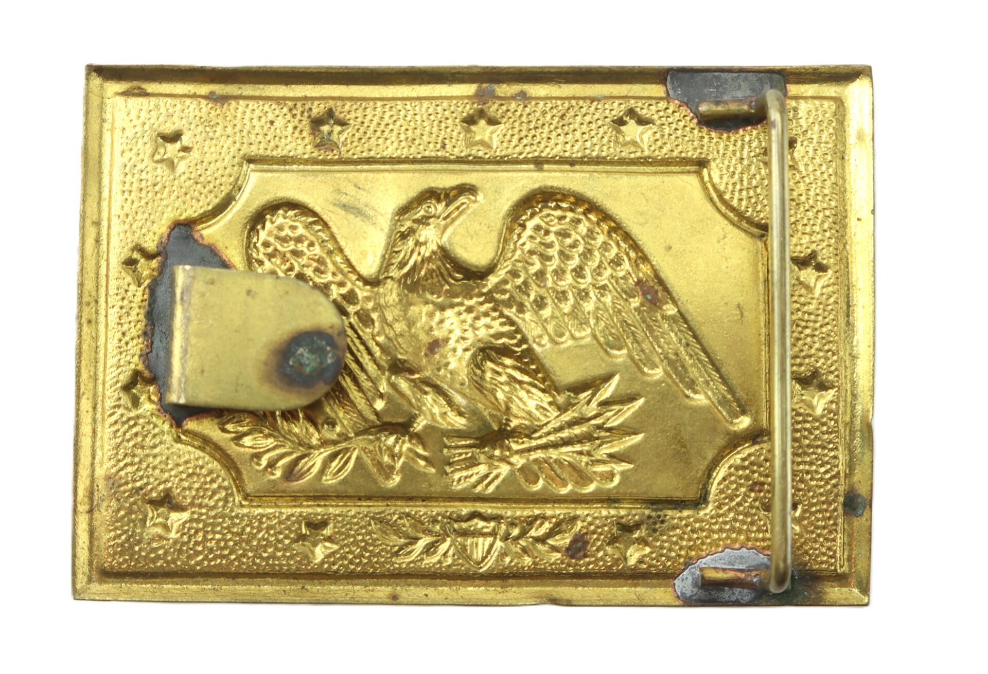A superb example of a pre–Civil War militia rectangular belt plate, dating circa 1830s–1850s. Stamped brass face featuring a spread-wing American eagle clutching arrows and olive branch, bordered by a stippled field with raised stars. The reverse retains its original soldered belt bar and tongue hook, with the original lead solder showing oxidation.