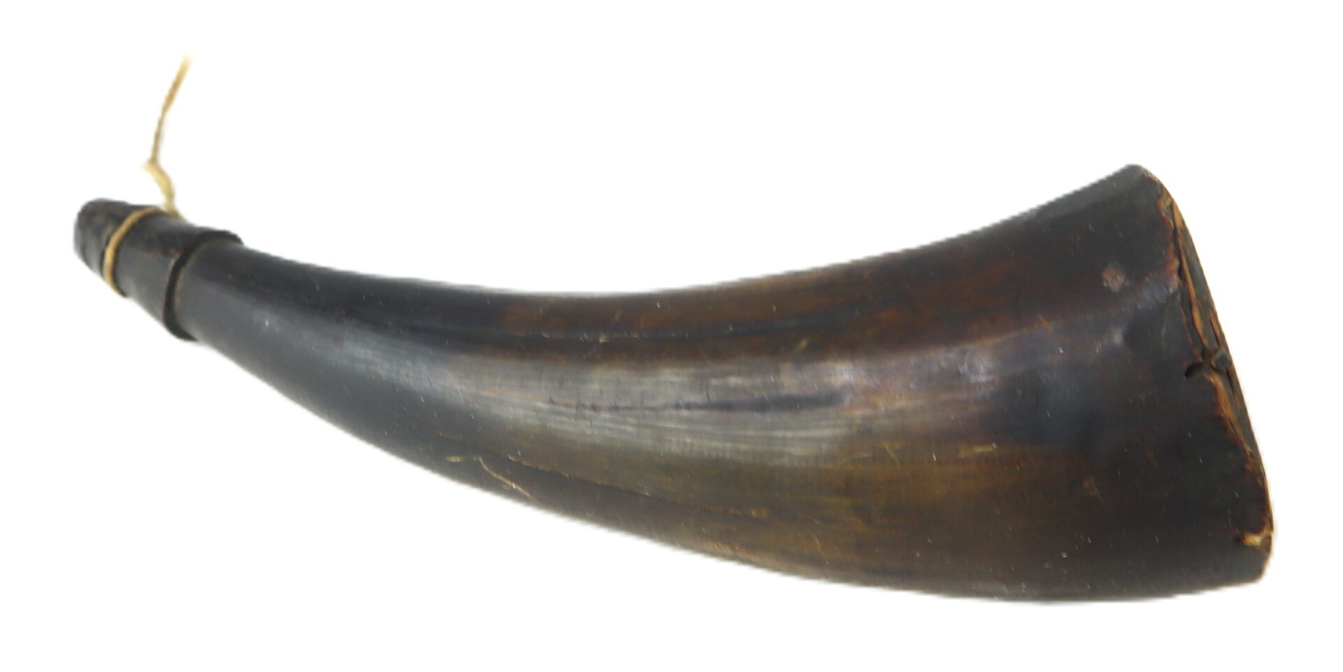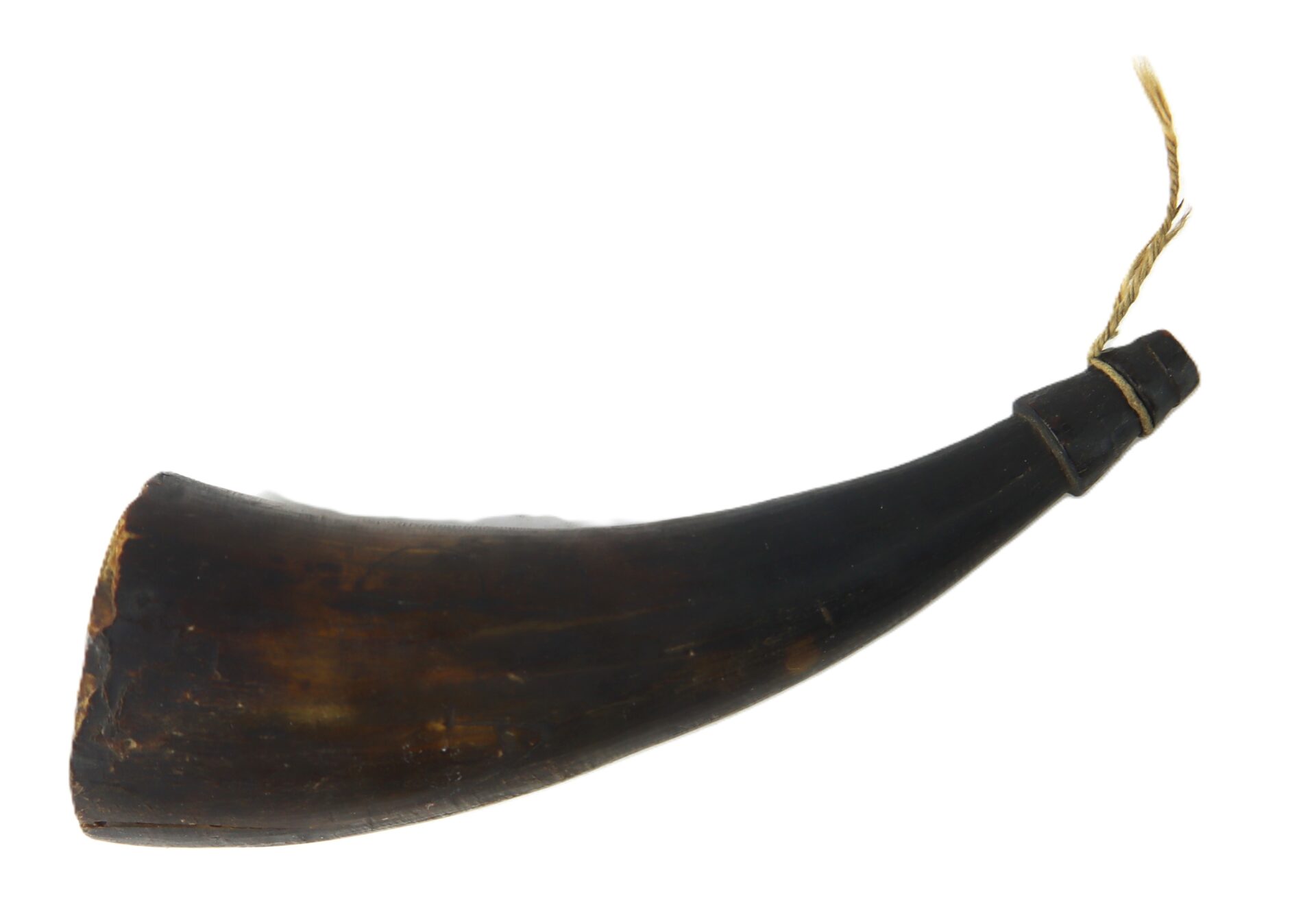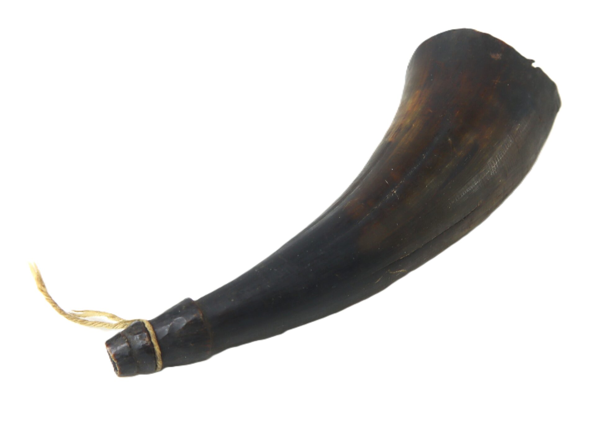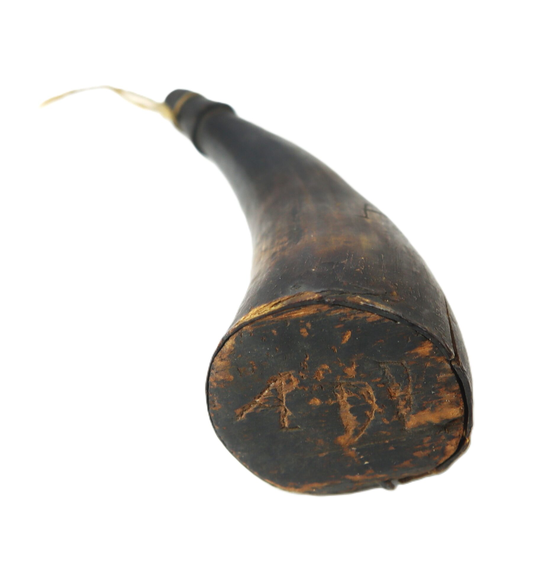 The horn retains its tapered wooden spout plug with period cordage at the tip. The larger base end is sealed with a fitted wooden plug, showing age and honest wear consistent with early use. The initials “ADL” have been carved into the plug.