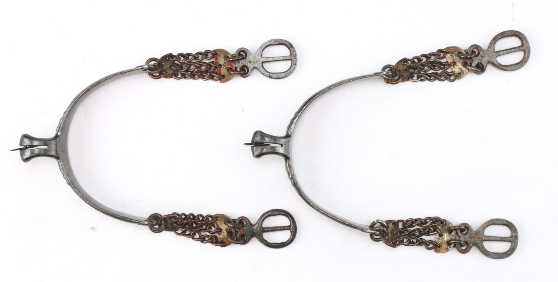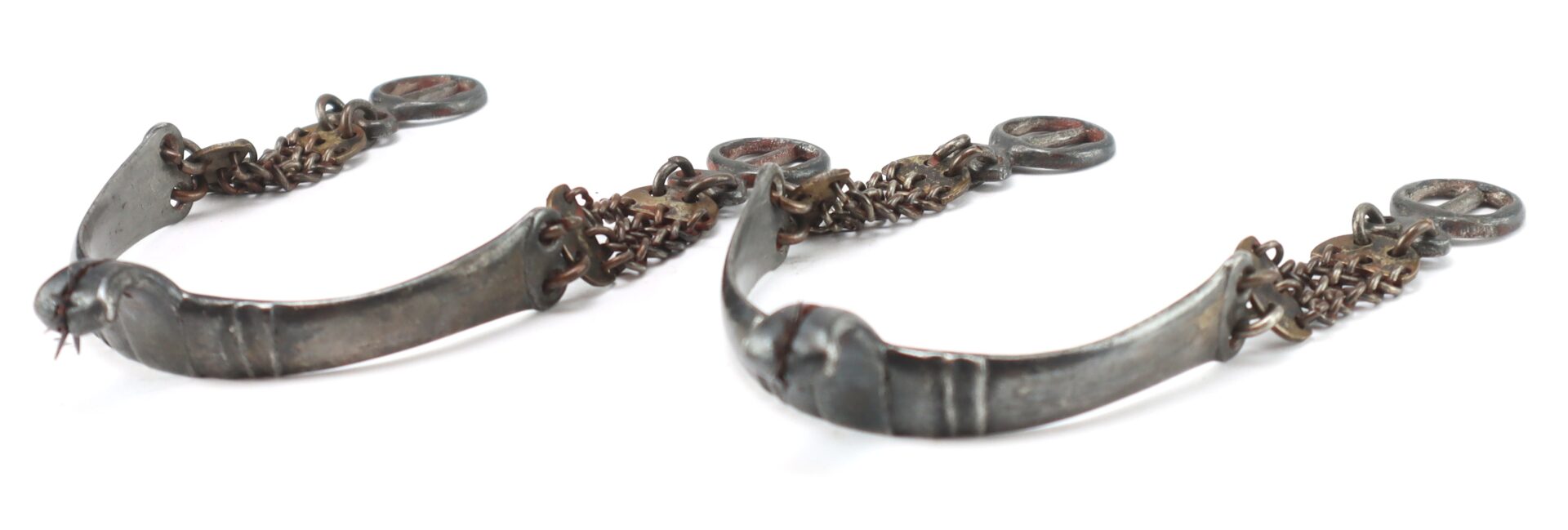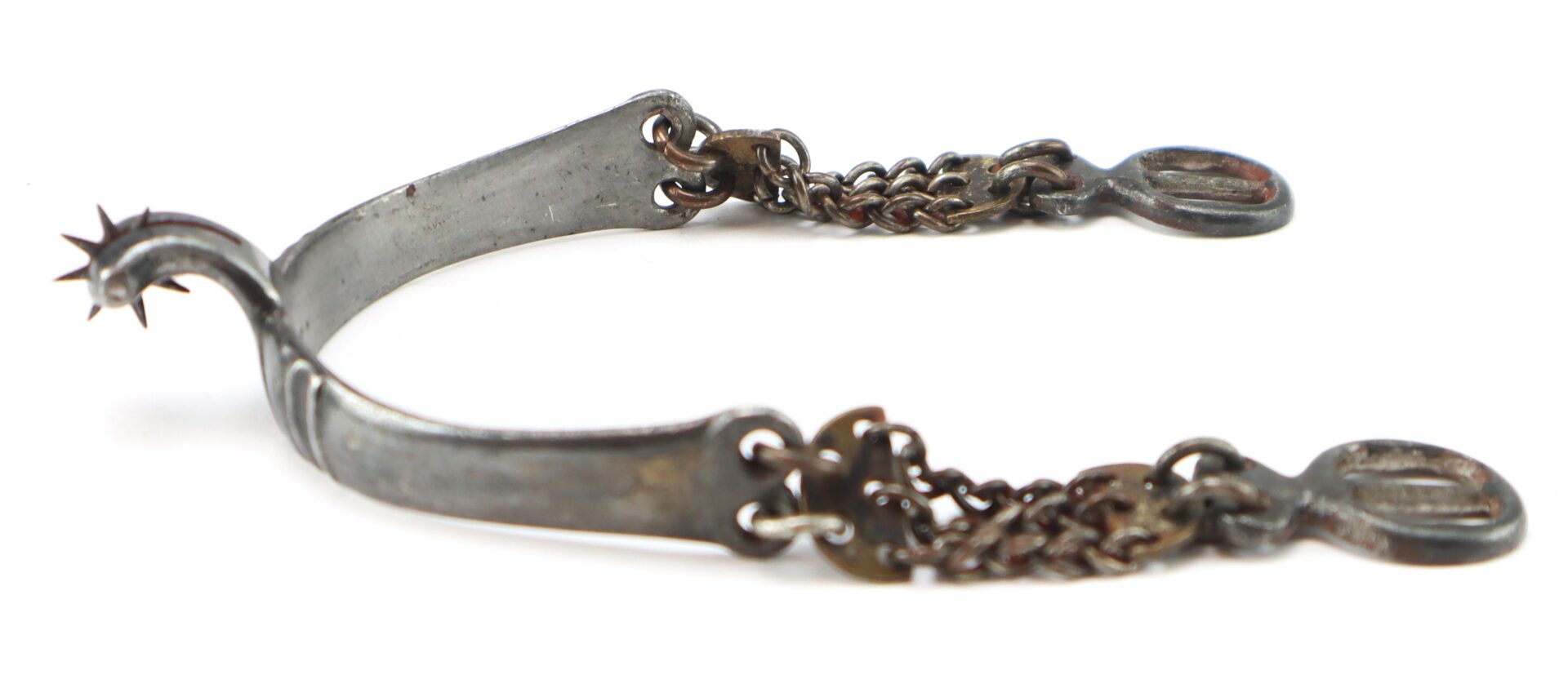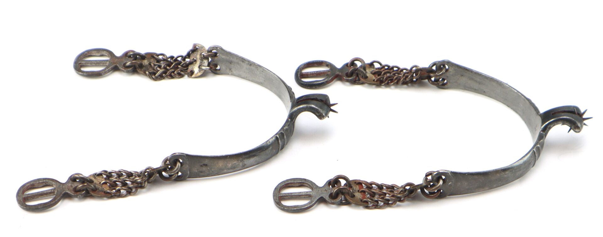 A pair of Revolutionary War era spurs, dating to the 18th century: the side bars are simple and flat, but with rounded, raised panels on each end pierced for attachment rings for a short link belt that in turn holds separate slotted strap loops for a spur strap passing over and under the boot. The neck curves slightly downward from the top edge of the heel strap, flares out, and, along with a rounded rowel box. The rowels are both present, and in the form of sharp starburst points. These are all in intact and about 12 in number. The use of the link belt, floating slotted loops, the downward curving and flared neck, and most of all the clamshell form of the neck and rowel box seem to us very much 18th century in form. The spurs are silver or heavily plated with no base metal showing. They would display very well and were undoubtedly worn by a commissioned officer of with financial means.