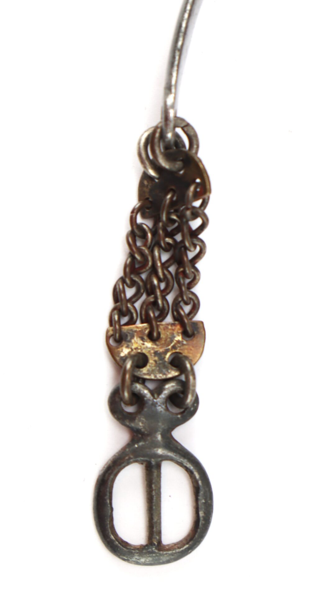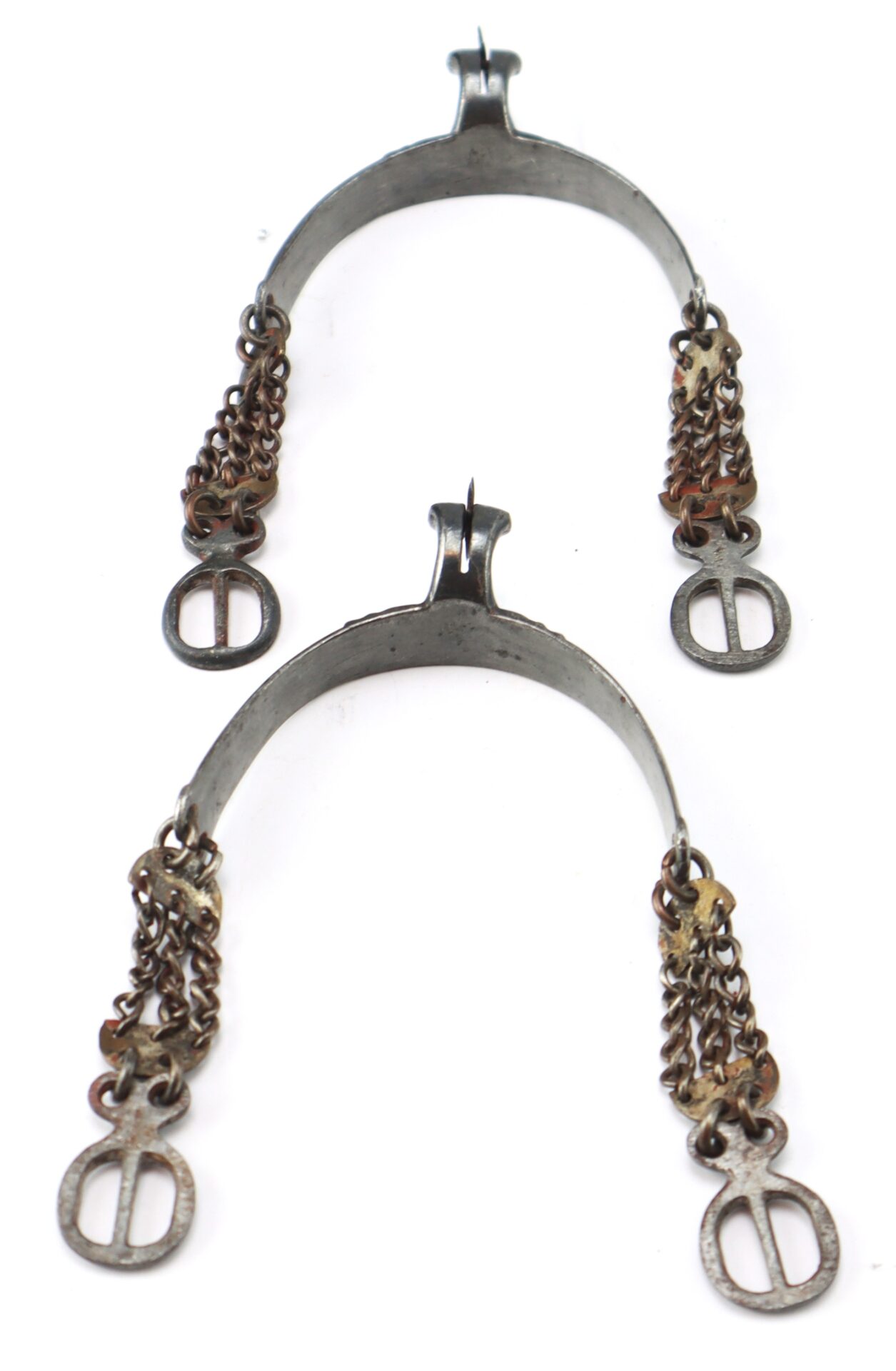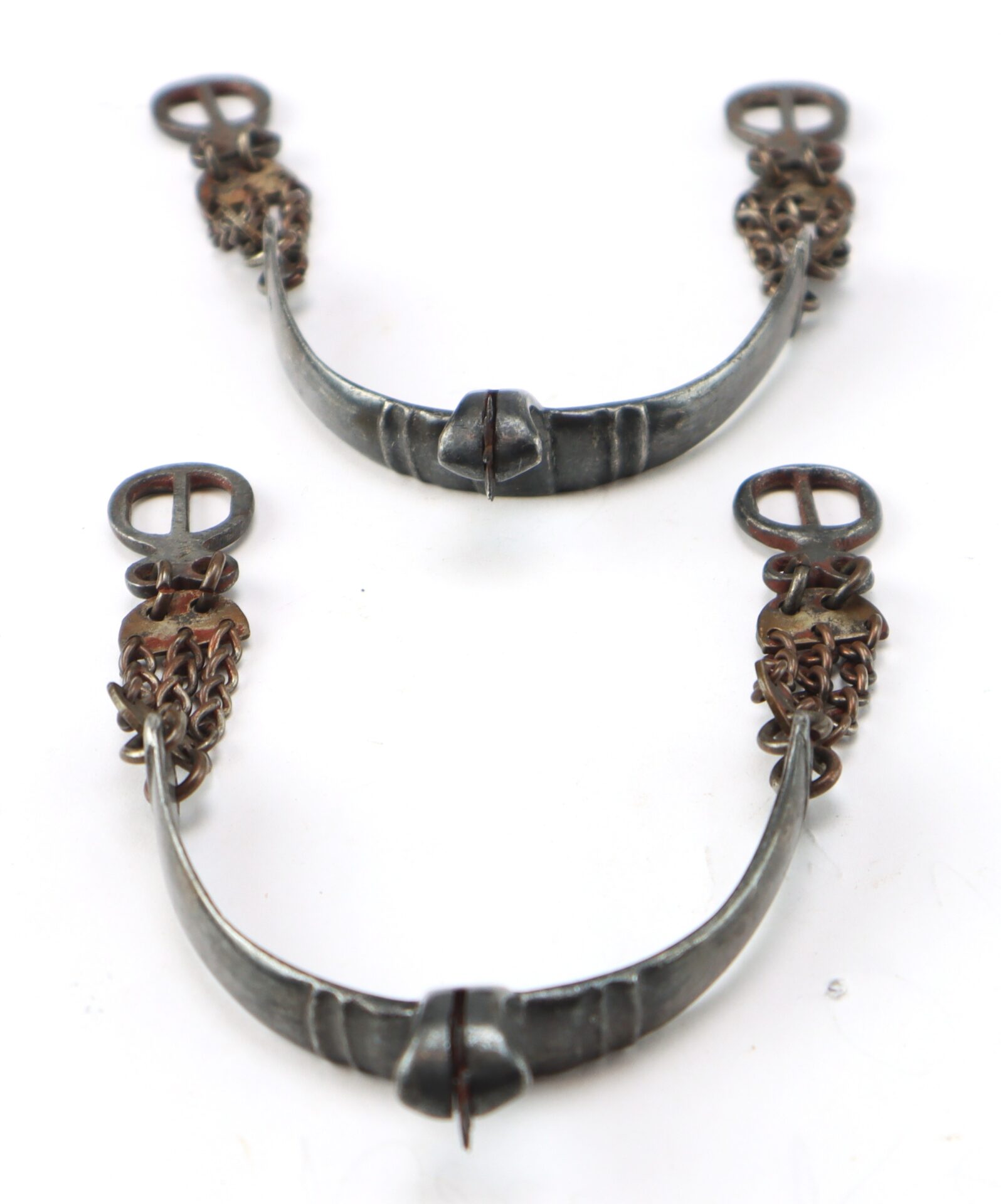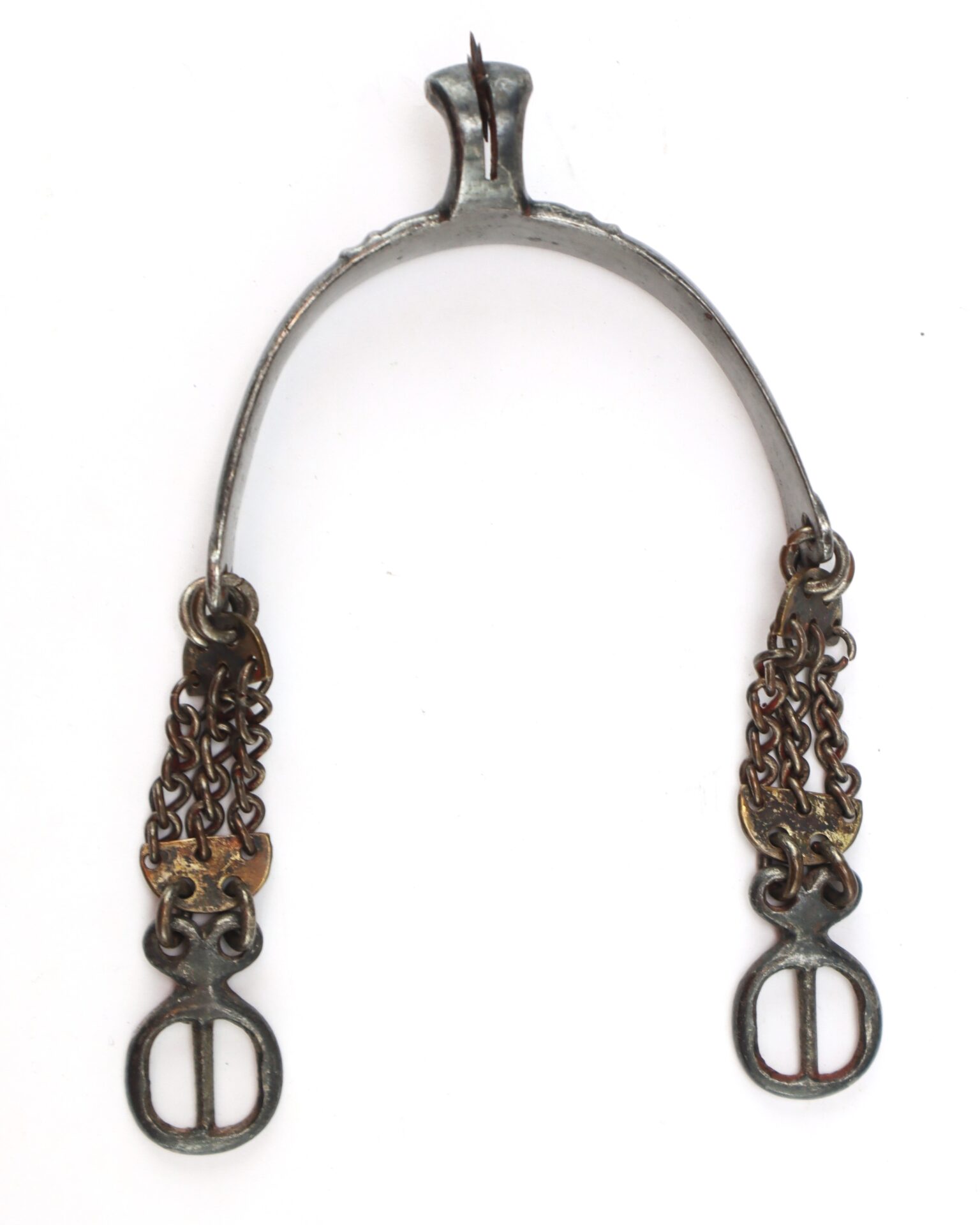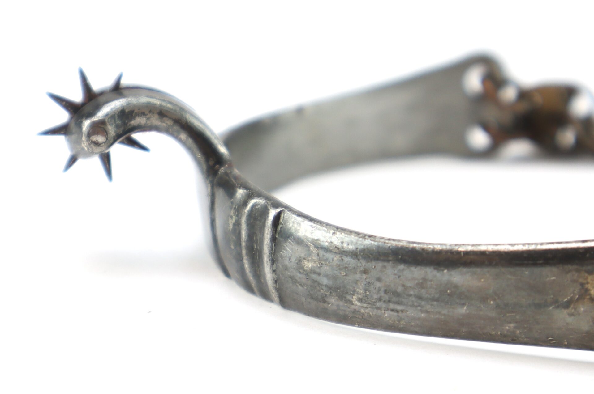 A pair of Revolutionary War era spurs, dating to the 18th century: the side bars are simple and flat, but with rounded, raised panels on each end pierced for attachment rings for a short link belt that in turn holds separate slotted strap loops for a spur strap passing over and under the boot. The neck curves slightly downward from the top edge of the heel strap, flares out, and, along with a rounded rowel box. The rowels are both present, and in the form of sharp starburst points. These are all in intact and about 12 in number. The use of the link belt, floating slotted loops, the downward curving and flared neck, and most of all the clamshell form of the neck and rowel box seem to us very much 18th century in form. The spurs are silver or heavily plated with no base metal showing. They would display very well and were undoubtedly worn by a commissioned officer of with financial means.