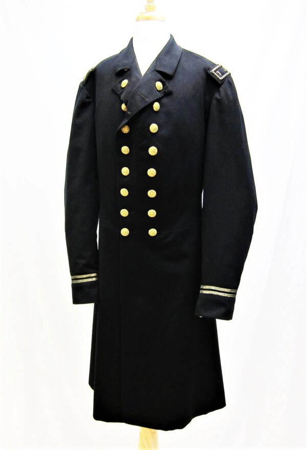 Scarce Civil War Naval Officer’s Frock Coat – Inventory Number: UNI 058 / SOLD Conforming to the 1864 U.S. Navy Regulations, this is an excellent example of a seafaring officer’s “service dress” frock coat. The deep blue/black wool body had the distinctive “rolling collar”and full skirt typical of such garments, with the “black silk serge” lining quilted in the upper half. Two rows of nine original naval buttons line the front (“D. Evans” backmarks) with two at the hip. Two strips of 1/4″ “navy gold lace” are firmly sewn at each cuff. Also affixed to the coat are the original shoulder straps for an Assistant Paymaster: an oak sprig embroidered on a black background, with a single bar at each end. The coat I excellent and shows little wear with essentially no moth damage. A difficult to obtain Civil War uniform in superlative condition.  Inventory Number: UNI 058 / SOLD