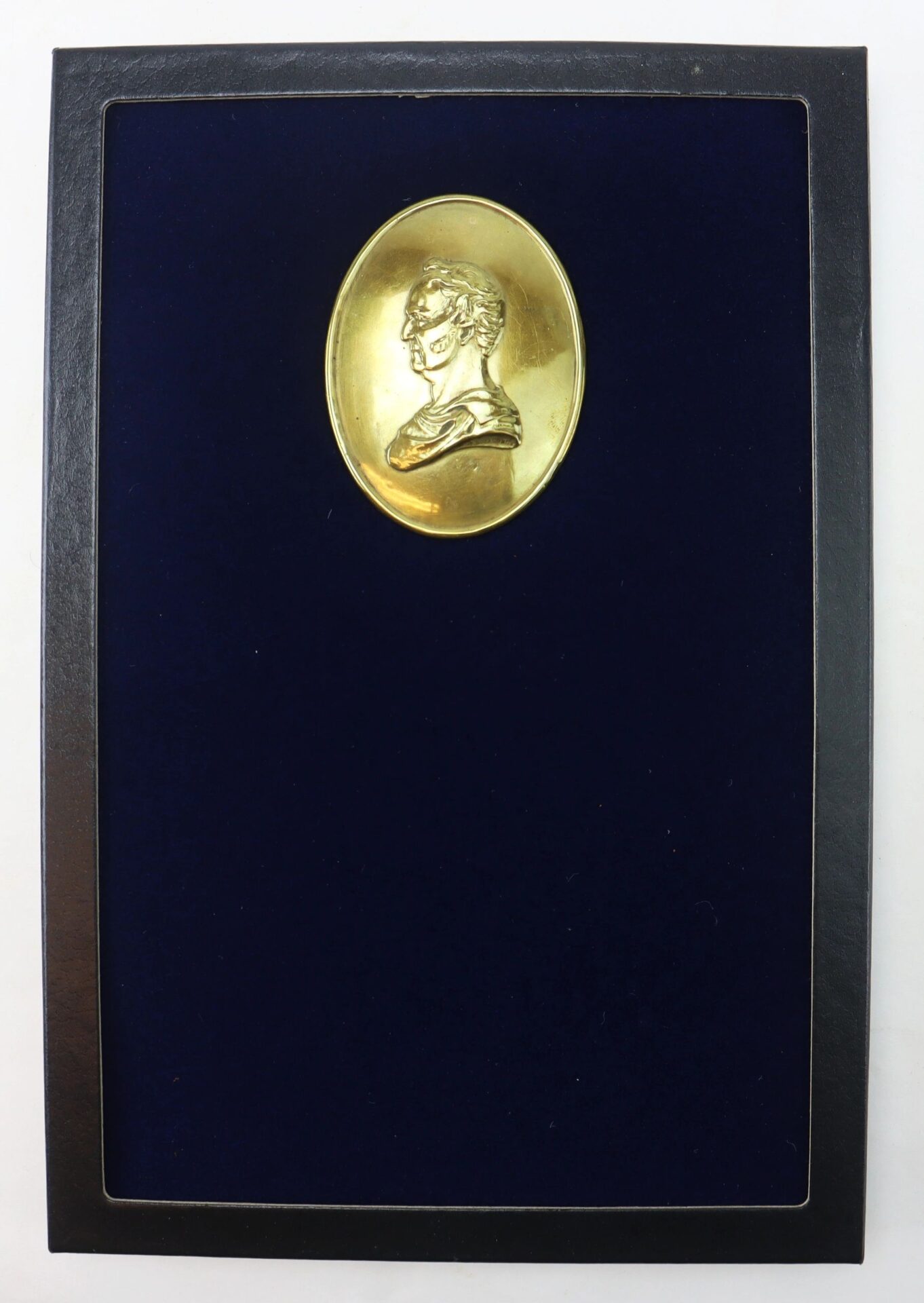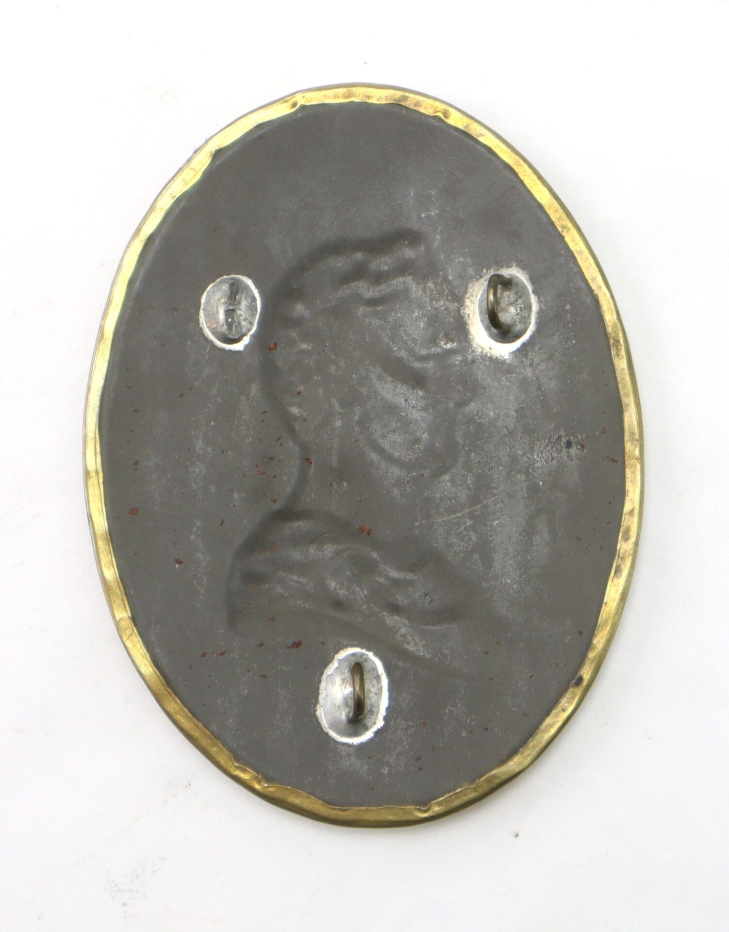 Brass oval, 3.5 x 2.625”, featuring “Roman” profile of General Winfield Scott The “Scott Legion” (20th PA Infantry”) was organized by Col. W.H. Gray and advertised in recruiting broadsides as a regiment staffed by officers who had fought in Mexico, hence the name “Scott’s Legion” for Winfield Scott, the American Mexican War commander in chief. Mustered in late April 1861, this 3-month unit was posted to Harrisburg and then assigned to Patterson’s Army, before mustering out 8/6/1861. Handsome display plate. Scarce. Comes housed in riker display case with blue velvet and descriptive card.