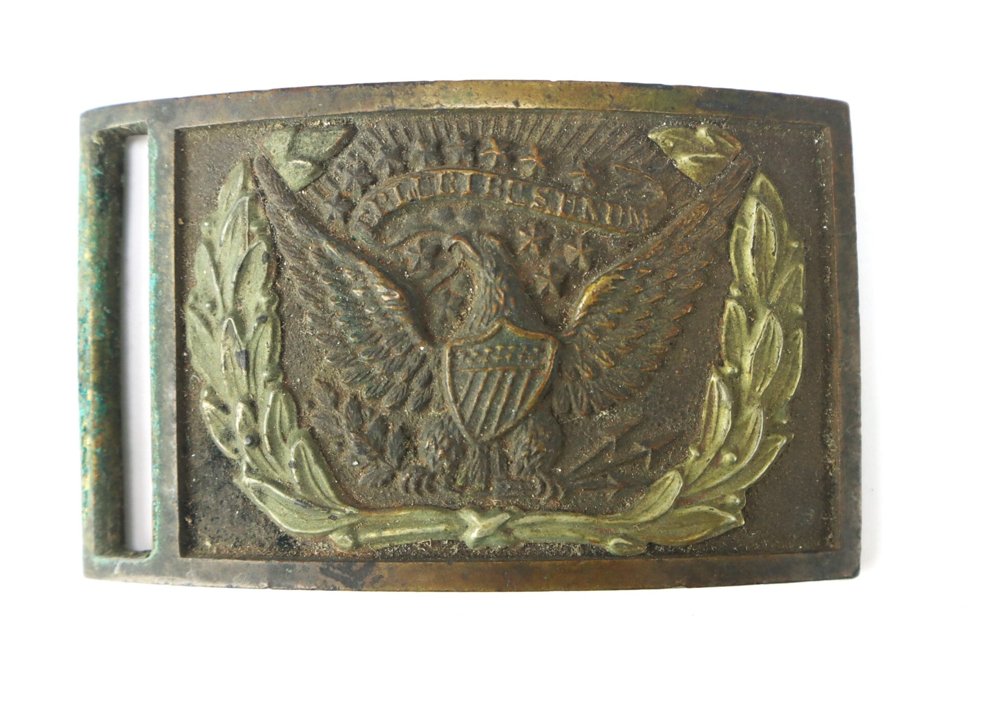 This is the standard U.S. Army Model 1851 rectangular eagle sword belt plate, used by Union soldiers throughout the Civil War. The plate features the classic American eagle with wings displayed, clutching an olive branch and arrows, surrounded by a wreath—symbolizing both peace and war under federal authority.