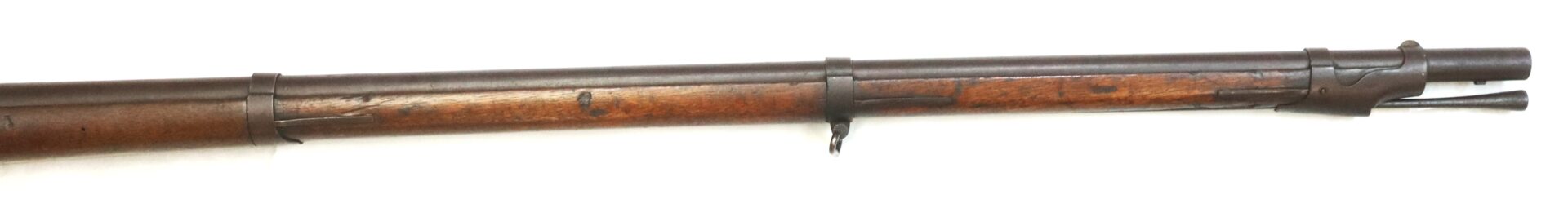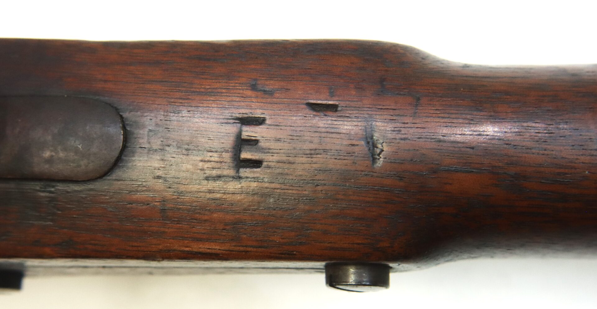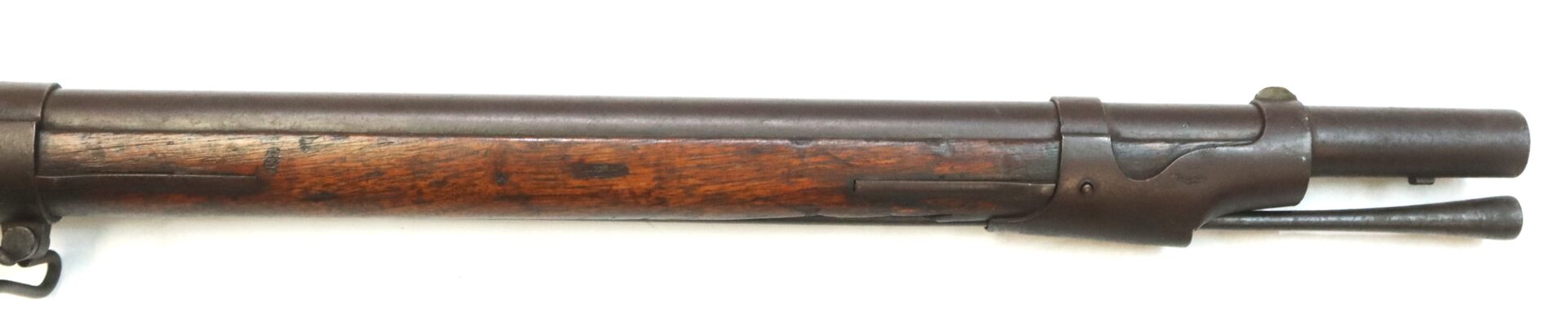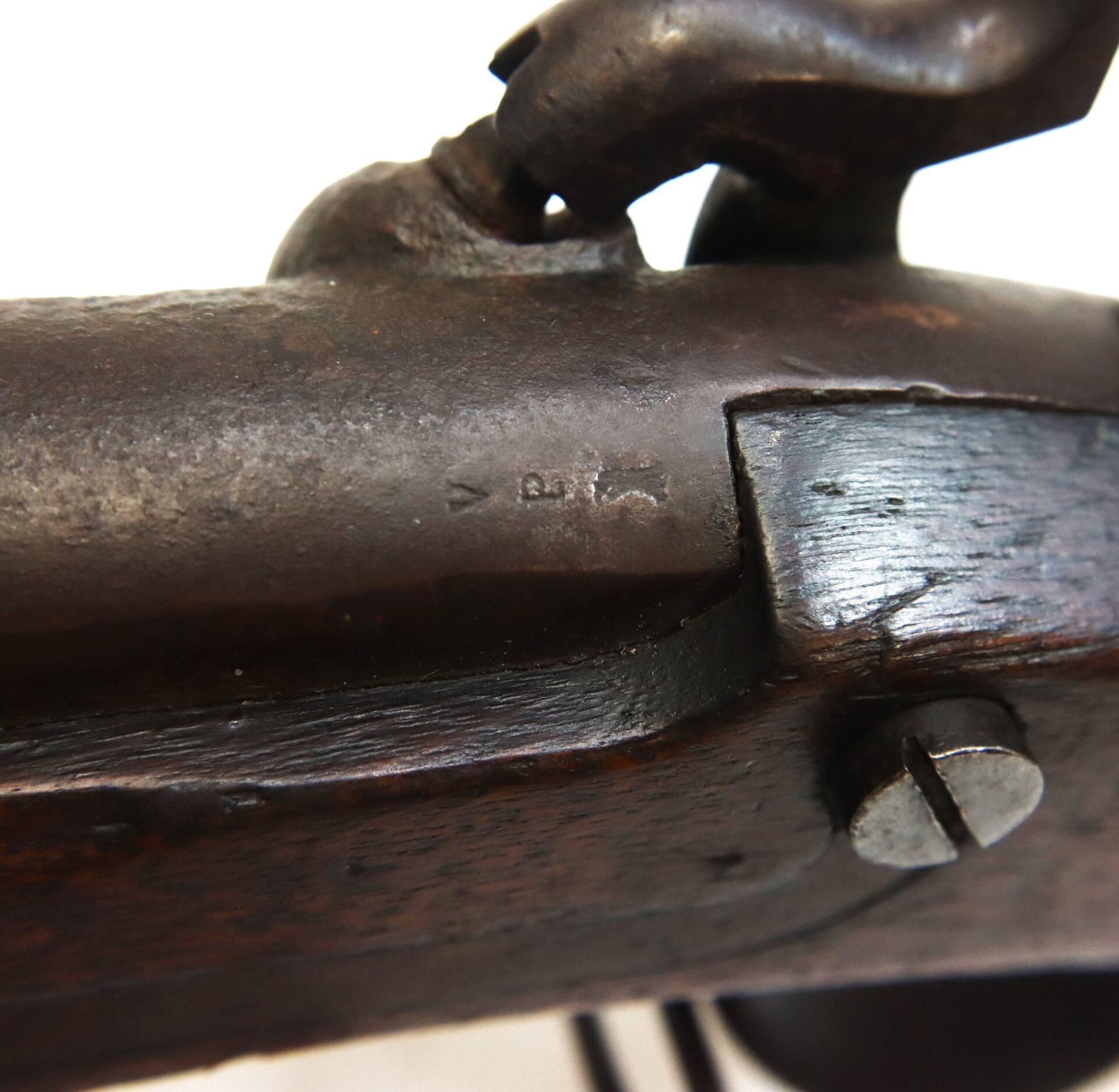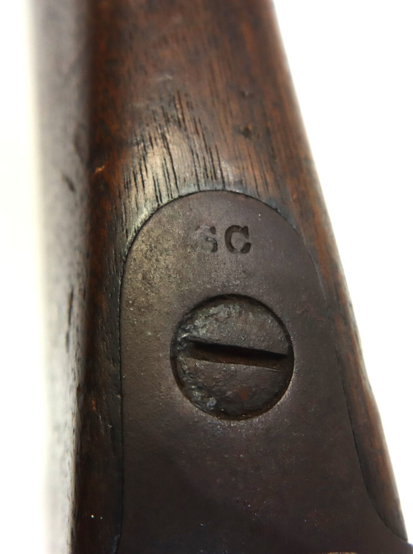 The musket retains a deep dark patina across the metal components and the buttplate is clearly stamped “S.C.” indicating state ownership. Both sling swivels remain intact and the musket retains its trumpet-shaped ramrod. An “E” is carved into the underside of the stock.