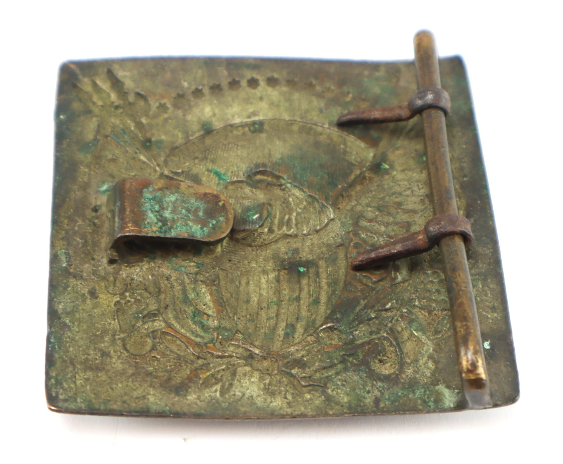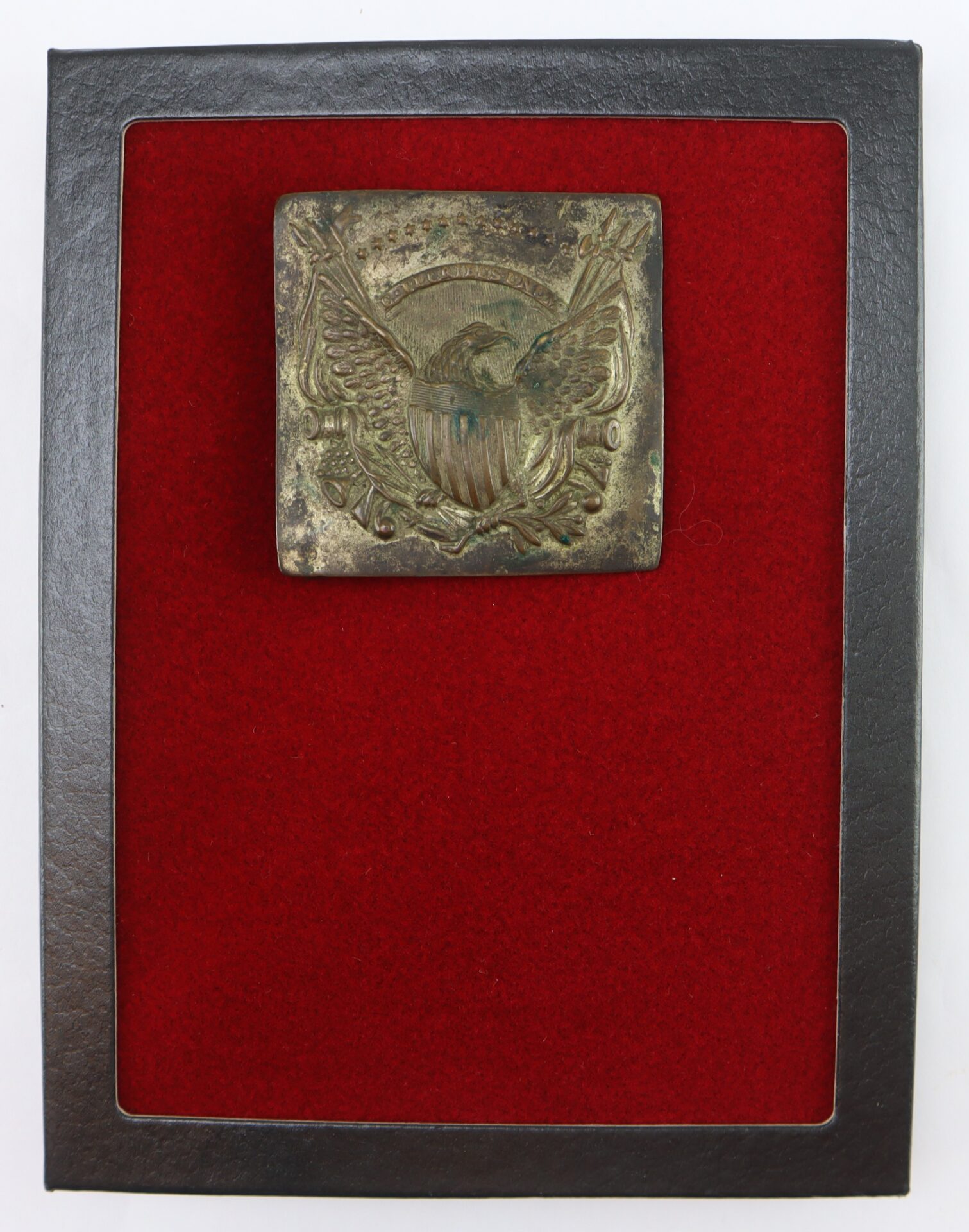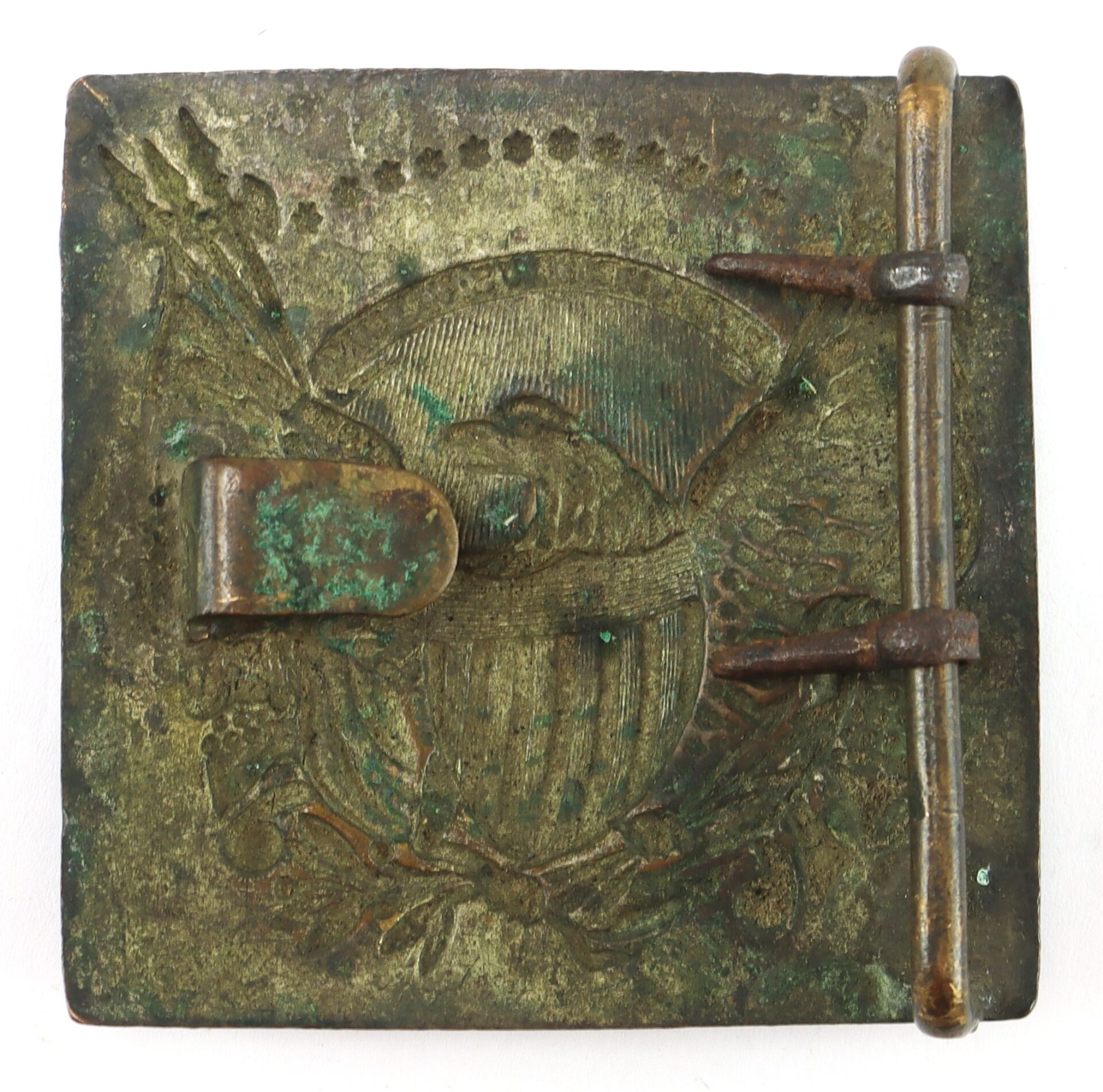 With deeply struck Federal eagle and minor warping from age or period use. The back retains the integral rectangular belt hook and remains structurally sound despite light edge deformation. Patina ranges from medium brown to olive, with solder seams showing undisturbed oxidation. A representative example of the early cast brass militia plate form.