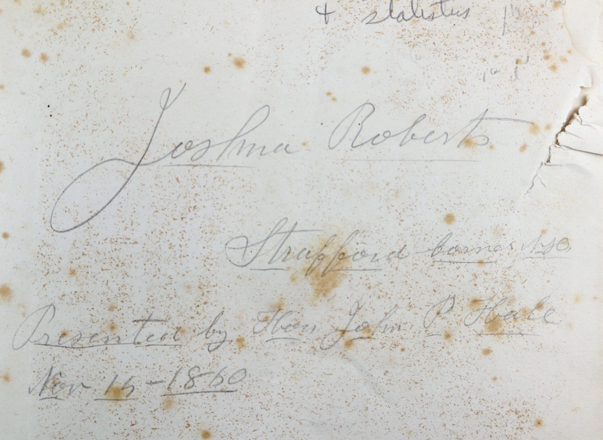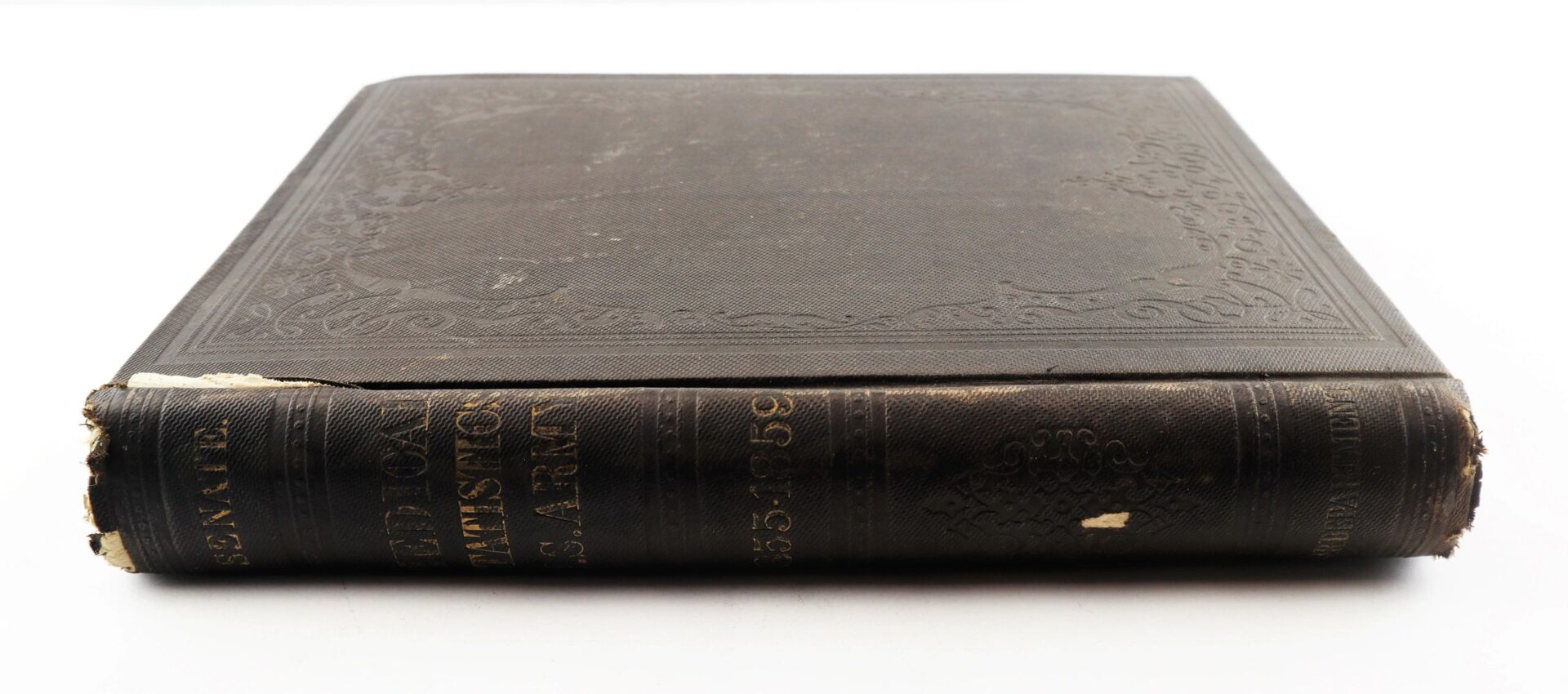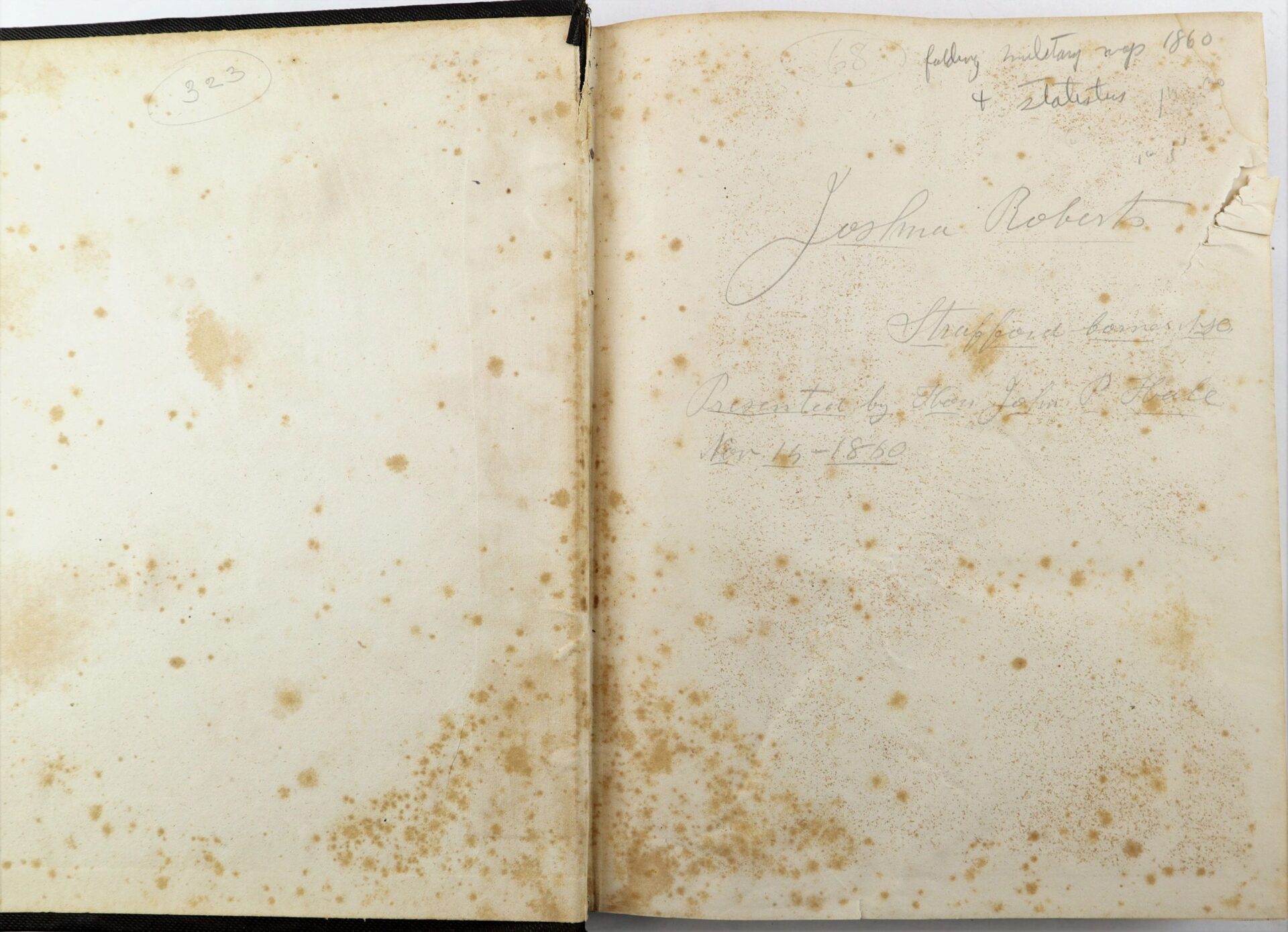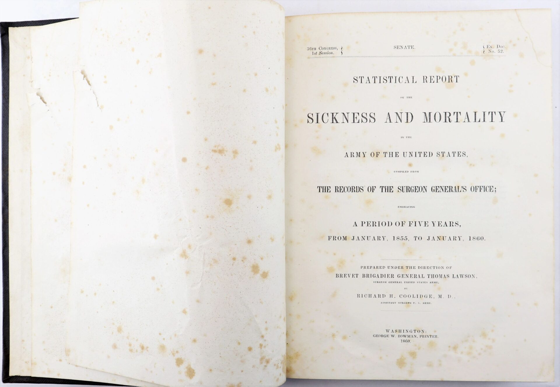 Senate statistical report from the records of the Surgeon General’s Office, published in 1860 and covering a five-year period between January 1855 and January 1860. It contains statistics on diseases and ailments from every military district in the United States. The book is hardbound and in very solid condition save for some edge wear and light foxing. The first page is inscribed in pencil “Presented by Hon. John P. Hale Nov 15, 1860” to a Joshua Roberts. The book measures 12 x 9.5.” John Parker Hale (March 31, 1806 – November 19, 1873) was an American politician and lawyer from New Hampshire. He served in the United States House of Representatives from 1843 to 1845 and in the United States Senate from 1847 to 1853 and again from 1855 to 1865. He began his Congressional career as a Democrat, but helped establish the anti-slavery Free Soil Party and eventually joined the Republican Party. Born in Rochester, New Hampshire, Hale established a legal practice in Dover, New Hampshire after graduating from Bowdoin College. Hale won election to the New Hampshire House of Representatives in 1832 and served as the United States Attorney for New Hampshire under President Andrew Jackson and President Martin Van Buren. He won election to the United States House of Representatives in 1842 but was denied the party’s nomination in 1844 due to his opposition to the annexation of Texas. After losing his seat, he continued to campaign against slavery and won election to the Senate in 1846 as an Independent Democrat. In the Senate, he strongly opposed the Mexican–American War and continued to speak against slavery. Hale helped establish the anti-slavery Free Soil Party and was a candidate for the party’s presidential nomination in 1848, but the 1848 Free Soil Convention instead nominated former President Van Buren. He won the party’s presidential nomination in 1852, receiving 4.9% of the popular vote in the general election. After the passage of the Kansas–Nebraska Act, Hale joined the nascent Republican Party and returned to the Senate. He served until 1865, at which point he accepted an appointment from President Abraham Lincoln to serve as the Minister to Spain. He held that post until he was recalled in April 1869, at which point he retired from public office.
