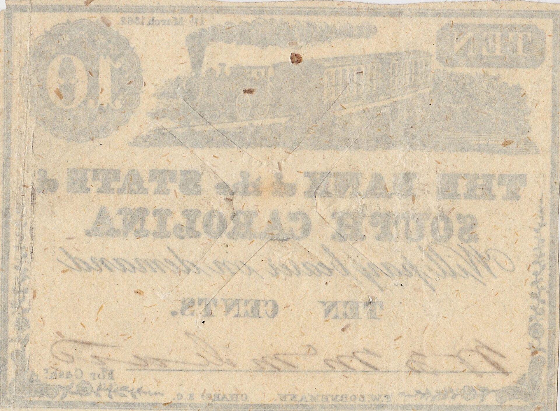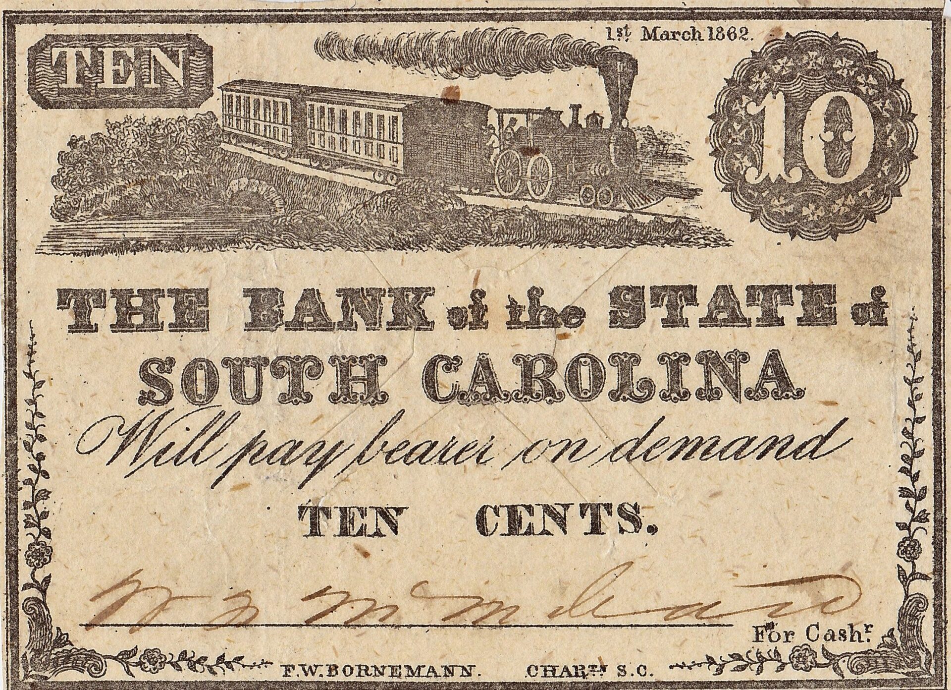 S-483 This SO.10 fractional note features a train crossing a stone bridge in the center. The date of March 1, 1862 is printed in the upper right corner. The printer’s name, E.W. Bornemann, Charleston is printed along the bottom center. Authentic cancelled note redeemed by the state in 1880.  Deaccessioned from the collection of the South Carolina Department of Archives and History under a provision of the General Assembly.  Accompanied by history on its discovery. Authentic Bank Notes of The Bank of the State of South Carolina Chartered on 19 December 1812 by Act 2021 of the General Assembly and capitalized with the assets of the state treasury, the Bank of the State of South Carolina provided a stable currency for the state through much of the bank’s fifty six year history. Ruined by the general economic collapse at the end of the Civil War, the bank was formally closed by Act 17 of the General Assembly passed on 15 September 1868. The act closing the bank provided that notes issued before December 20, 1860, were considered legitimate obligations of the state government and to be exchanged for twenty year state bonds. Over $1.1 million dollars in pre-secession currency were turned in and destroyed by October of 1869. Currency issued after secession were worthless until the post-Reconstruction legislature passed an Act 135 on 24 December 1879 that provided that any outstanding bank notes could be exchanged for consolidated bonds at 50% value.