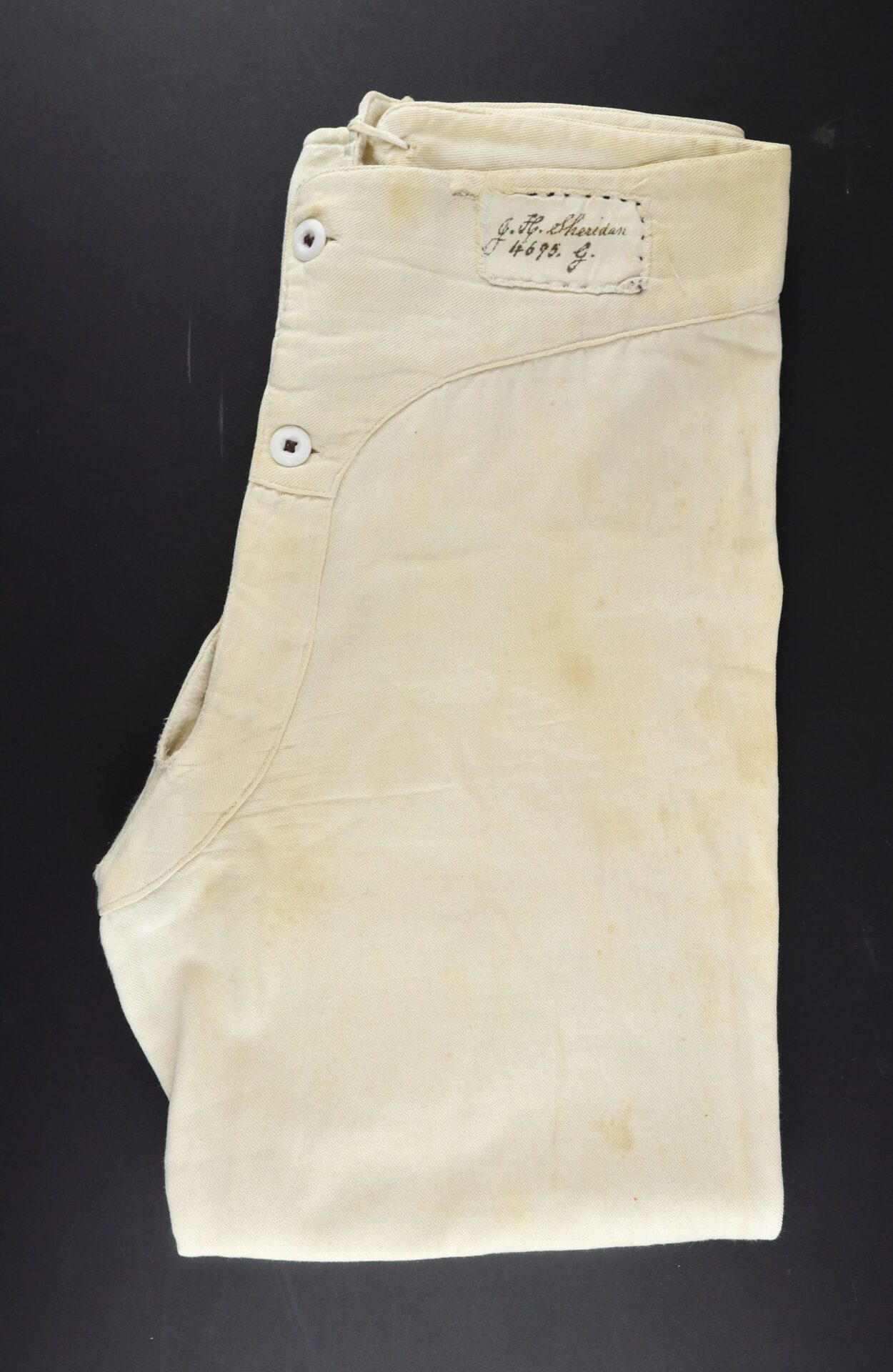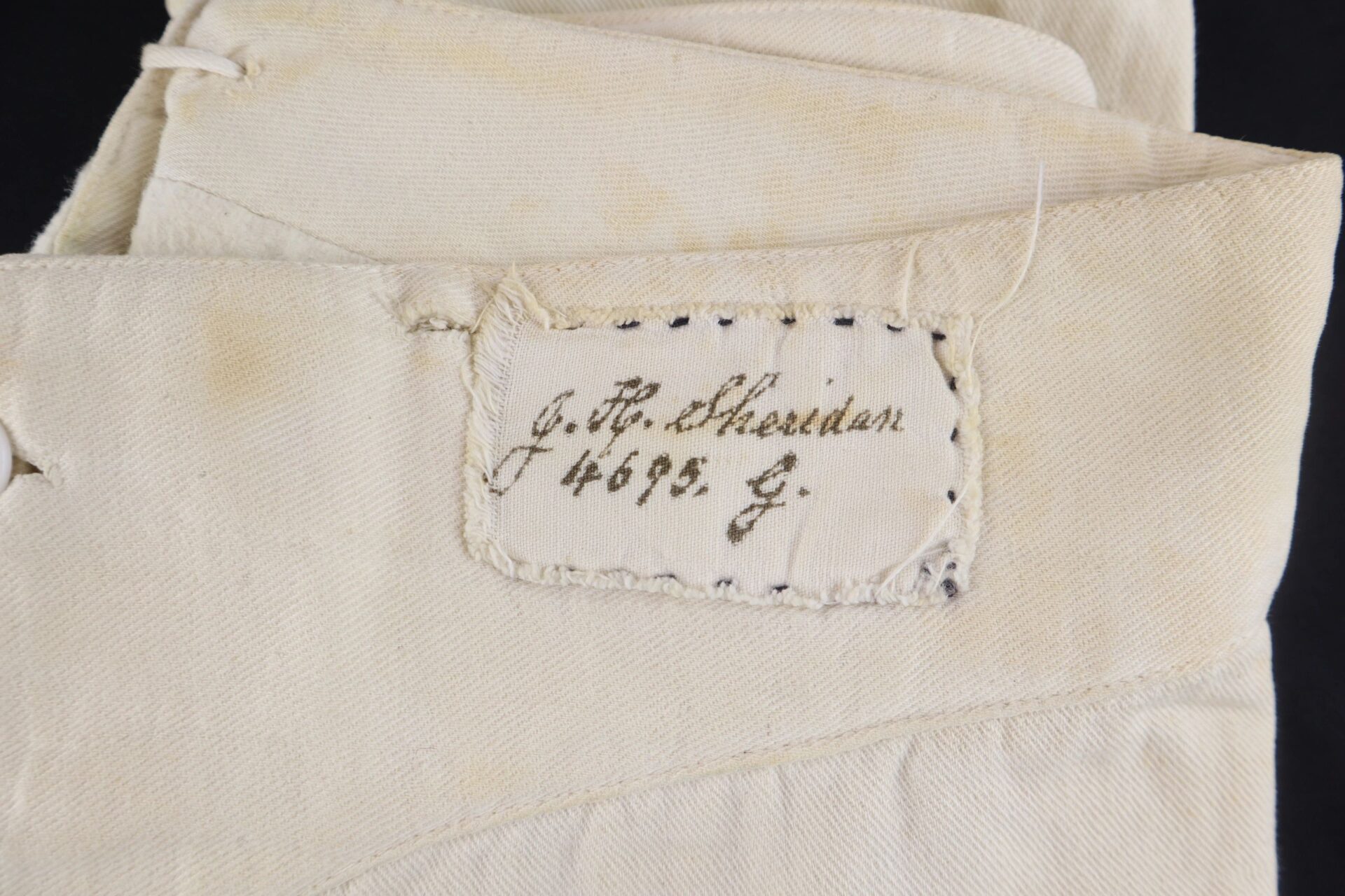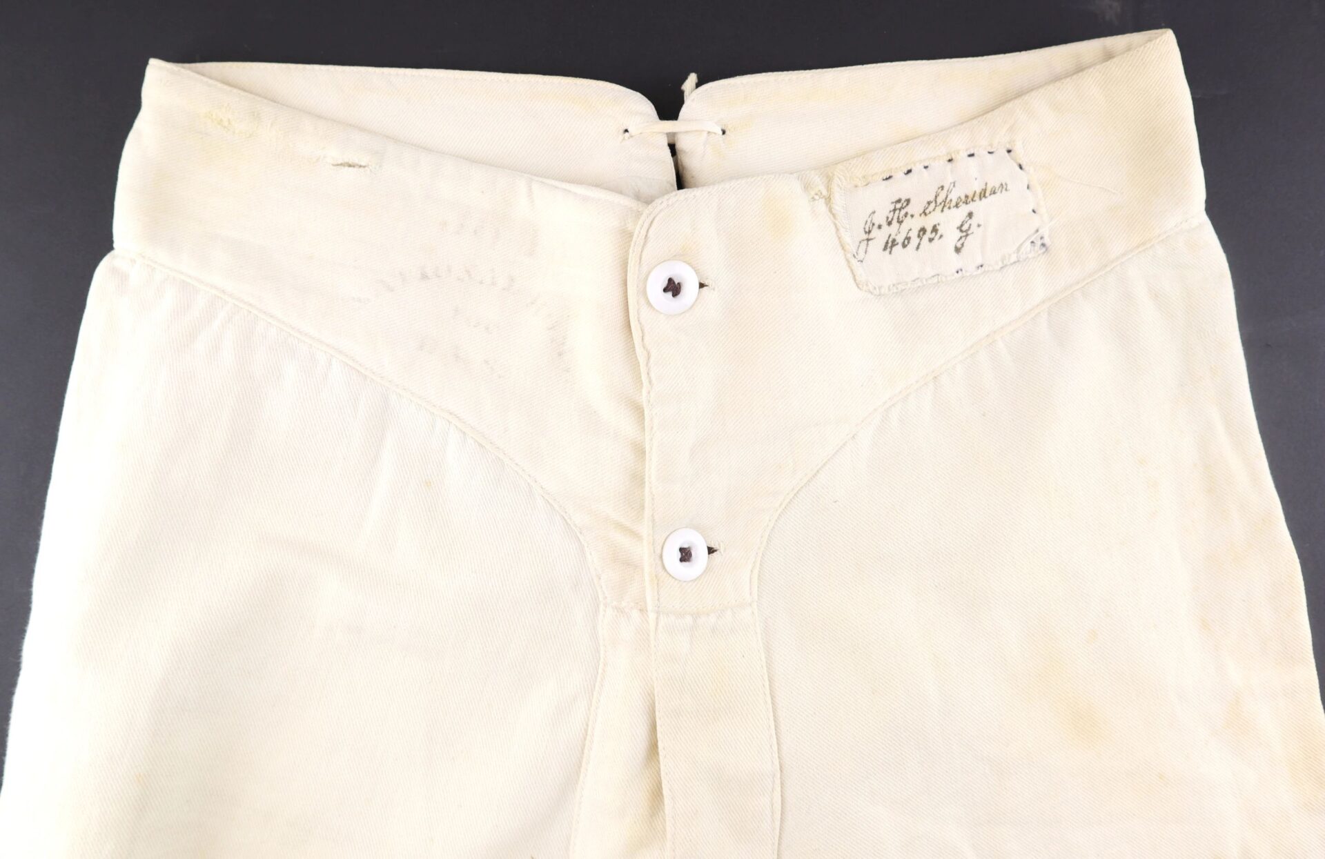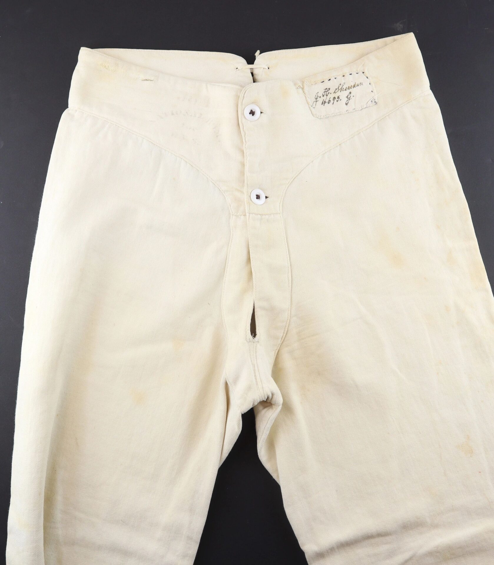 U.S. Army Drawers Identified to John H. Sheridan 118th Pennsylvania “Corn Exchange Regiment” – Inventory Number: UNI 113 / SOLD One of the rarest Civil War garments is the U.S. Army issue under drawers. This pair was worn by Corporal John H. Sheridan of the 118th Pennsylvania Infantry “Corn Exchange Regiment,” which famously suffered extreme casualties at the Battle of Shepherdstown due to poor training and faulty muskets. It was at Shepherdstown on September 20, 1862 that John H. Sheridan was wounded. His canton flannel drawers have a tie back with two white porcelain buttons at the front. They have a sewn cotton tag with “J. H. Sheridan 4695 g.” in ink, as well as the laundry stamp of the “National Home of D.V.S (disabled volunteer soldiers.) They measure 38” from waist to cuff and are in very good condition. An extremely scarce Civil War garment. John H. Sheridan Residence Philadelphia PA; Enlisted on 8/4/1862 as a Corporal. On 8/4/1862 he mustered into “B” Co. PA 118th Infantry. Wounded 9/20/1862 Shepherdstown, WV. Inventory Number: UNI 113 / SOLD