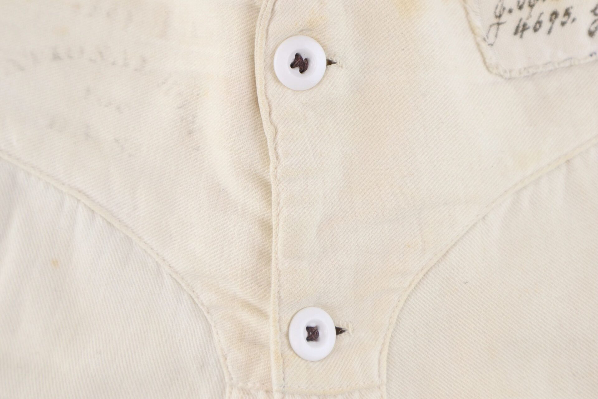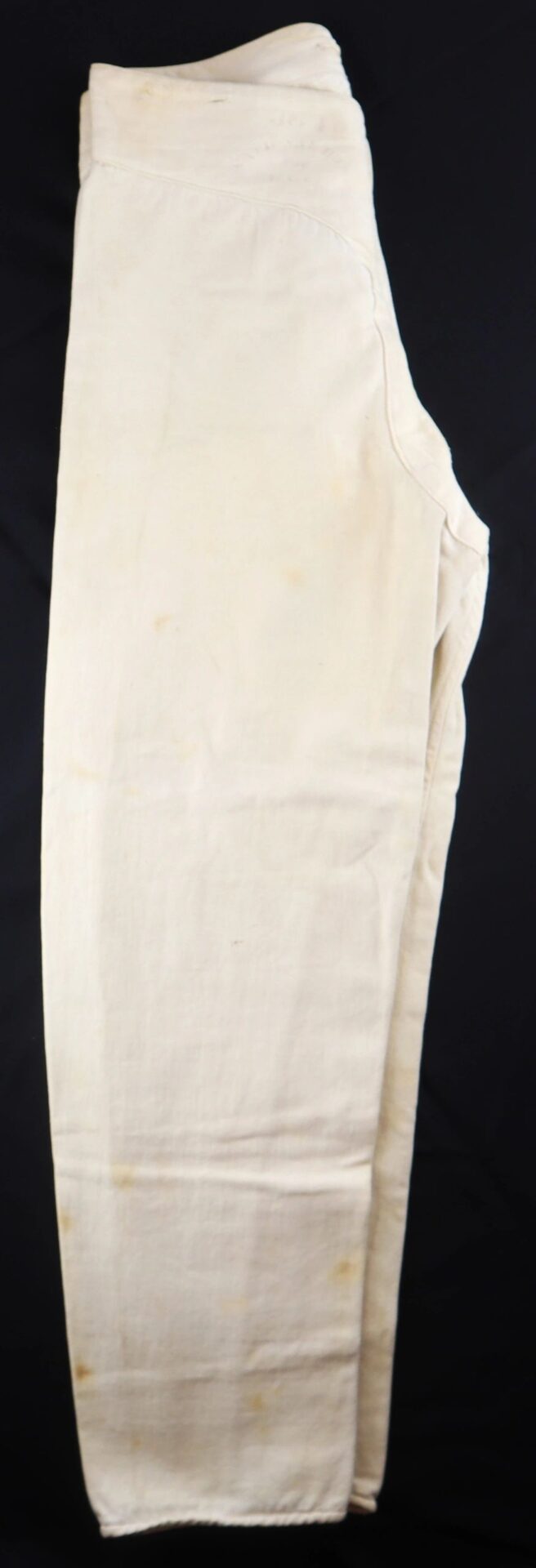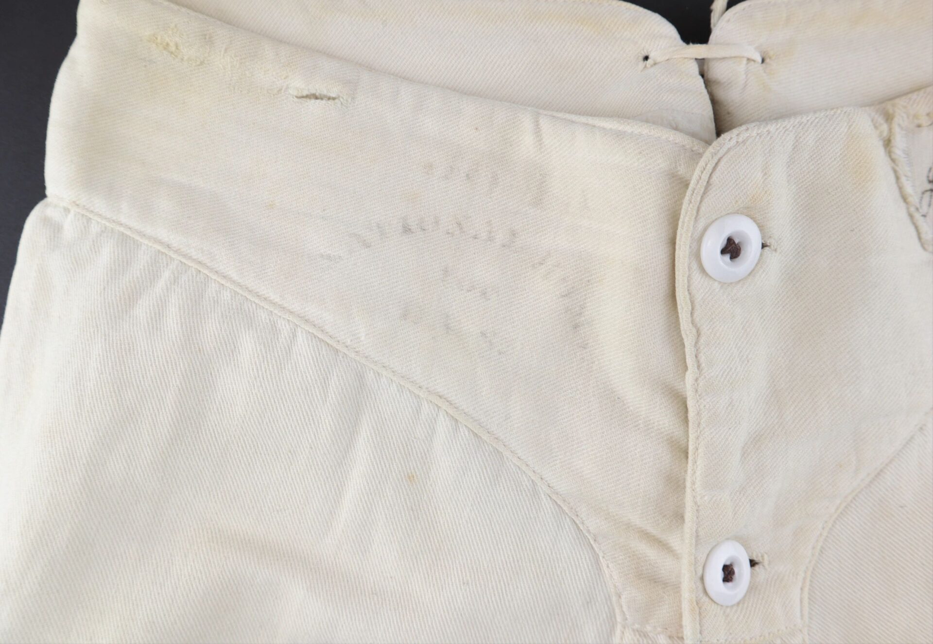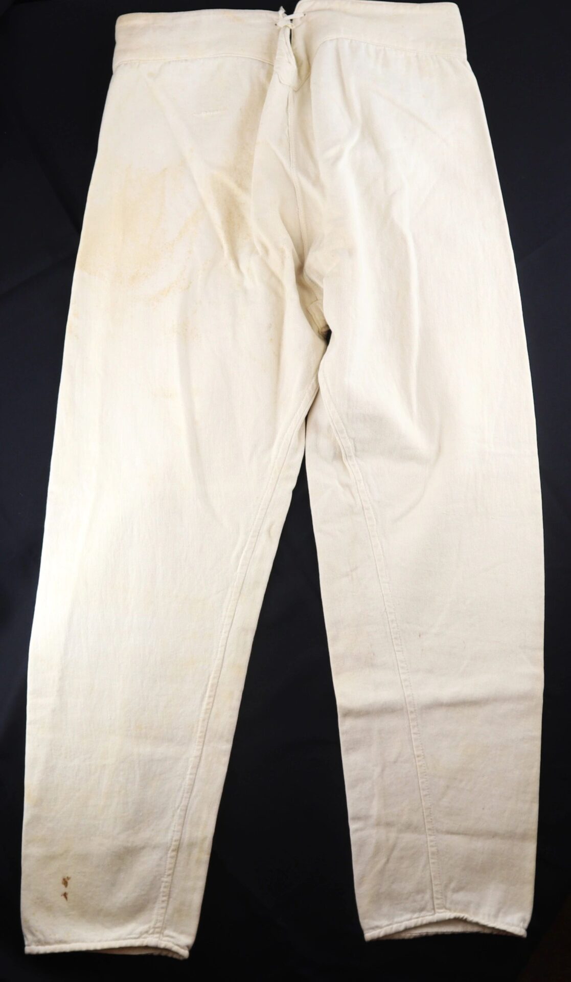 U.S. Army Drawers Identified to John H. Sheridan 118th Pennsylvania “Corn Exchange Regiment” – Inventory Number: UNI 113 / SOLD One of the rarest Civil War garments is the U.S. Army issue under drawers. This pair was worn by Corporal John H. Sheridan of the 118th Pennsylvania Infantry “Corn Exchange Regiment,” which famously suffered extreme casualties at the Battle of Shepherdstown due to poor training and faulty muskets. It was at Shepherdstown on September 20, 1862 that John H. Sheridan was wounded. His canton flannel drawers have a tie back with two white porcelain buttons at the front. They have a sewn cotton tag with “J. H. Sheridan 4695 g.” in ink, as well as the laundry stamp of the “National Home of D.V.S (disabled volunteer soldiers.) They measure 38” from waist to cuff and are in very good condition. An extremely scarce Civil War garment. John H. Sheridan Residence Philadelphia PA; Enlisted on 8/4/1862 as a Corporal. On 8/4/1862 he mustered into “B” Co. PA 118th Infantry. Wounded 9/20/1862 Shepherdstown, WV. Inventory Number: UNI 113 / SOLD