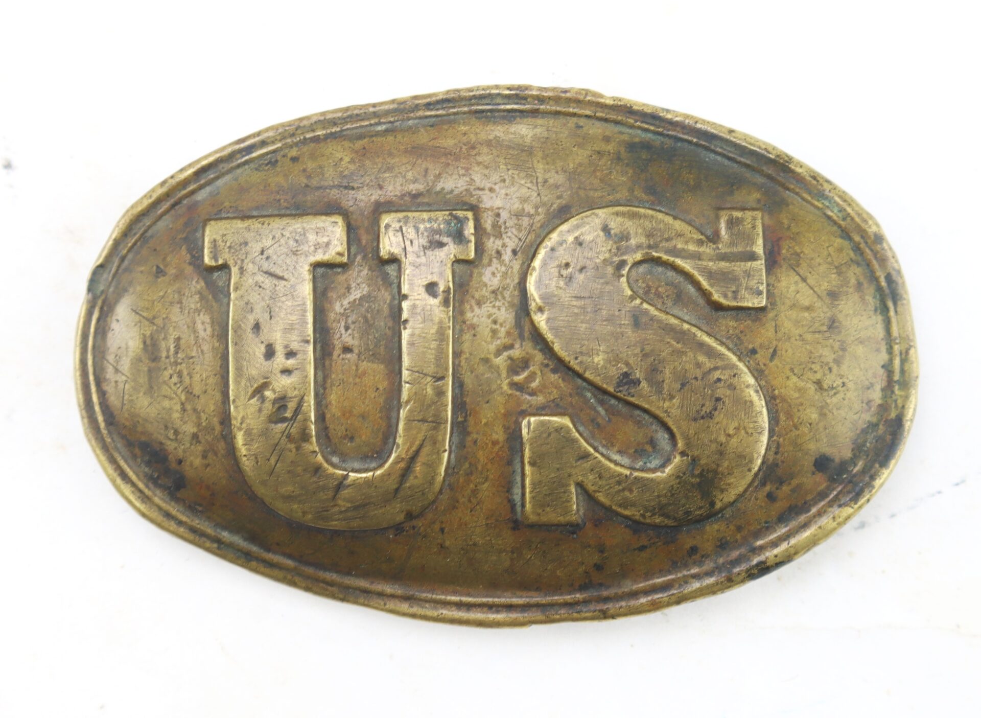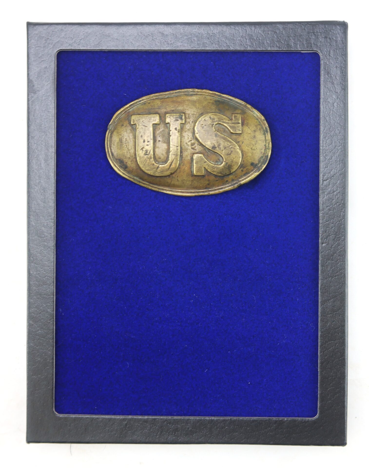 Outstanding non-excavated example of a regulation Model 1839 U.S. enlisted waist belt plate, featuring the bold raised “U.S.” oval motif on a rolled brass face with attractive, even patina. The lead-filled back retains its full complement of arrowhead style belt hooks and tongue. A superb representative of the standard Federal issue plate worn by Union soldiers throughout the war, this example remains well-preserved, showing only light age toning from storage.